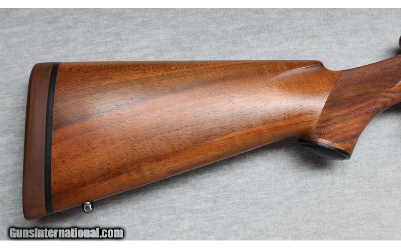 Description: Excellent condition, light wear and handling marks. Well executed sporterized Winchester 1917 rifle. 24" Heavy barrel chambered for the powerful .416 Rigby cartridge. Outstanding wood, fine checkering, contrasting forend tip, RH cheek rest. Smooth action and crisp trigger pull, an excellent choice for hunting big game animals. .416 Rigby SOLD Chambers: Bolt action Metal Condition: Excellent Wood Condition: Excellent Bore Condition: Bright Barrels: 24 Triggers: Factory Stock Dimensions: 13 1/2" LOP Fore End: Checkered Butt Pad: Decelerator pad Sights: Scope mounting bases installed Item Location: La Vista, NE |