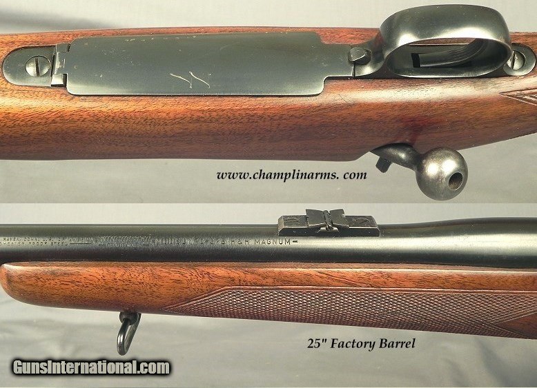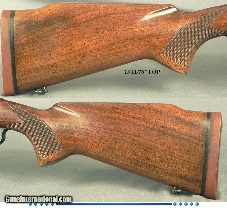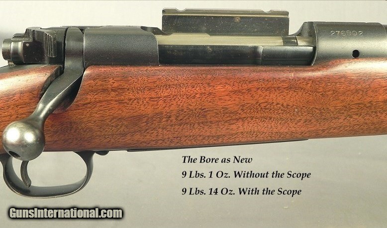 Description: #276902, Winchester Model 70 Pre-64 in 375 H&H Made in 1953 that remains almost like new and is in excellent & original condition except a Griffin & Howe side mount added, 25" barrel with the correct Winchester 2 blade folding sporting rear sight, Factory front sight hood, Machined integral front ramp, A double lever quick detachable Griffin & Howe side mount with 1" rings, An early Leupold Mountaineer 4x scope with a dot reticle, Standard 3 position safety, Standard Model 70 hinged floorplate, Slight monte carlo comb, Standard point pattern checkering, Sling swivels, 13 11/16" lop over 7/8" factory pad, 9 lbs. 1 oz. without the scope and 9 lbs. 14 oz. with it mounted, The original barrel blue is 98%, The receiver blue is 99%, The floorplate & trigger guard is 92%, The bolt knob is 60%, The original wood finish at 95%, The checkering is 99%, The bore is absolutely as new. This is a very honest and nice Pre-64 in 375 H&H that has not been shot a great deal and remains a super solid Model 70. By going over this piece I doubt if it has shot a box or two of cartridges. SOLD Curio/Relic: Yes |