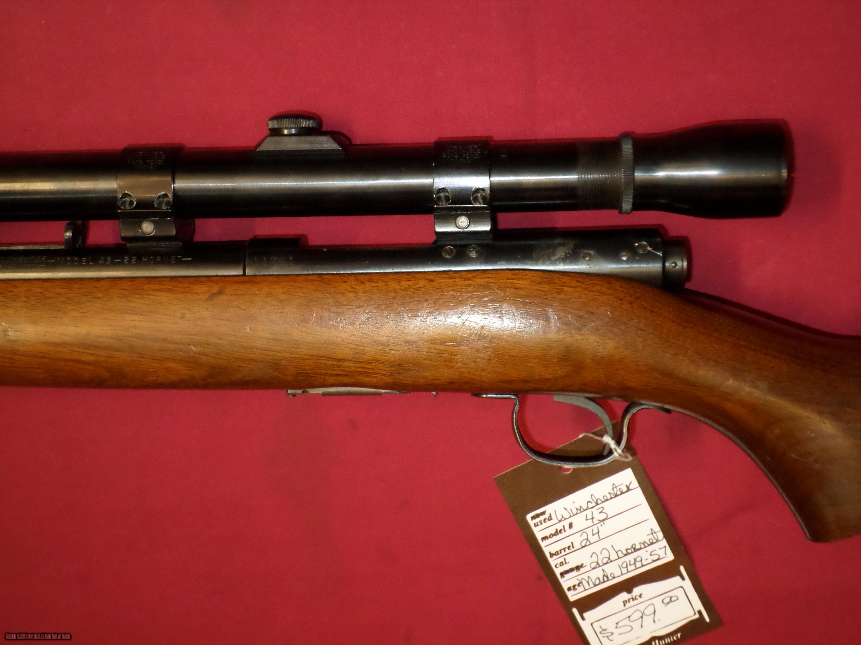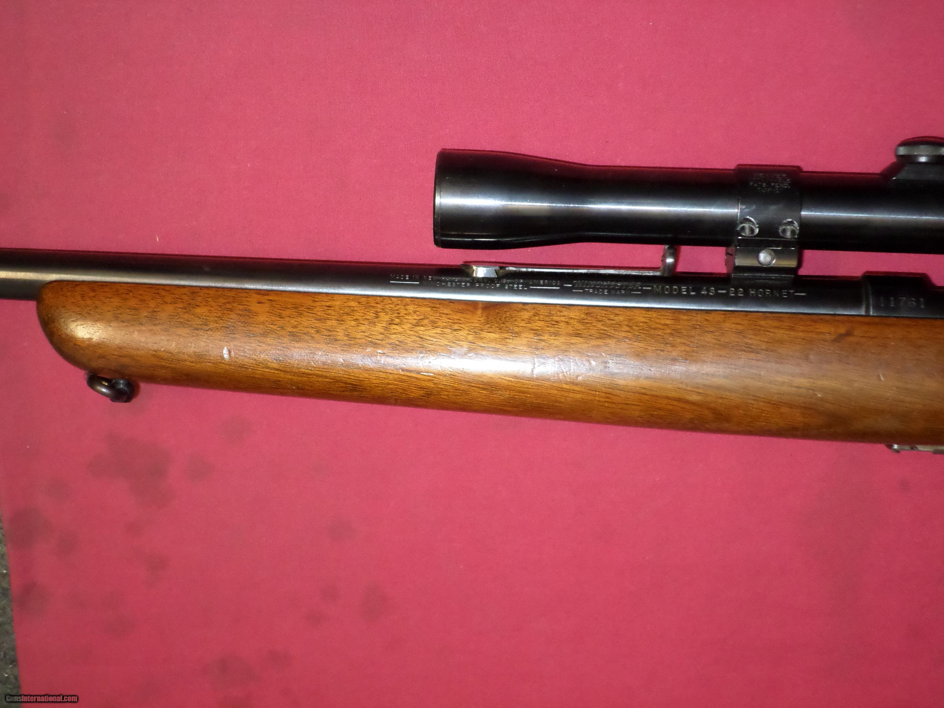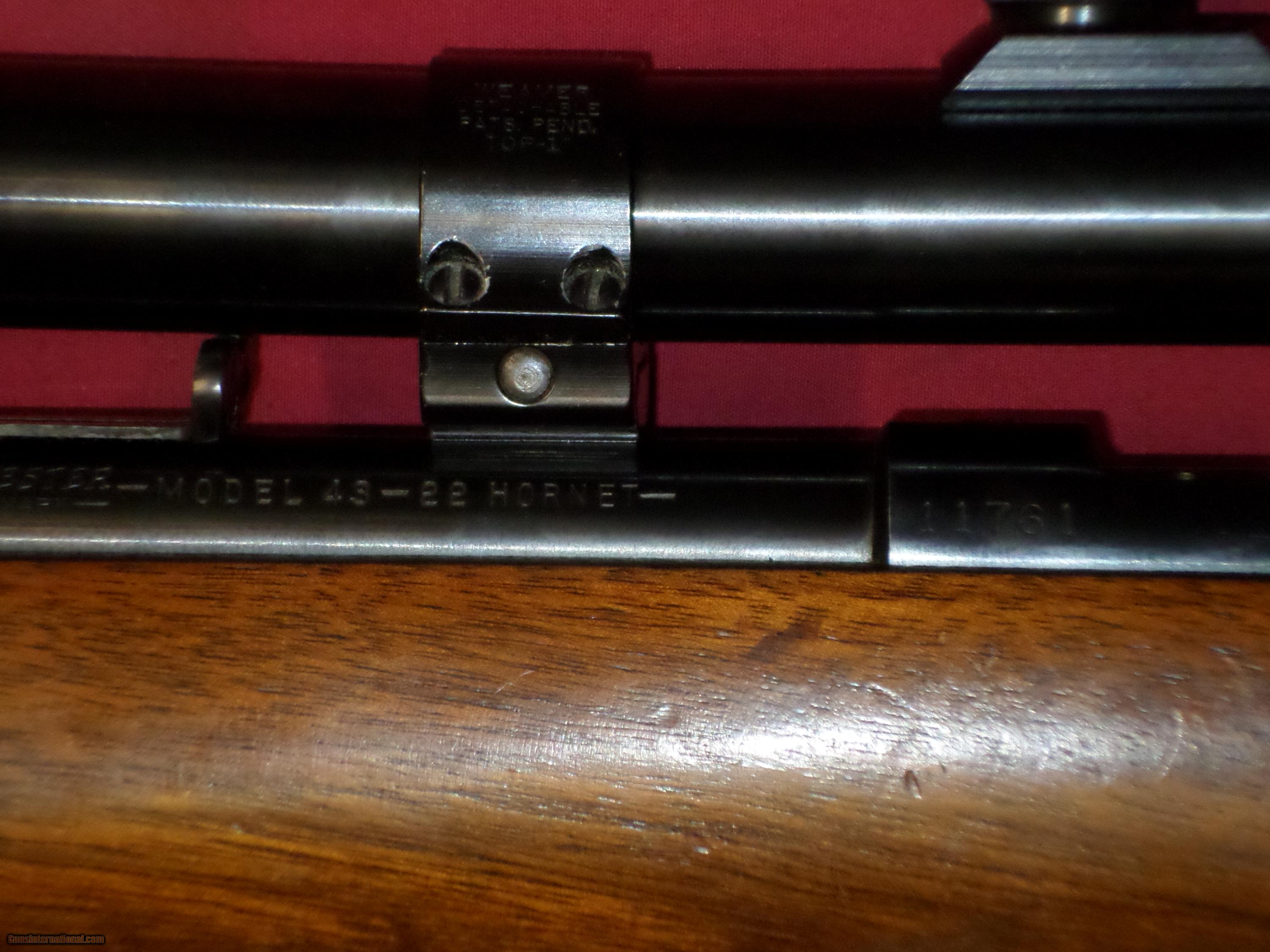 Description: SOLD For sale, Winchester 43 in .22 Hornet, 24" bbl, Weaver K6 mounted. Very good condition, with a few extra holes. Circa 1949-1954 SOLD To see more of our inventory, visit deerhunterguns,com We accept MC, Visa and Discover, no AmEx. No Sales to California. Like us on Facebook: Deer Hunter Guns SOLD |