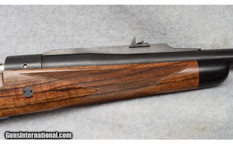 Description: SOLD Caliber Info: .450 Rigby. Metal Condition: Excellent. Wood Condition: Excellent. Bore Condition: Bright shiny with crisp rifling. Barrels: 24 Stock: Checkered walnut. Fore End: Checkered walnut. Butt Pad: Rubber recoil pad. Weight: 8-lbs., 14-ozs. Sights: Front bead, 2-postion rear blades. Item Location: Fort Worth, TX |