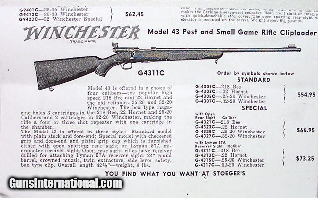 Description: Winchester Model 43; SN 4849; 25-20 caliber; Deluxe (Special) ORIGINAL Lyman 57A sight; 98% OVERALL CONDITION; FFL/C&R required for shipping; All items shipped fully insured Priority Mail- -Hand guns $30 --Long guns $45-- Spurs $30-- Knives, Swords & Sabers $30 (Texas residents please add 6.75% sales tax); return policy: three days inspection from the date the item is received; full refund of shipping both ways ONLY IF THE ITEM IS MISREPRESENTED. Note: International sales only as laws permit. Will ship C&R eligible items to C&R license. Antiques shipped without license to anyone EXCEPT New Jersey and City of New York where a FFL is required. SOLD Curio/Relic: Yes Manufacturer: Winchester Model: 43 Serial Number: 4849 |