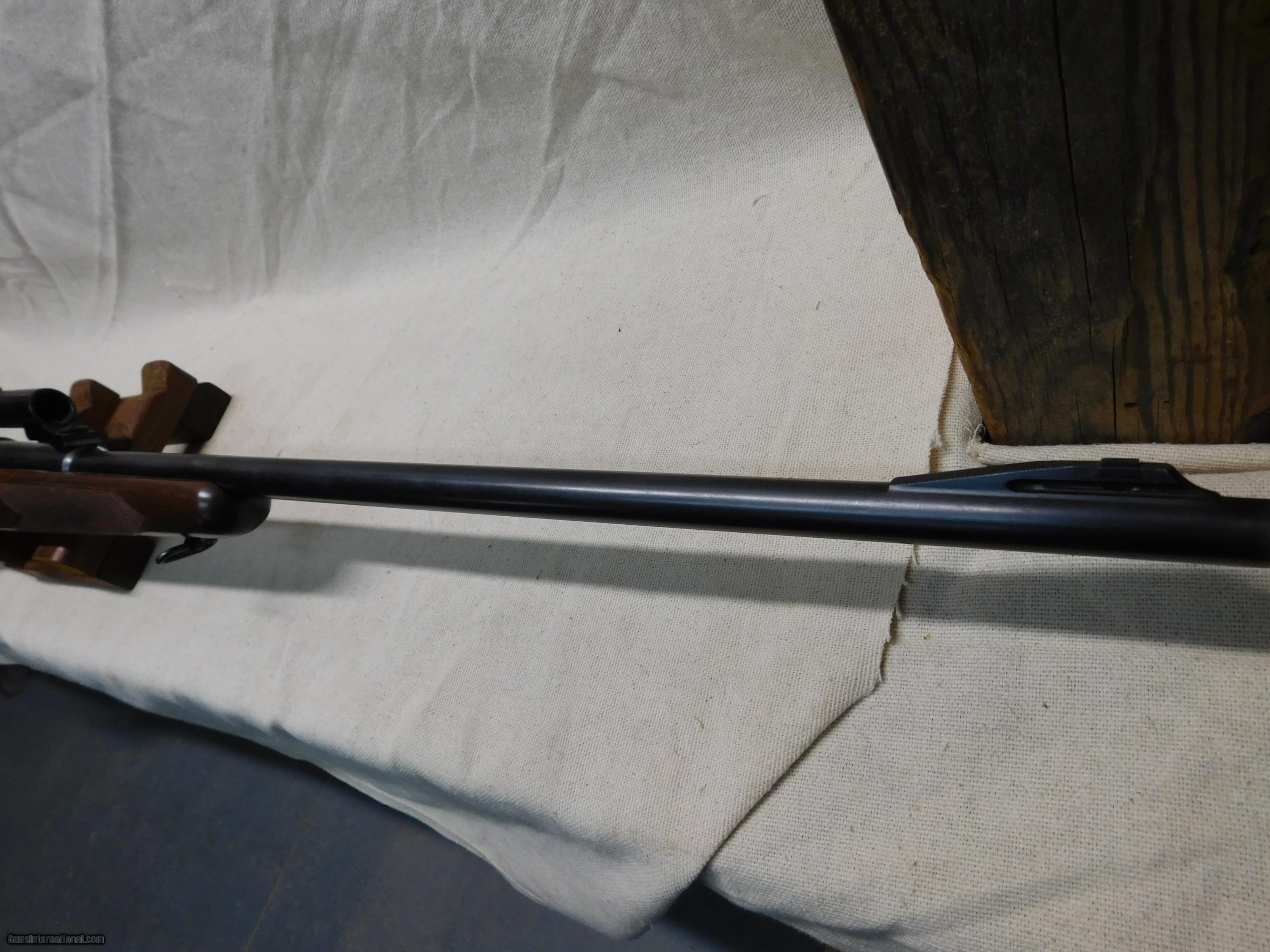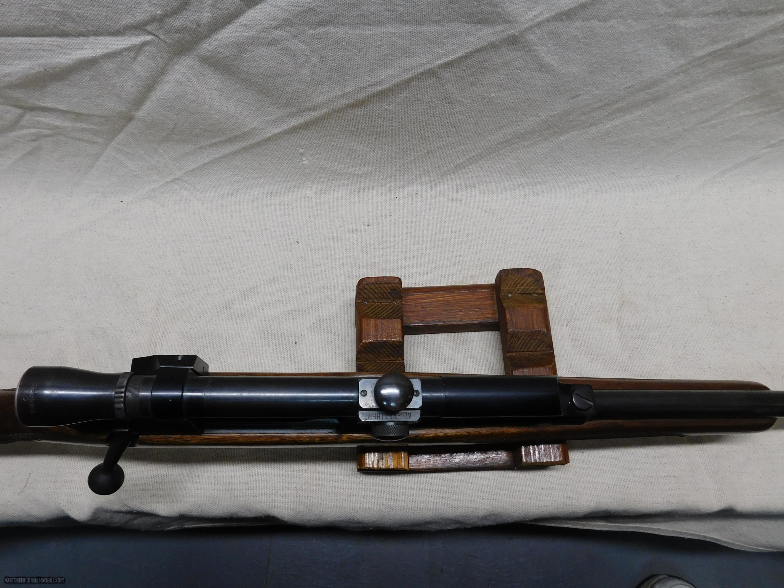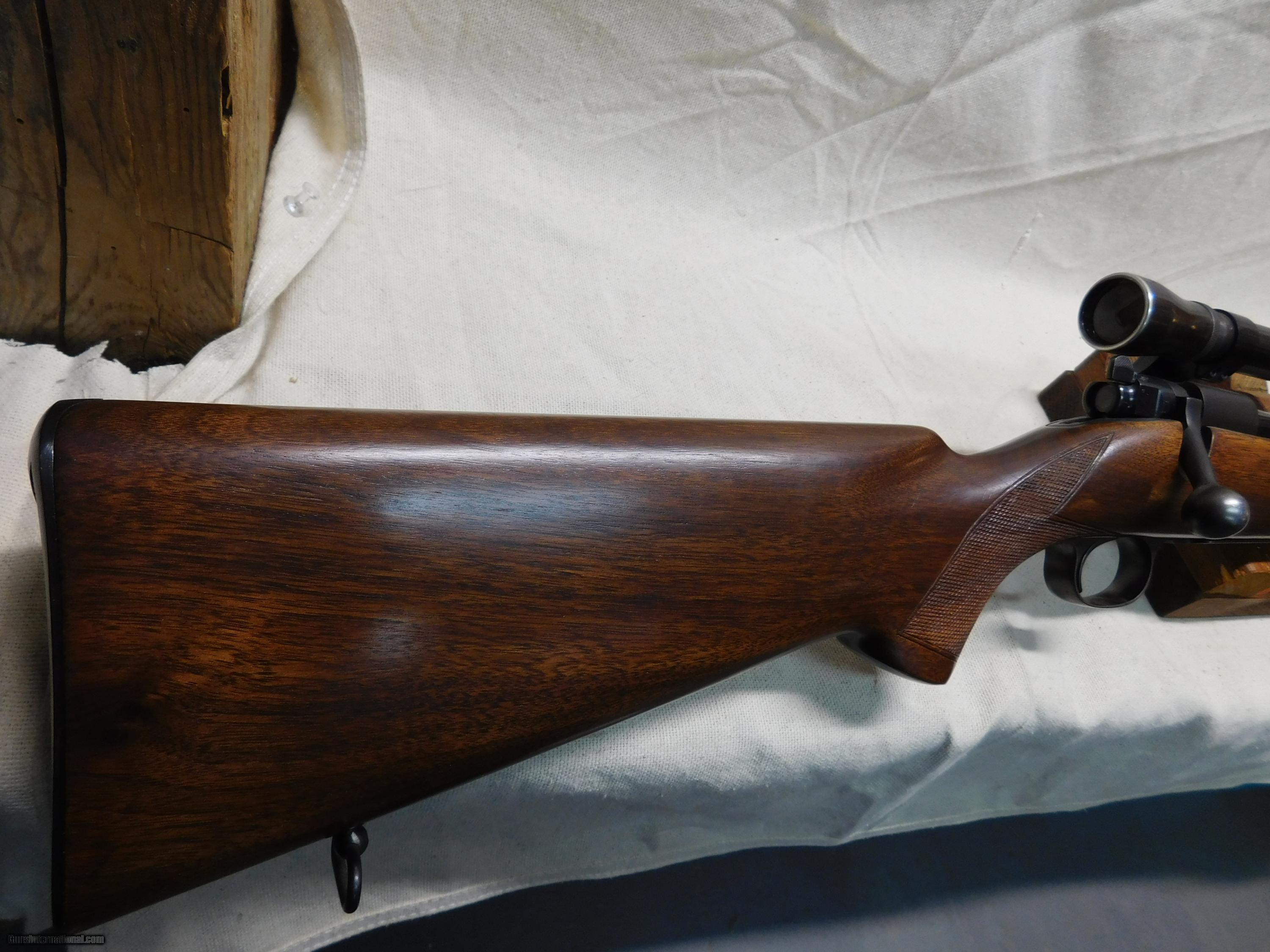 Description: Winchester M70 Pre-64,PreWar,300 H&H,26"Barrel,Barrel and reciever Bluing very Good about 92%,There are some scratches on Barrel,Floorplate shows usual edge wear,Stock is professionally refinished,Lyman Alaskan 2-1\2 X Scope in Stith no drill mounts,Front sight filler to accomodate Scope,there are 2 tapped Holes in rear bridge and what I believe to be a factory notch on left side of Stock for a reciever sight,Bright Bore,Circa 1938. SOLD Manufacturer: Winchester Model: 70 pre-64 Serial Number: 13236 Caliber Info: 300 H&H |