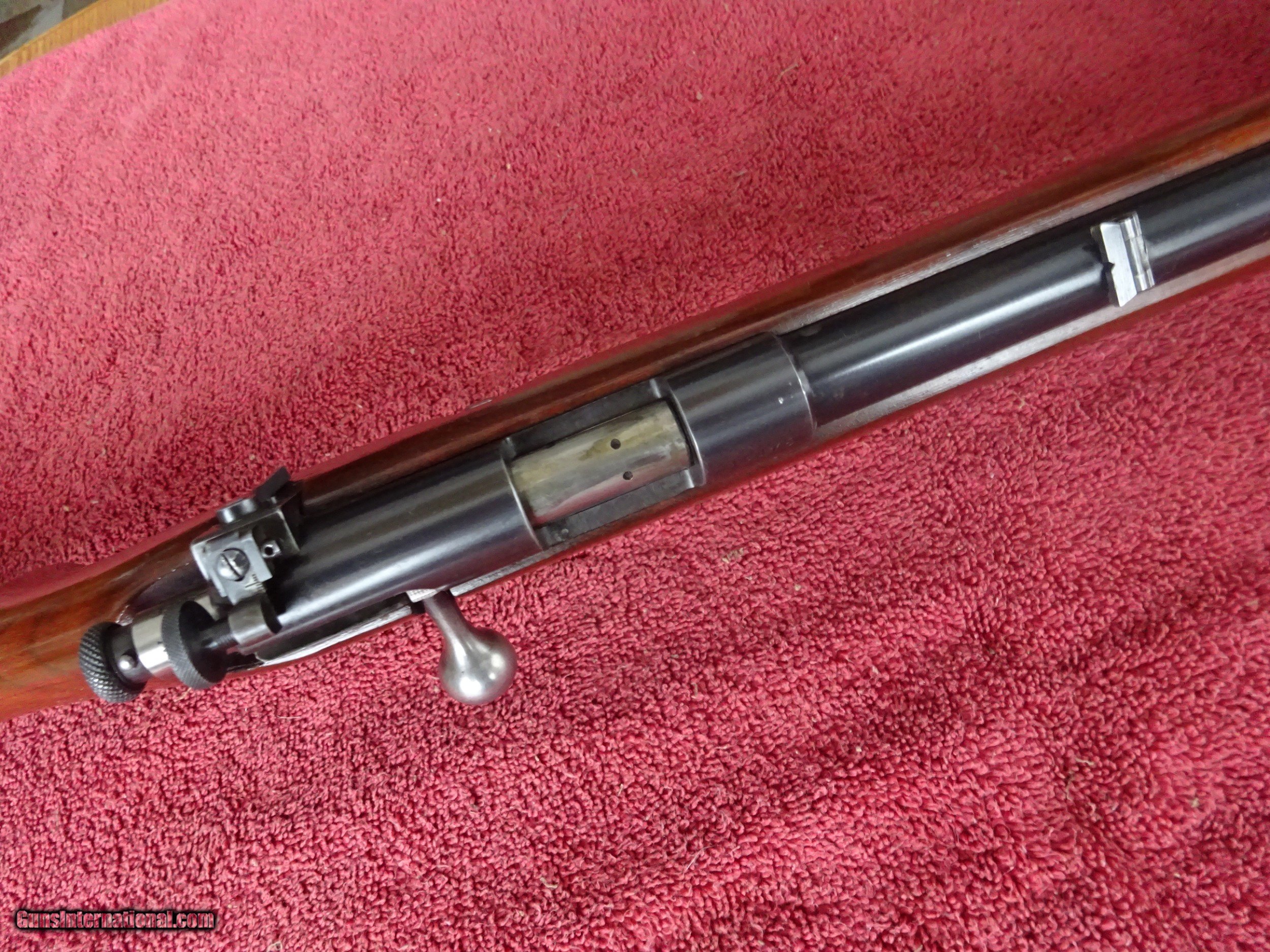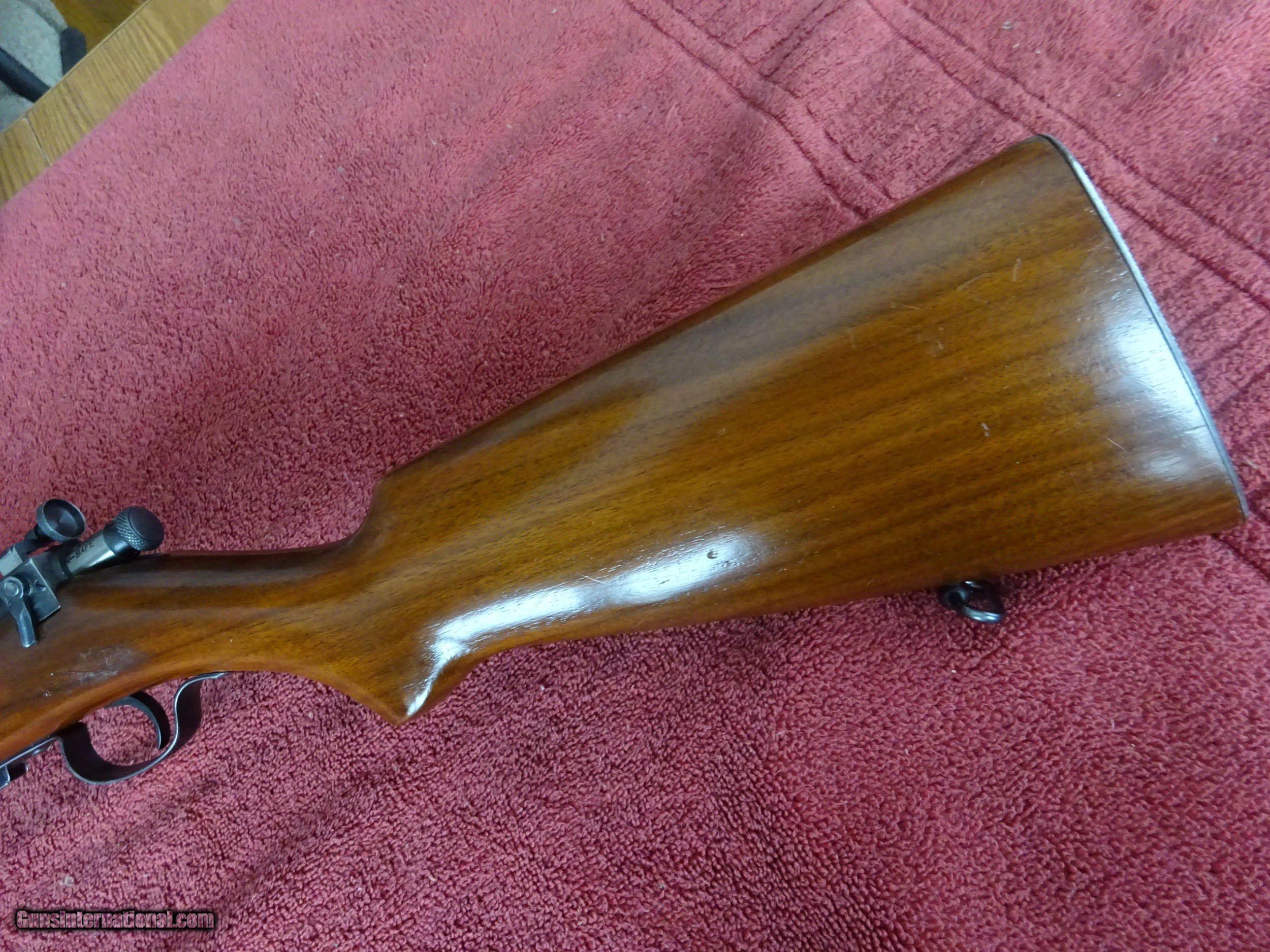 Description: WINCHESTER MODEL 57, 22 L.R. TARGET, 22" BARREL, VERY GOOD BLUE, MIRROR PERFECT BORE, FIXED FRONT SIGHT, FOLDING REAR BARREL SIGHT, REAR APERTURE SIGHT ON LEFT SIDE. CHECKERED STEEL BUTTPLATE, 5 SHOT CLIP MAGAZINE. PISTOL GRIP SMOOTH STOCK, BARREL BAND AND SLING SWIVELS, VERY GOOD WOOD WITH NORMAL HANDLING MARKS, 100% ORIGINAL CONDITION. MADE 1927-1936, TOTAL PRODUCTION OF ABOUT 18,000. VERY SCARCE GUN. $1250.00 + $60.00 Insured shipping to an FFL address. Layaway is available. See all Pats gun listings on this site! We also have hundreds of pieces of ORIGINAL gun company advertising & memorabilia available for sale on our site SPORTINGCOLLECTIBLES. We have no reprints or reproductions. Email for more information. SOLD Curio/Relic: Yes |