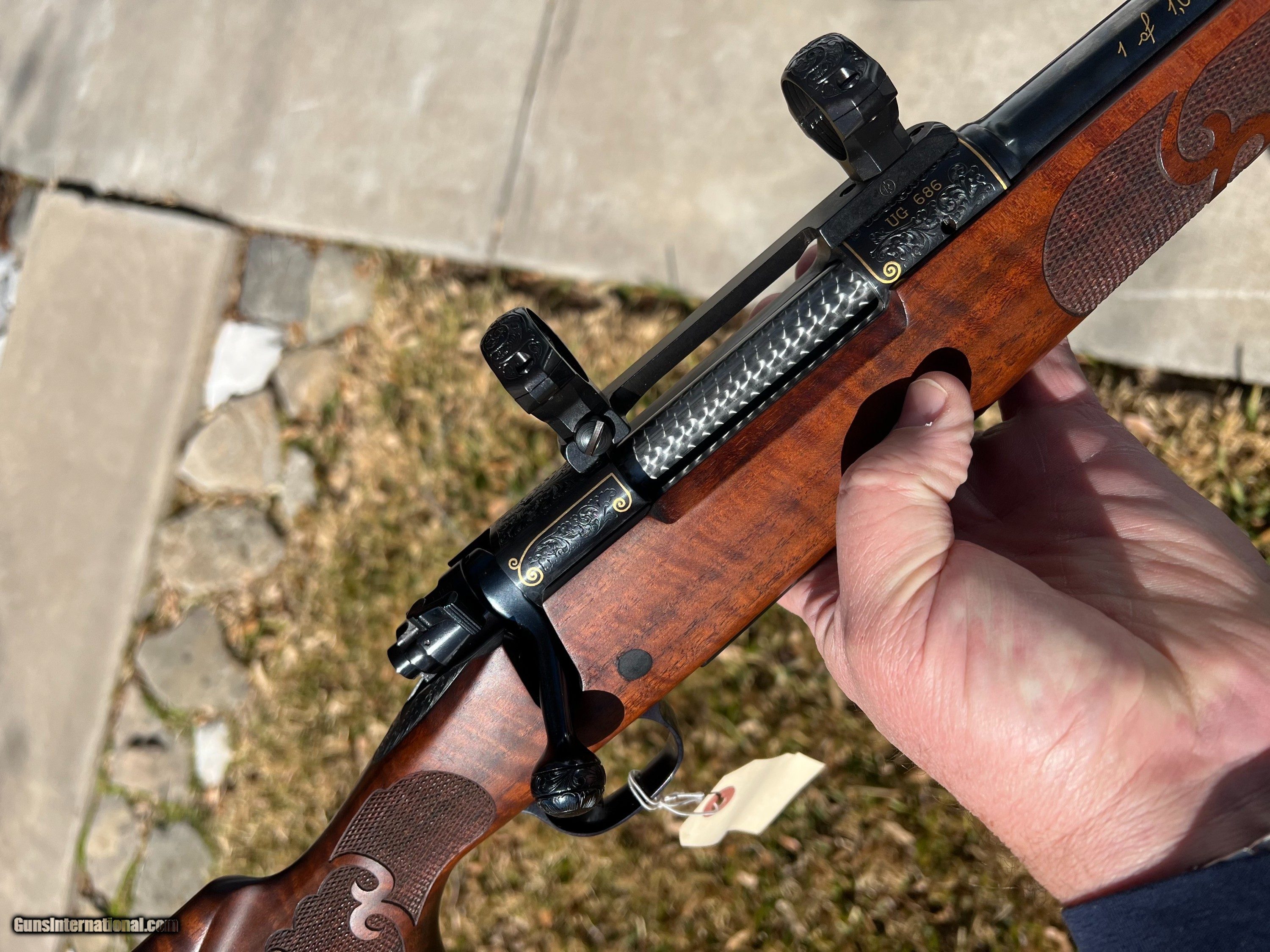 Description: GORGEOUS WINCHESTER MODEL 70 FEATHERWEIGHT 1 of 1000 ULTRA GRADE in .270 Winchester. Manufactured in 1983, this rifle has a featherweight style barrel manufactured without sights, it does come with a pair of engraved rings, with one wide and one thin gold wire barrel bands near the muzzle, "1 of 1,000" inlayed in gold on the right side of the barrel and an oval Winchester proofmark on top. The action displays nearly full coverage scroll engraving with punch dot backgrounds and gold wire borders and is marked with "UG686" in gold. The bolt body and magazine follower are jeweled. The trigger guard, metal grip cap and floor plate are scroll engraved. The floor plate is engraved with the head of a big horn sheep and gold wire borders. The bolt knob has a complex and well detailed flower and scroll engraving. The left rear of the action is signed "Bottega C. Giavonelli" giving the source of engraving as the Cesar Giavonelli school of engraving in Brescia, Italy. This wonderful heirloom Winchester is stocked in extra fancy American walnut in the featherweight style with a Schnabel foreend tip. Both sides of the butt are intensely figured with full sunburst fans of reds, blacks and dark browns. The rich colors continue throughout the stock. The checkering is extra fancy with an integrated ribbon pattern. The checkering borders the forearm and the pistol grip. Blued sling swivel studs and a Winchester red rubber rifle pad are additional features. The barrel is 22 inches long, and uses a fully round featherweight profile. Sorry no box or paperwork with the rifle. SOLD Rifle Caliber: .270 Winchester Manufacturer: WINCHESTER Model: MODEL 70 Serial Number: UG686 Barrel Length: 22 Bore: LIKE NEW Condition: LIKE NEW Metal Condition: 98% Wood Condition: 98% Bore Condition: LIKE NEW Action: BOLT Stock: ULTRA GRADE Sights: ENGRAVED RINGS Manufacture Date: 1983 |