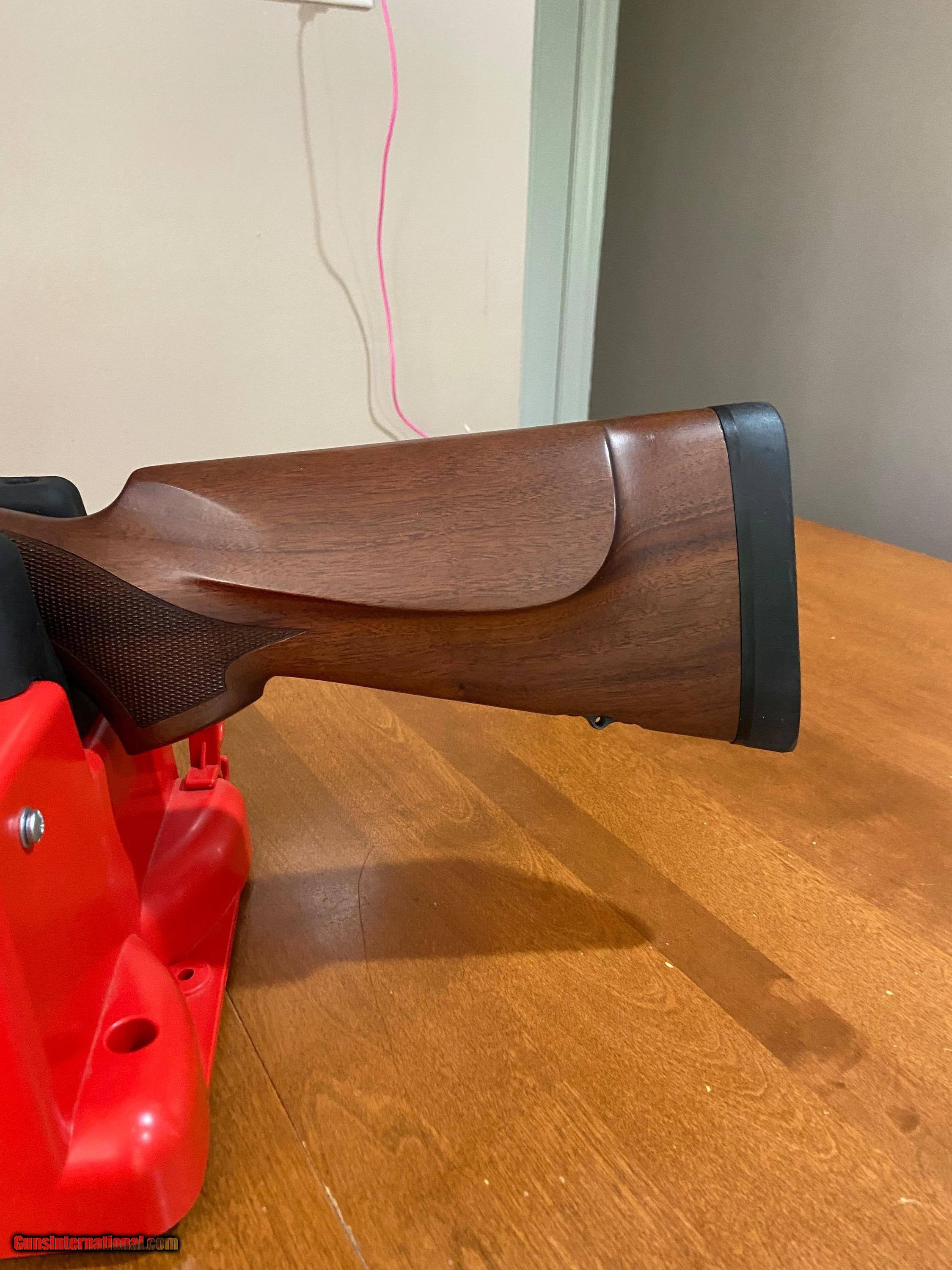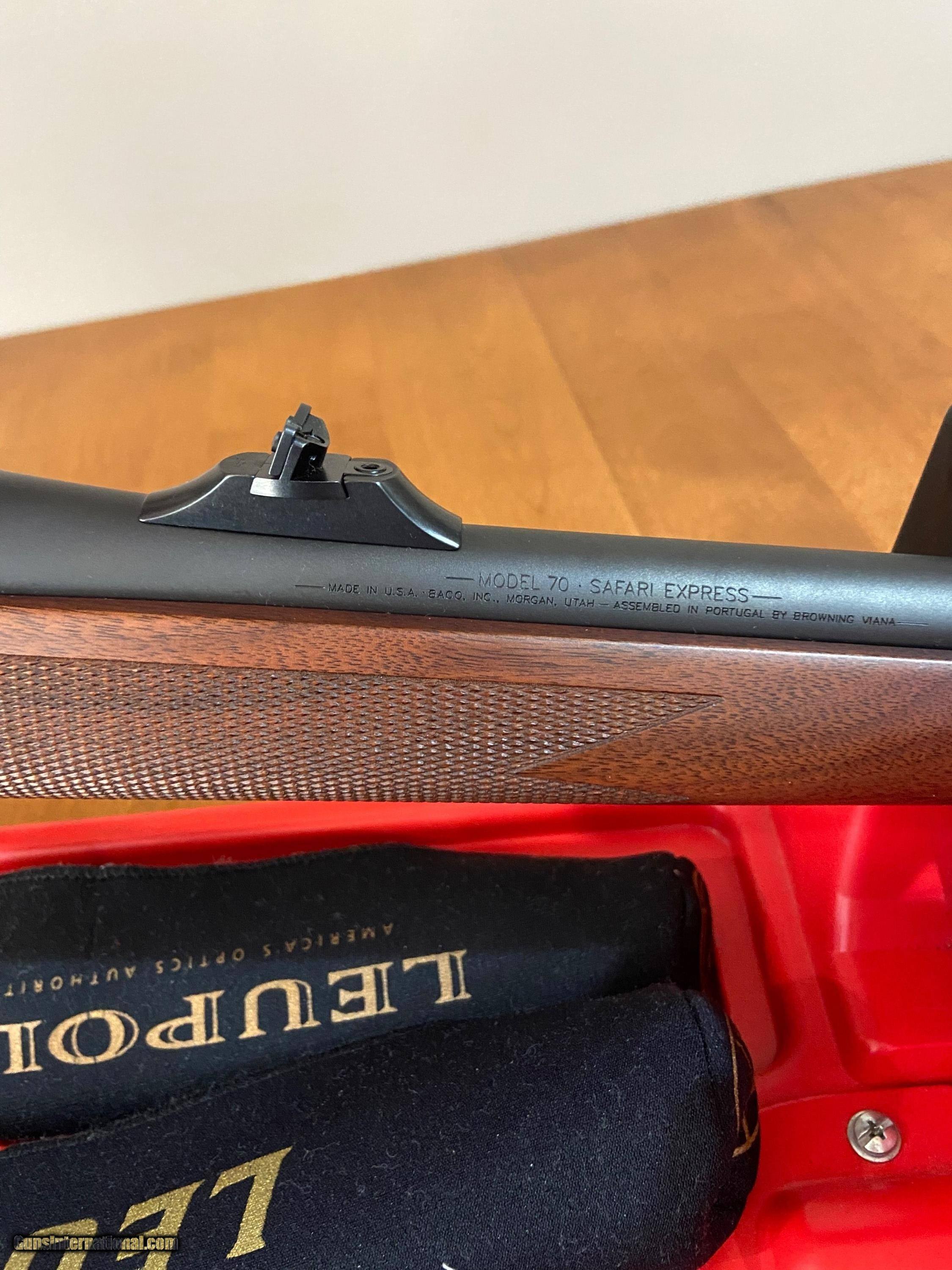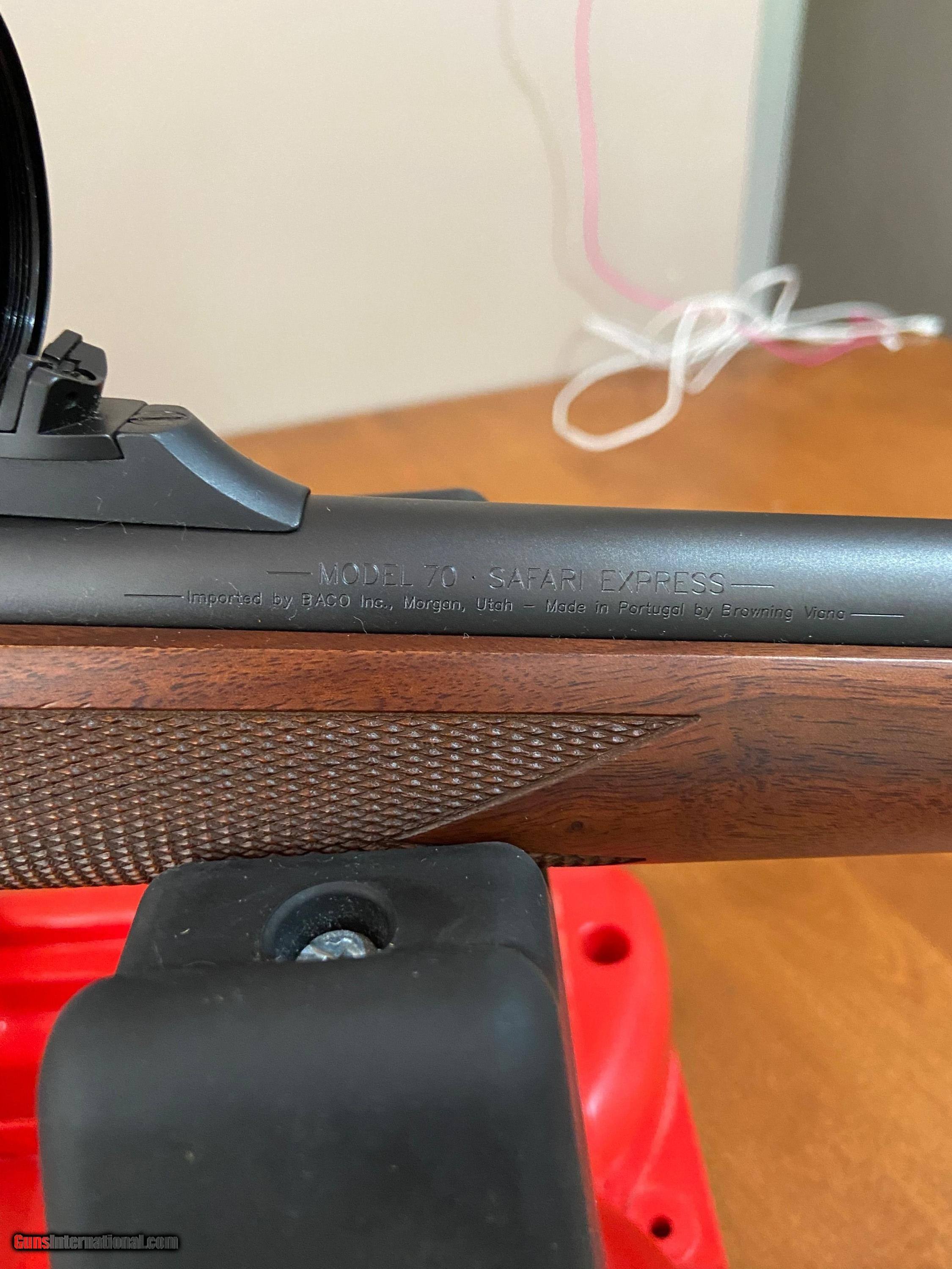 Description: Excellent Mod 70. Gun is as new with less than 50 rounds through it. Brand new scope and mounts haven't even been sighted in yet. Must ship to an FFL. Check or Postal Money Order. SOLD Rifle Caliber: .375 H&H Magnum Manufacturer: Winchester Model: 70 Safari Express Barrel Length: 24 inches Condition: Like New Metal Condition: Like New Wood Condition: Like new Bore Condition: Like New Action: Pre 64 Style Controlled Round Feed with Claw Extractor Triggers: Single M.O.A. System Stock: Satin Finish Grade 1 Walnut with Cut Checkering and Deluxe Cheekpiece Stock Drop: 1/2 at Comb 1/2 at Heel Butt Pad: Pachmayr Decelerator LOP: 133/4 Finish: Satin Weight: 9 pounds without scope Sights: Open sights and Leupold VX-3i 3.5 -10x40mm scope with Talley Quick Release Mounts and Rings Case: Canvas Case |