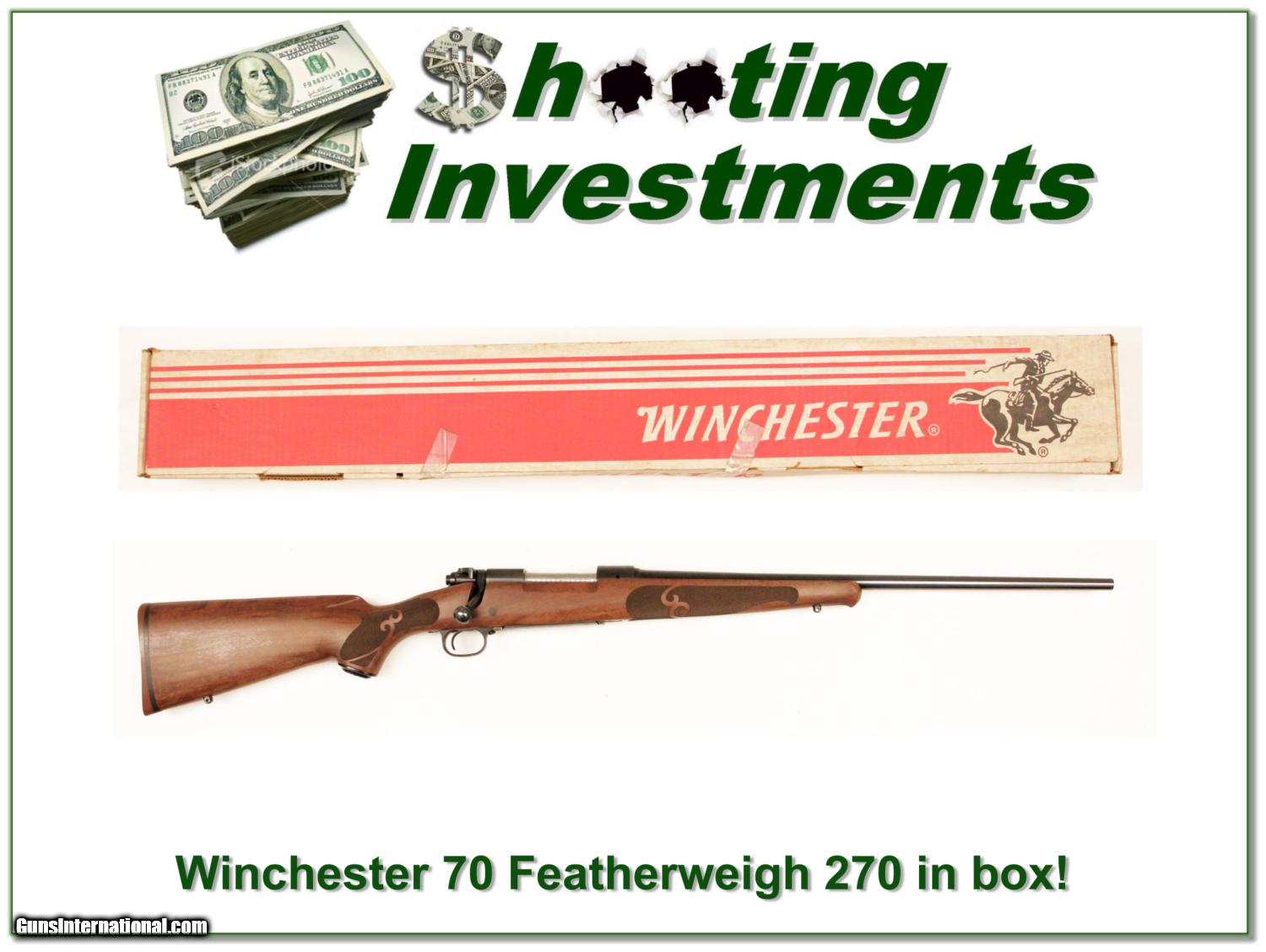 Description: This is an excellent condition and hard to find Winchester Model 70 Featherweight 270 in original box with all papers! If ever fired not more than a few rounds. It will make a nice addition to your collection. I am selling it on consignment and as such lay-a-way can’t be used. It does of course have the standard 3 day inspection. Shipping and insurance is $30 or $18 more if you want it shipped in a new Plano hard case. Please email me with any questions or larger pictures. (I now consign quality firearms only 10%! Let me know if you have any you would like to sell!) [15-0888] Payment: Payment is by Money Order, Cashiers Check or Personal Check. I can now also accept MasterCard and Visa with a 3% convenience fee. PayPal can be used for some items but never firearms. Please let us know if you would like to pay via PayPal. Shipping: The shipping charge will be listed in each description. It is $30 for most guns. Some heavy guns or those insured for over $2000 may be higher. Shipments to Alaska and Hawaii are higher because air shipment is required. Most firearms are shipped within 5 days of receipt of payment. We prefer shipping at the beginning of the week to avoid firearms in transit over weekends. We package all shipments carefully and insure them for the full purchase price, rounded up to the next $100. In the unlikely event that damage occurs, it is important that you save all packaging material for the claims process. Optics are shipped Priority Mail and most other non-firearm shipments are shipped First Class. Returns: Our return policy is simple. If for any reason you are not pleased with your purchase, you may return your item for a refund. The only exception is ammunition, it cannot be returned. It is important to us that you are happy. Guns cannot be fired or dissembled before returning them and must be returned in the same condition as received. Notification of a return must occur with-in 3 days of receipt at your dealer. Shipping, convenience and dealer fees are not refundable and are the responsibility of the buyer. Lay-a-way: If needed, we offer a 60 day lay-a-way option on most firearms. It is 1/3 now, 1/3 in 30 days and 1/3 in 60 days. Lay-a-way firearm sales are final. Consigning your firearms with Shooting Investments: We will help you get top dollar for your firearms. While most local guns shops charge 20% or more, our fee is only 10% with a minimum of $50. At your local gun shop it might take months to sell. Selling on-line provides instant access to thousands of interested buyers. You won’t find any other on-line dealer willing to sell your firearms for only 10% or listing every gun on 4 separate s. Selling through an House typically costs the seller 15% and the buyer an addition 15% (so 30%) and you have to wait several months to sell and longer to receive funds. If properly priced, we will sell your firearms in a week or two. Send us an email or give us a call and we’ll explain how easy it is for you to get top dollar. Trading: We collect guns and usually just trade for guns we want to add to our collections. We often sell guns for others wanting to purchase one of ours. We find this the most fair to both of us. Our Commission is only 10% and we hold the gun you want until yours sells. Please contact us if you want to sell one of yours to buy one of ours. Help for California Buyers: We are happy to ship to California. It is the buyer’s responsibility to make sure any item you buy is legal in your state. We are also happy to help with your purchase of a firearm from someone other than us. If you see a gun you would like to buy but the seller can’t or won’t ship to California we can help. You buy the gun and have it shipped to us. We’ll then ship it to your California dealer. The cost for this service is only $30 + shipping. Let me know if we can help! SOLD |
