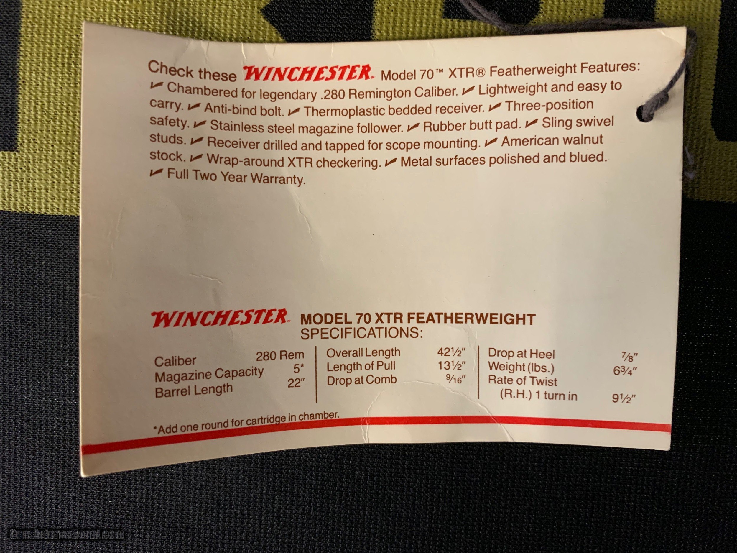 Description: Winchester Post 64 model 70 rifle. This rifle is chambered in .280 and very nice. 100 % New in box with factory hang tag still attached. This would make a great addition to your collection. For more information about this rifle or for purchasing it (((PLEASE GIVE US A CALL AT))) 1-(479)-968-4106. PRICE- $1,500 + Shipping SOLD Rifle Caliber: .280 Remington Manufacturer: Winchester Model: Model 70 XTR Serial Number: G1868423 Barrel Length: 22” Condition: NIB Action: Bolt |