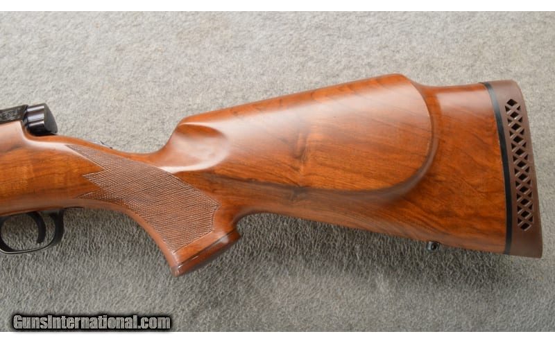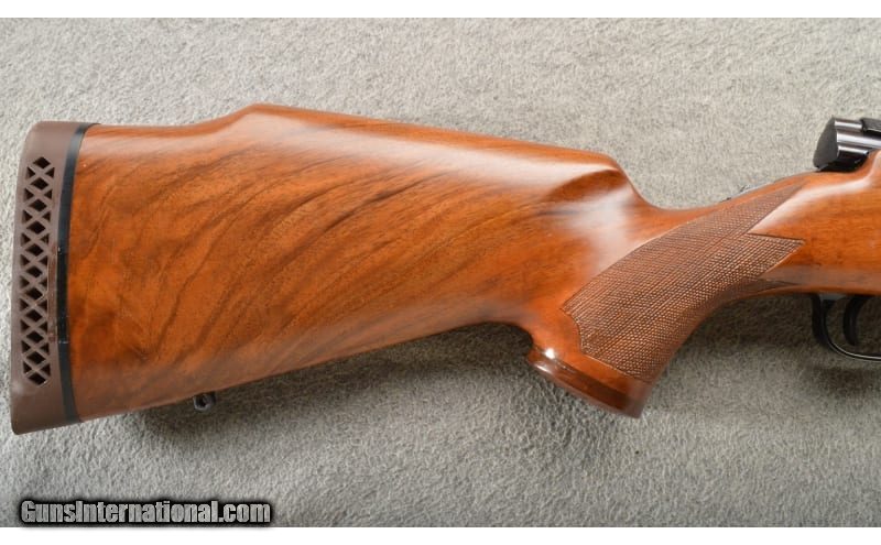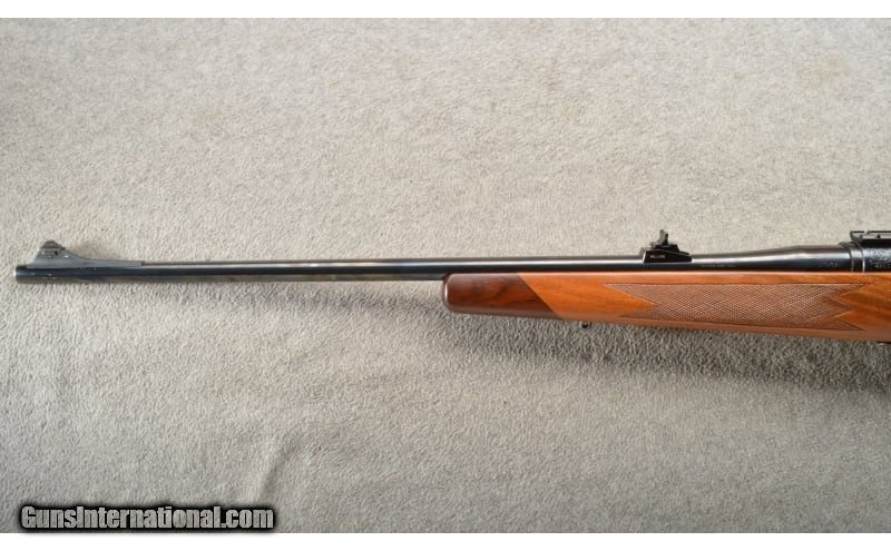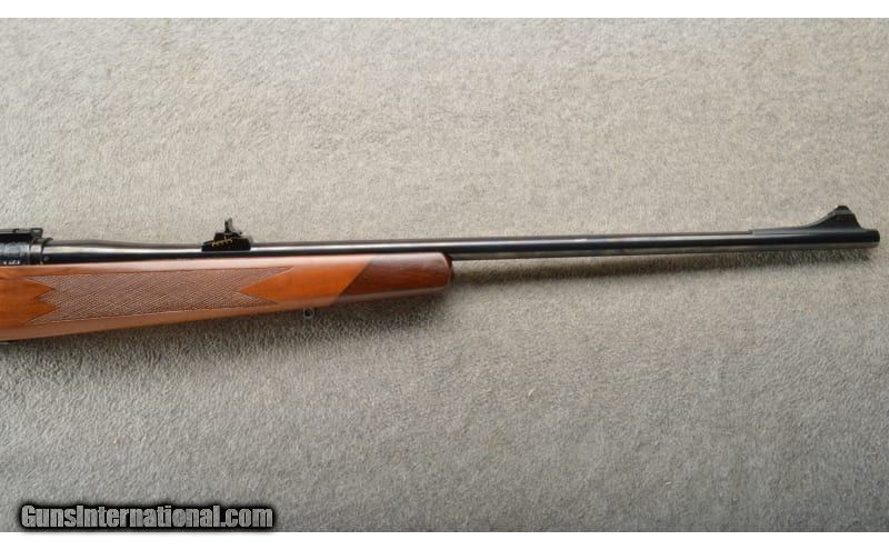 Description: Very rare Winchester model 777 in .270 Win. This model was specifically made for the European and Australia market. Production was only for about a year in 1979-80. Very few, possibly as few as 4 (3 were imported by Winchester), have been known to show up here in the United States. A rather fancy gun with some scroll work on the receiver and floor plate These were made with more of a Weatherby/Golden Eagle look than a Winchester. Fine looking rifle. This one retains most of all its blueing with some wear at the muzzle and floor plate. Slight wear on the bolt handle. The stock has a few light handleing marks on the right side, above the trigger. Right hand palm swell. If you have a Winchester collection, this would be one of the rarest guns you could get! .270 Winchester SOLD Chambers: Bolt action repeater. Metal Condition: Slight edge wear on main surfaces. Wood Condition: Minor handling marks. Bore Condition: Bright and strong. Barrels: 24" blue with factory sights. Triggers: Single blue. Stock Dimensions: 14" LOP. Fore End: "Checkered walnut, sling stud, Rosewood tip. Butt Pad: Winchester brown vented recoil pad. Weight: 8 Lbs. 4 Oz. Sights: "Adjustable rear, front blade with white bead, Weaver style scope bases. Item Location: Owatonna, MN |