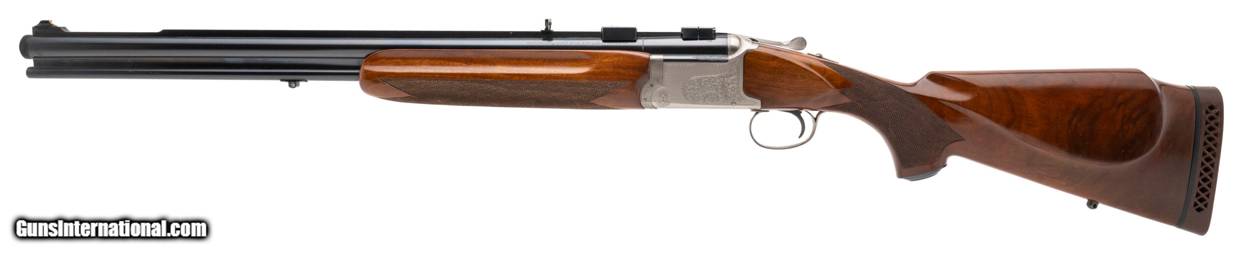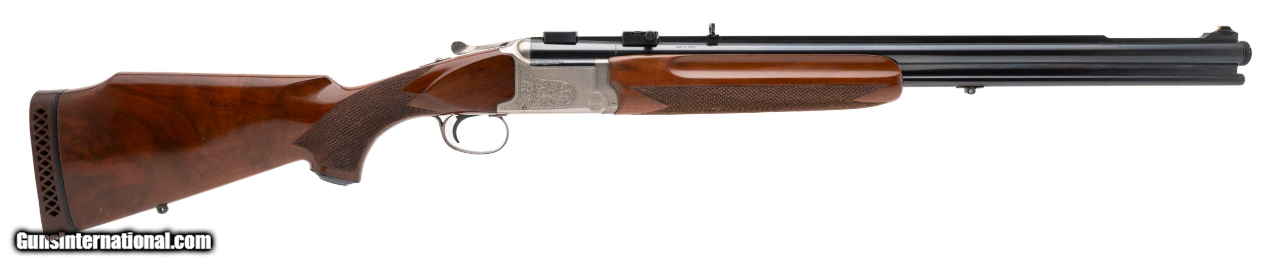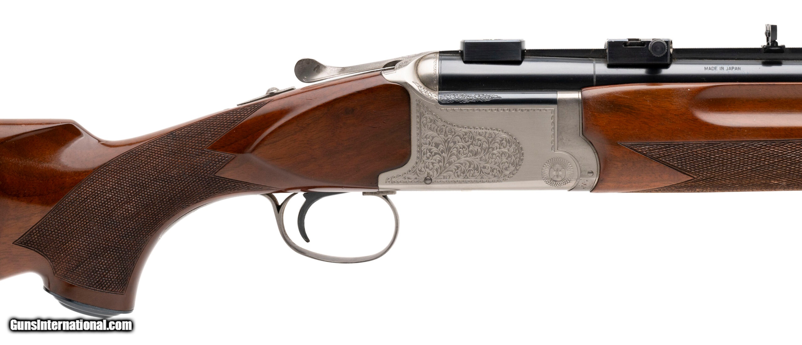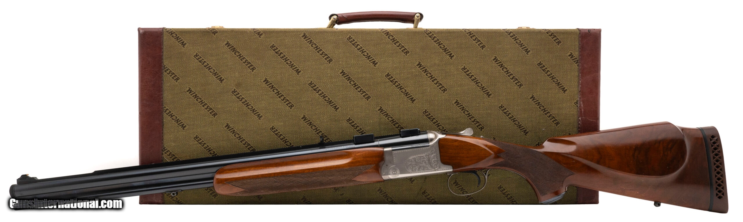 Description: "SN: SR000386. Made 1983-85 only. 12ga/30-06 with 25"" barrels. Scarce over/under combination gun. Has an engraved silver receiver, deluxe figured walnut, open sights and quick release scope bases. Shows some light marks and hunting wear, overall very good condition. Comes with Winchester luggage case and extra chokes. SOLD |