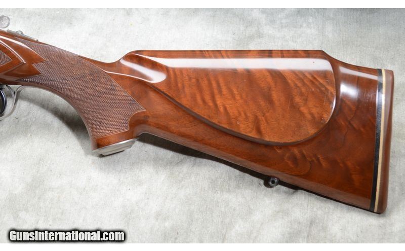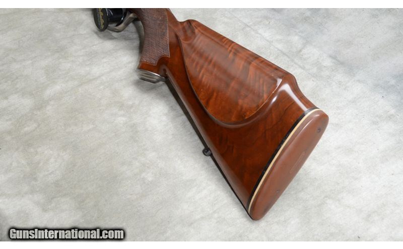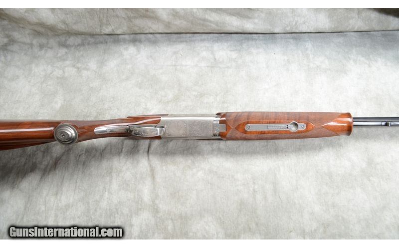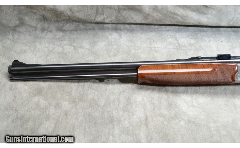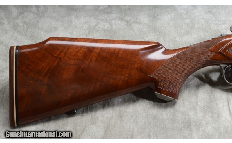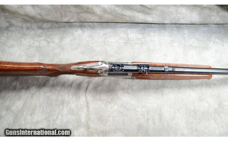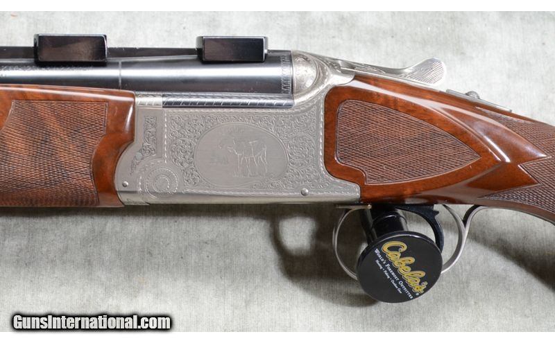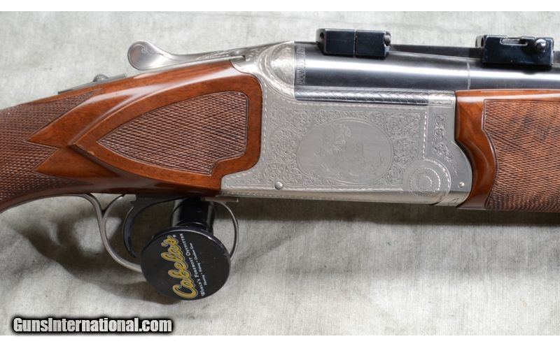 Description: Rare find is in great shape with coined receiver with Moose and upland bird engravings. Deluxe grade walnut stock with Monte Carlo comb and cheek piece. Nice sharp checkering. 12 Gauge SOLD Chambers: "Two barrels, each carries one cartridge. Metal Condition: Excellent. Wood Condition: Excellent. Bore Condition: Shiny and bright. Barrels: 25 inch. Triggers: Single selective trigger. Stock Dimensions: 14 inch LOP. Fore End: Semi-beavertail with Schnabel. Butt Pad: Rubber pad. Weight: 8 lb. - 6 oz. Sights: Gold bead and folding leaf open sights. The rear leaf is in the case and the dovetail properly filled. Chokes: Shotgun barrel has screw-in Winchokes. Item Location: Rogers |