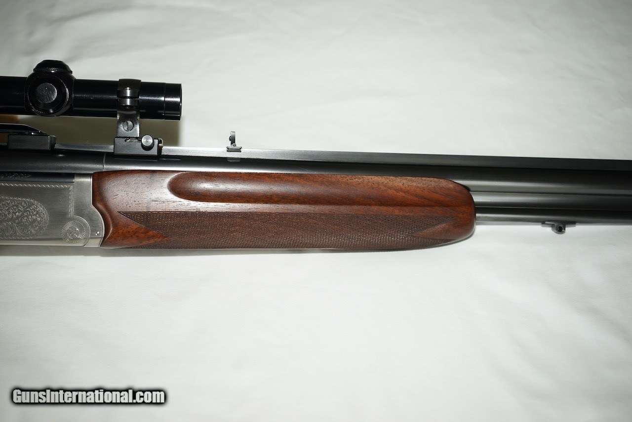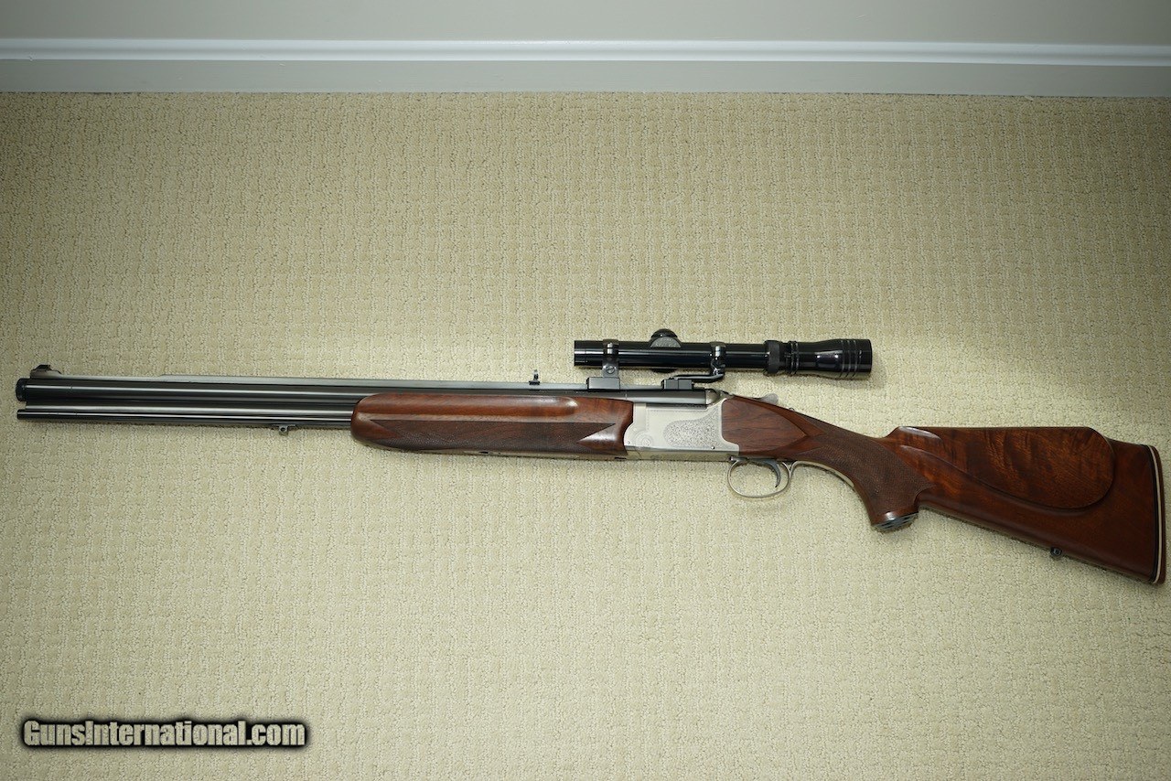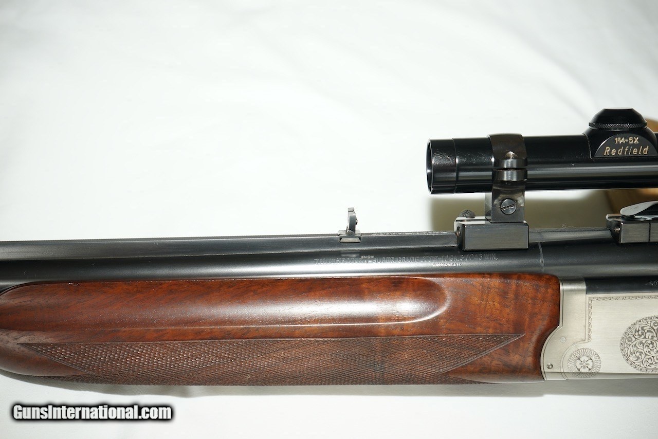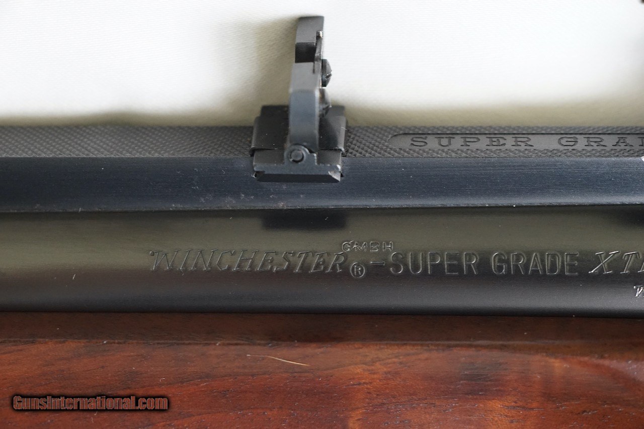 Description: Here is a German Proofed Winchester Super Grade Shotgun/Rifle Combination Gun in the versatile 12 Gauge 3" Winchoke barrel over a .243 Winchester rifle barrel. Xtra-Full, Full, Modified and Improved Cylinder choke tubes are included. This firearm is unlike most seen as it is not marked "Made in Japan" as it was manufactured in the mid 1980's for Winchester Germany and is marked Winchester GMBH with both barrels carrying the eagle over N Ulm Nitro Proof and the Munich cross-hatched shield proof marks. This rare gun is in excellent condition showing little use as can be seen in the photos. The wood is oil finished. Winchester factory installed EAW quick detachable scope mount and rings hold a vintage Redfield Widefield 1.75 x 5 scope. The original Italian leather fitted gun case is also in excellent condition. Included are the original owners manual, Winchoke wrench in its snap closure case, and a Winchester catalog highlighting this model. Buyer to pay actual shipping and insurance costs. SOLD Rifle Caliber: .243 Winchester Shotgun Gauge: 12 Gauge |