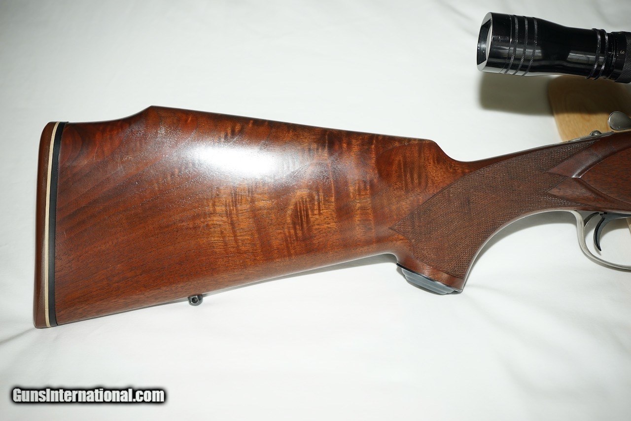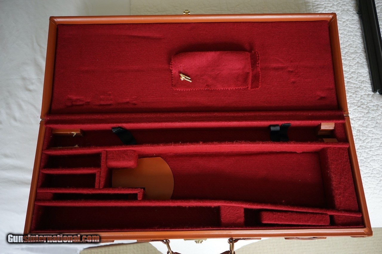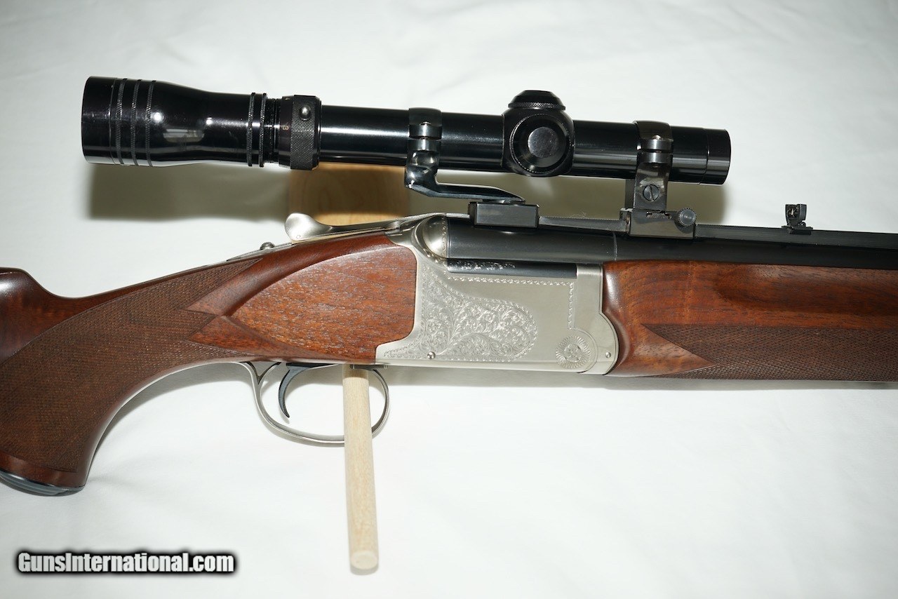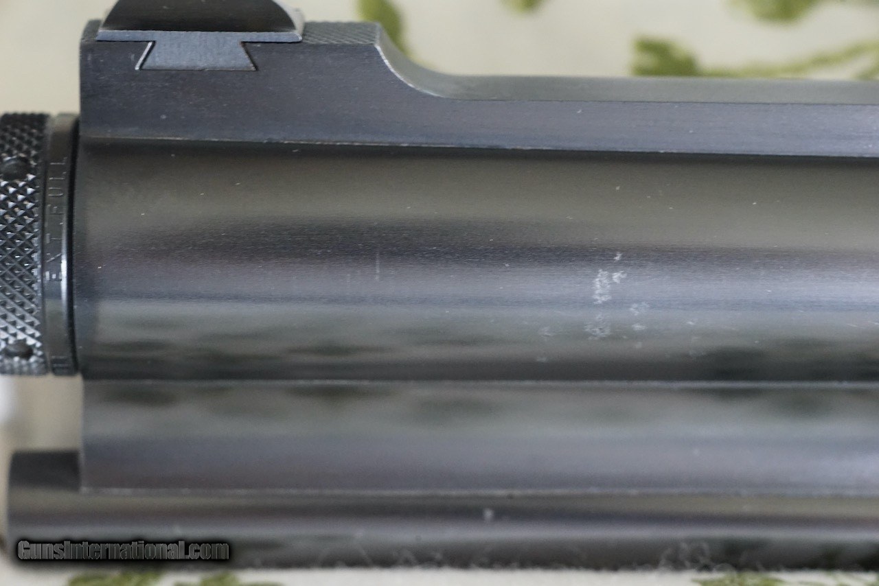 Description: Here is a German Proofed Winchester Super Grade Shotgun/Rifle Combination Gun in the versatile 12 Gauge 3" Winchoke barrel over a .243 Winchester rifle barrel. Xtra-Full, Full, Modified and Improved Cylinder choke tubes are included. This firearm is unlike most seen as it is not marked "Made in Japan" as it was manufactured in the mid 1980's for Winchester Germany and is marked Winchester GMBH with both barrels carrying the eagle over N Ulm Nitro Proof and the Munich cross-hatched shield proof marks. This rare gun is in excellent condition showing little use as can be seen in the photos. The wood is oil finished. Winchester factory installed EAW quick detachable scope mount and rings hold a vintage Redfield Widefield 1.75 x 5 scope. The original Italian leather fitted gun case is also in excellent condition. Included are the original owners manual, Winchoke wrench in its snap closure case, and a Winchester catalog highlighting this model. Buyer to pay actual shipping and insurance costs. SOLD Rifle Caliber: .243 Winchester Shotgun Gauge: 12 Gauge |