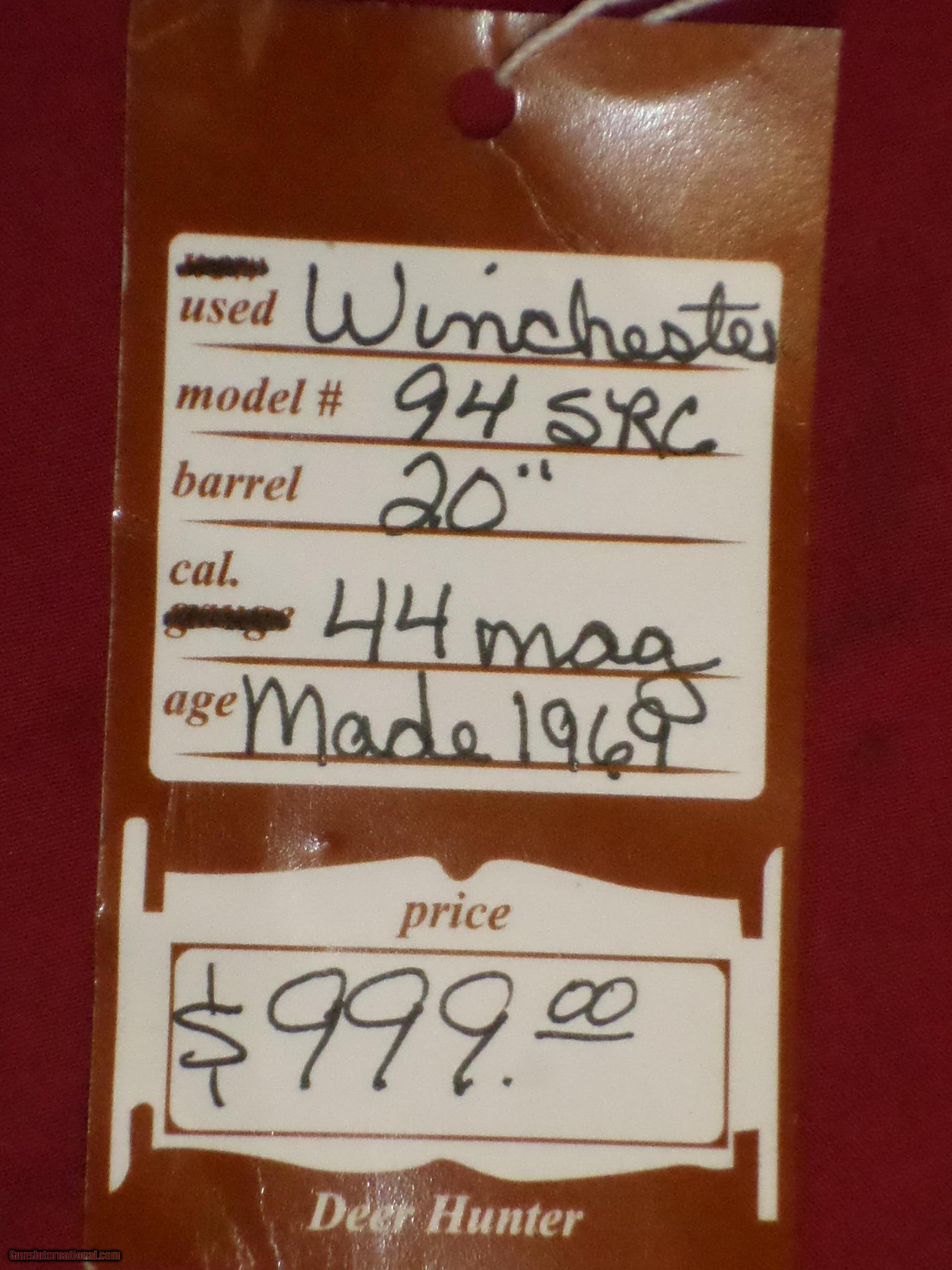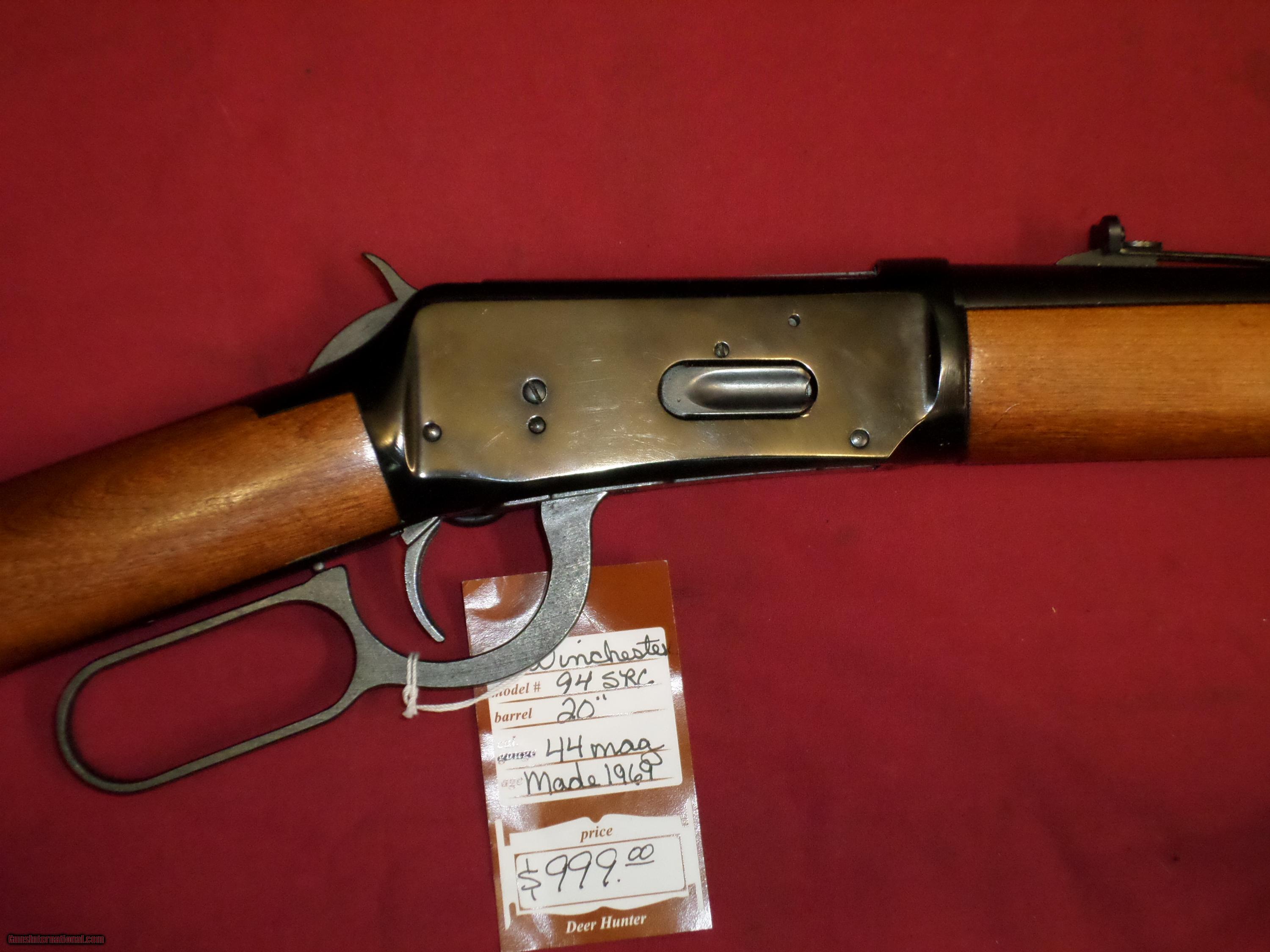 Description: SOLD For sale, Winchester 94 Carbine in .44 Mag. 20" bbl. Plain stock, in very good to excellent condition. Circa 1969 To see more of our inventory, visit deerhunterguns,com We collect 7% sales tax for Florida sales. We accept MC, Visa and Discover, no AmEx. No Sales to California. Like us on Facebook: Deer Hunter Guns SOLD |