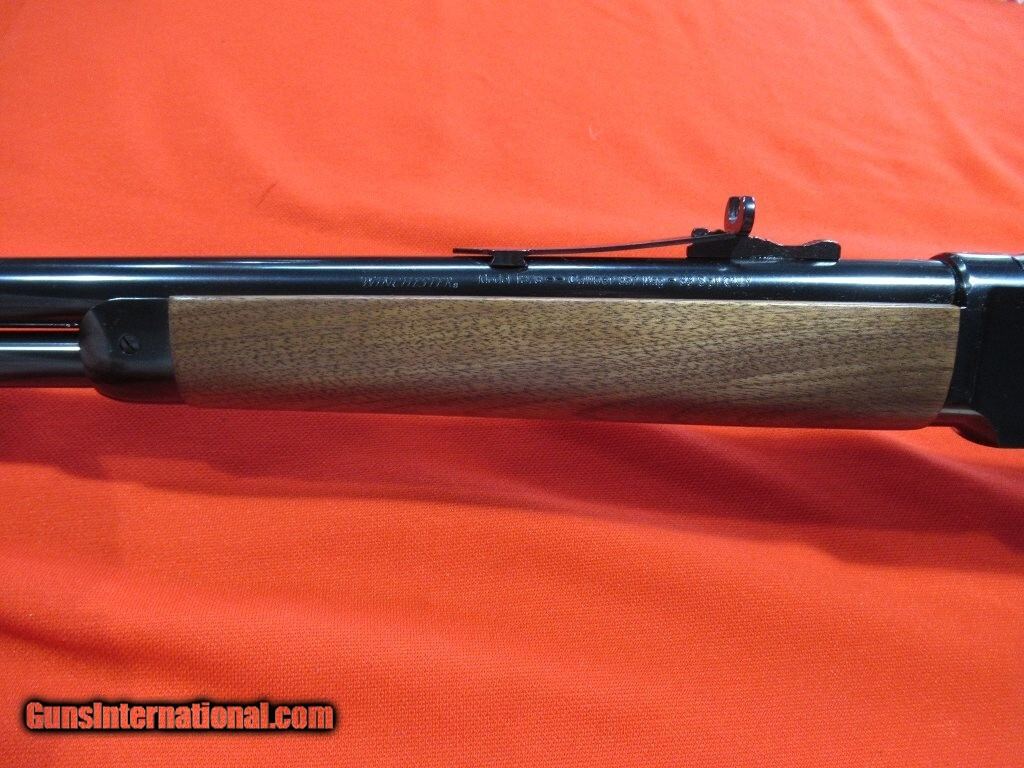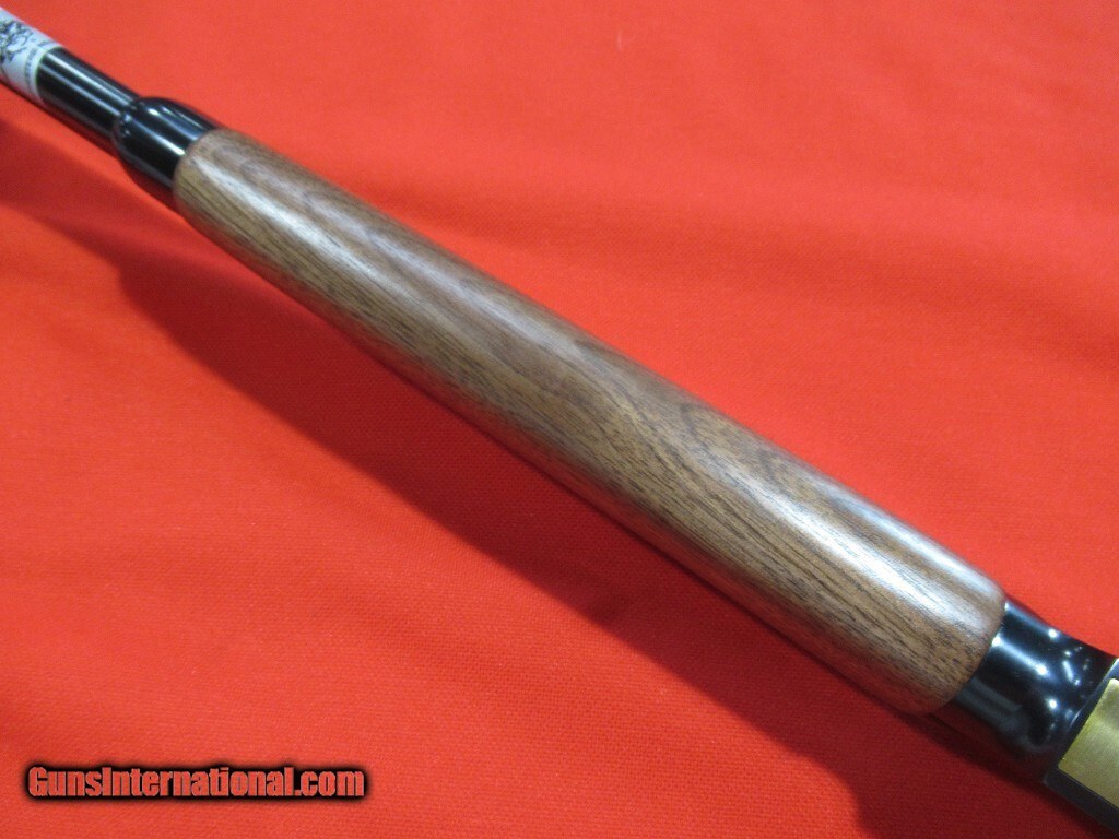 Satin oil finished straight grip walnut stock and forend, 20" round barrel, Buckhorn rear sight with elevator, gold bead front sight, crescent steel butt plate.