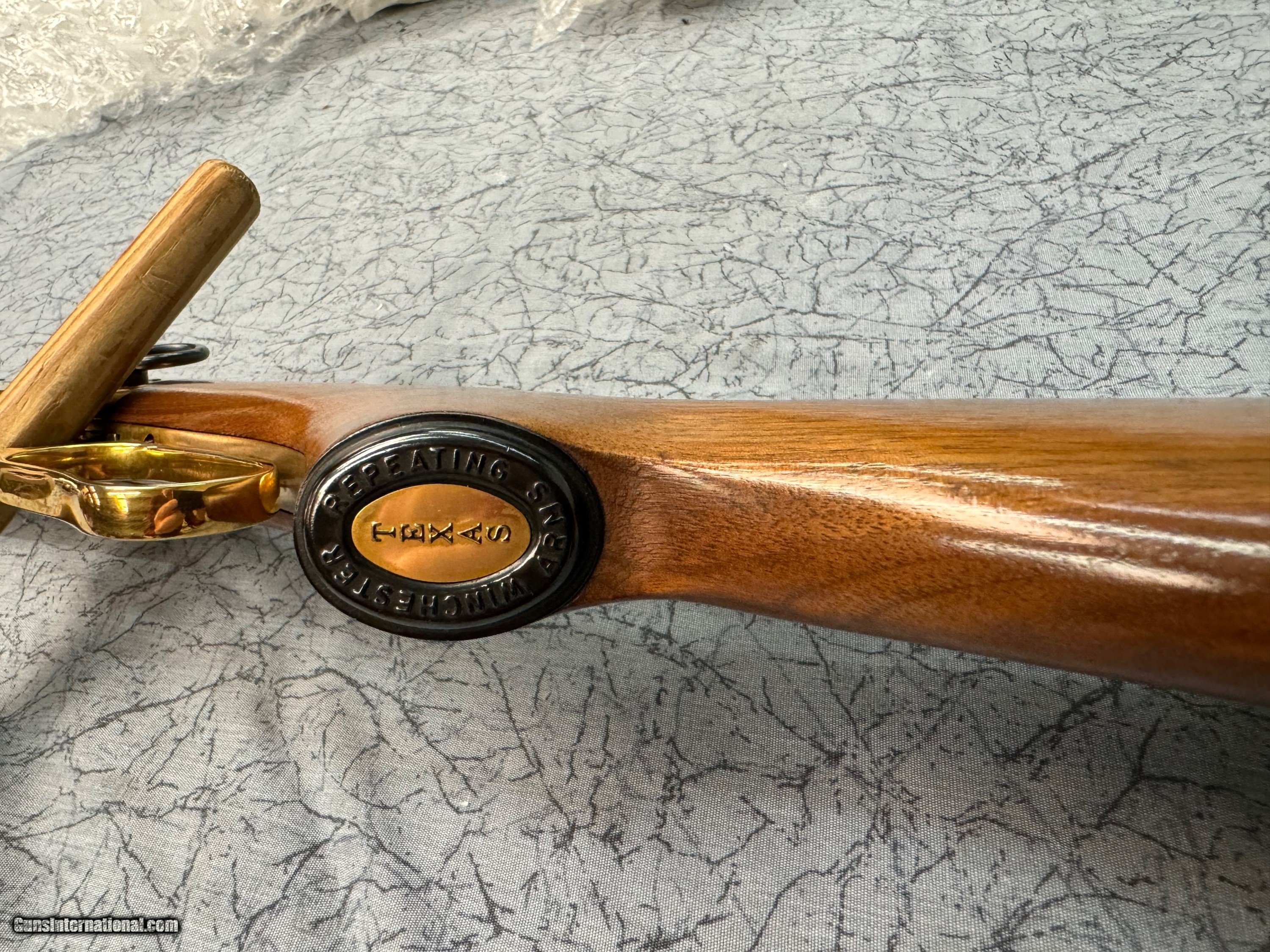 Description: Winchester Model 94, 30-30. Lone Star Commemorative. S/N LS2528. There are blemishes in the finish on the butt pad, there is an area on the LH side of the receiver where the plating looks worn off, also the plating on the fore arm band is gone and it looks silver. The blued metal doesn't have any flaws. There are several dings in the wood, mostly on the bottom of the stock near the butt pad. I tried to show these things in the photos. So it is a good ways from perfect, but still a pretty rifle. These certainly aren't rare, they made 20,000 plus. I have not fired it and it doesn't show evidence of being fired much if any. I bought it because I thought it was a pretty gun and I am in Texas. I have enjoyed having it, maybe someone else will. Shipping will be $50. SOLD Rifle Caliber: .30-30 Winchester |