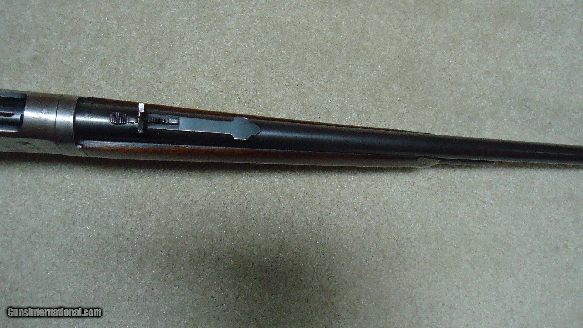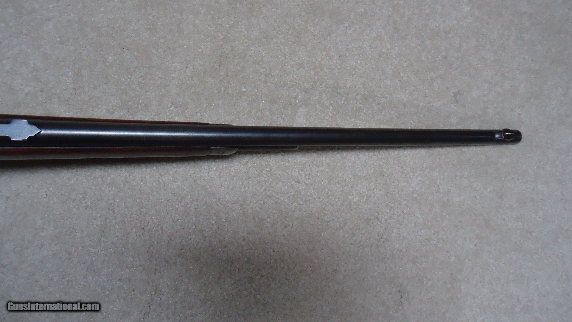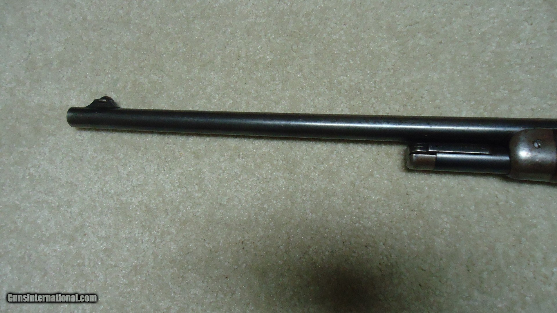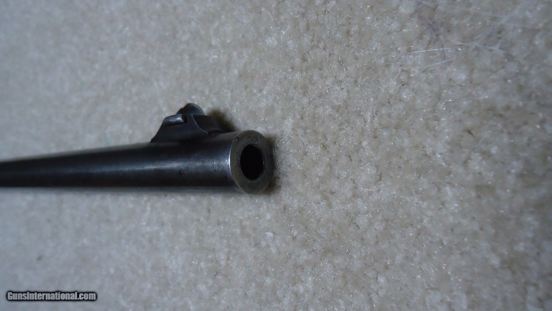 Description: 1886 EXTRA LIGHTWEIGHT, TAKEDOWN, .33WCF CALIBER, #155XXX, MADE 1918. One of the last of the Pre-Bolt action years 1886s, this was a popular big game rifle made portable by the takedown feature. This is the only Model 1886 expressly chambered for a smokeless powder cartridge and is merely the big .45-70 case necked down to .338" and firing a jacketed soft point 200 grain slug. This one has the standard 24" light weight round barrel with half magazine and excellent Winchester embossed hard rubber shotgun butt plate. The barrel retains fine blue showing light age and is fitted with a flat top buckhorn rear sight with elevator bar intact and a Lyman "Jack Front Sight" which is a half moon with ivory bead. the receiver is mainly gray with some brown spotting with excellent blue on the bolt. Screw heads look unturned. Fine butt stock and forend show light handling only with tight wood to metal fit. Tight action , takedown and about excellent bore- any minor corrosion is very surface and scattered and ought to scrub out or shoot out. A classic 104 year old 1886 that still has a lot of life left in it! SOLD Rifle Caliber: .33 WCF Manufacturer: Winchester Model: 1886 EXTRA LIGHT Serial Number: 155XXX Barrel Length: 24 Condition: VG |