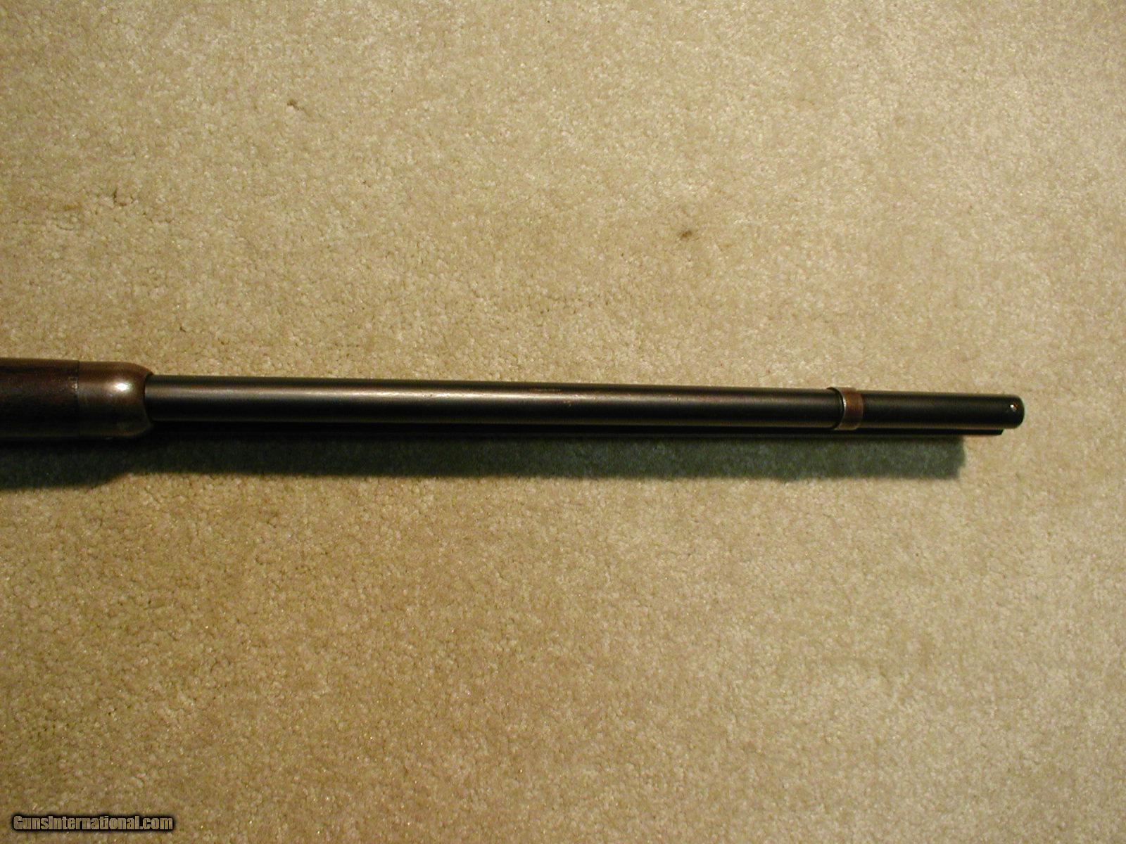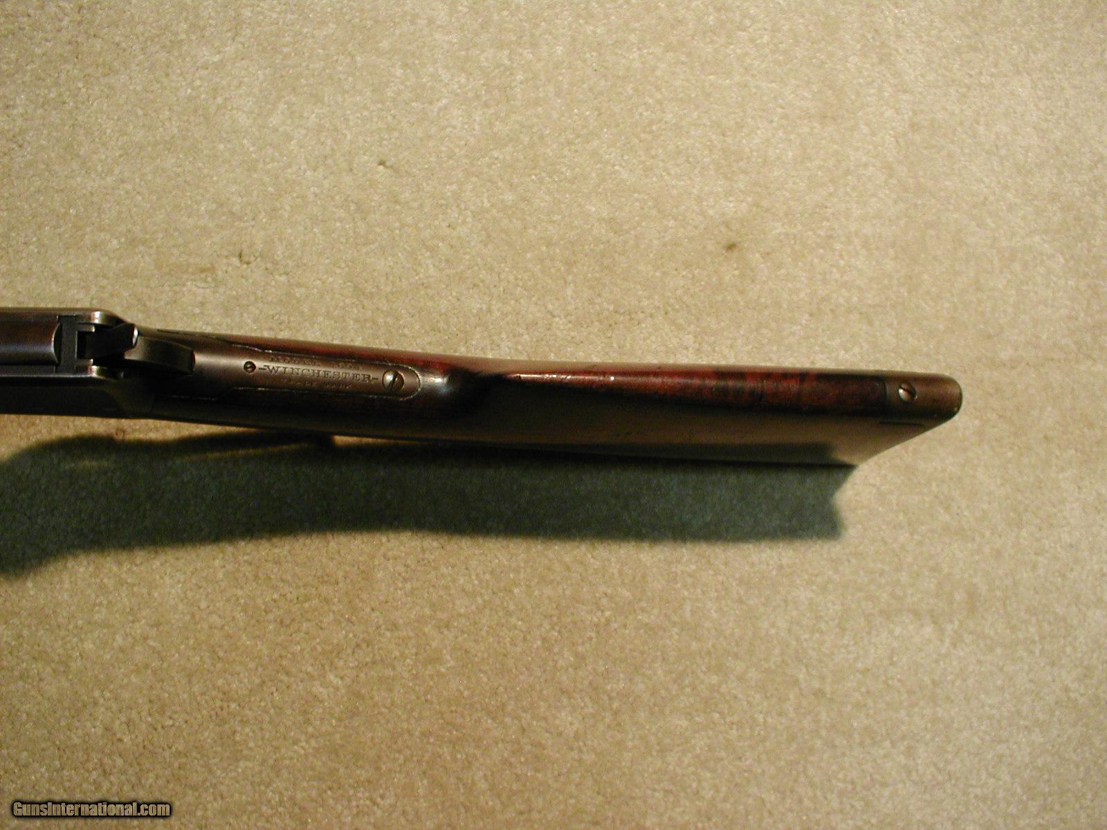 Description: 1894 OCTAGON RIFLE IN .32WS CALIBER, MADE 1906, has the correct original "smokeless" rear sight used only on this caliber 1894s along with the standard Winchester blade front sight, nice deep barrel and mag blue showing minor age only, receiver is an even mixture of original blue and plum that is very attractive, exc. screw heads, exc. markings, stock and forend show only light handling and there is one typical thin age crack coming back from the receiver on the right side of the wrist for about an inch and goes nowhere, nice blue on the loading gate, tight action, exc. bore is maybe just a little dark at worst, a handsome classic 110 year old octagon rifle with lots of finish in a more scarce caliber. SOLD Curio/Relic: Yes Manufacturer: Winchester Model: 1894 OCTAGON RIFLE Serial Number: 342XXX Caliber Info: .32 WS Condition: fine+ Barrels: 26" oct |