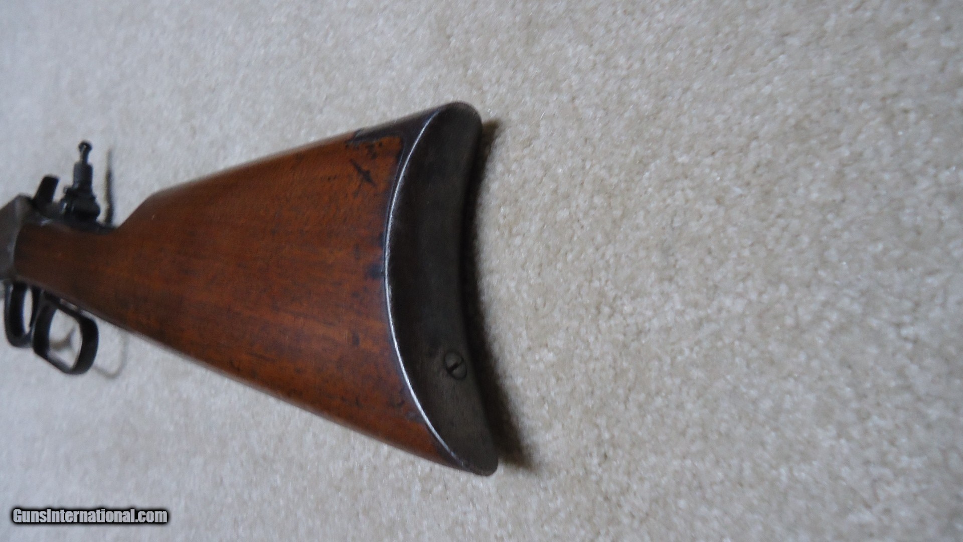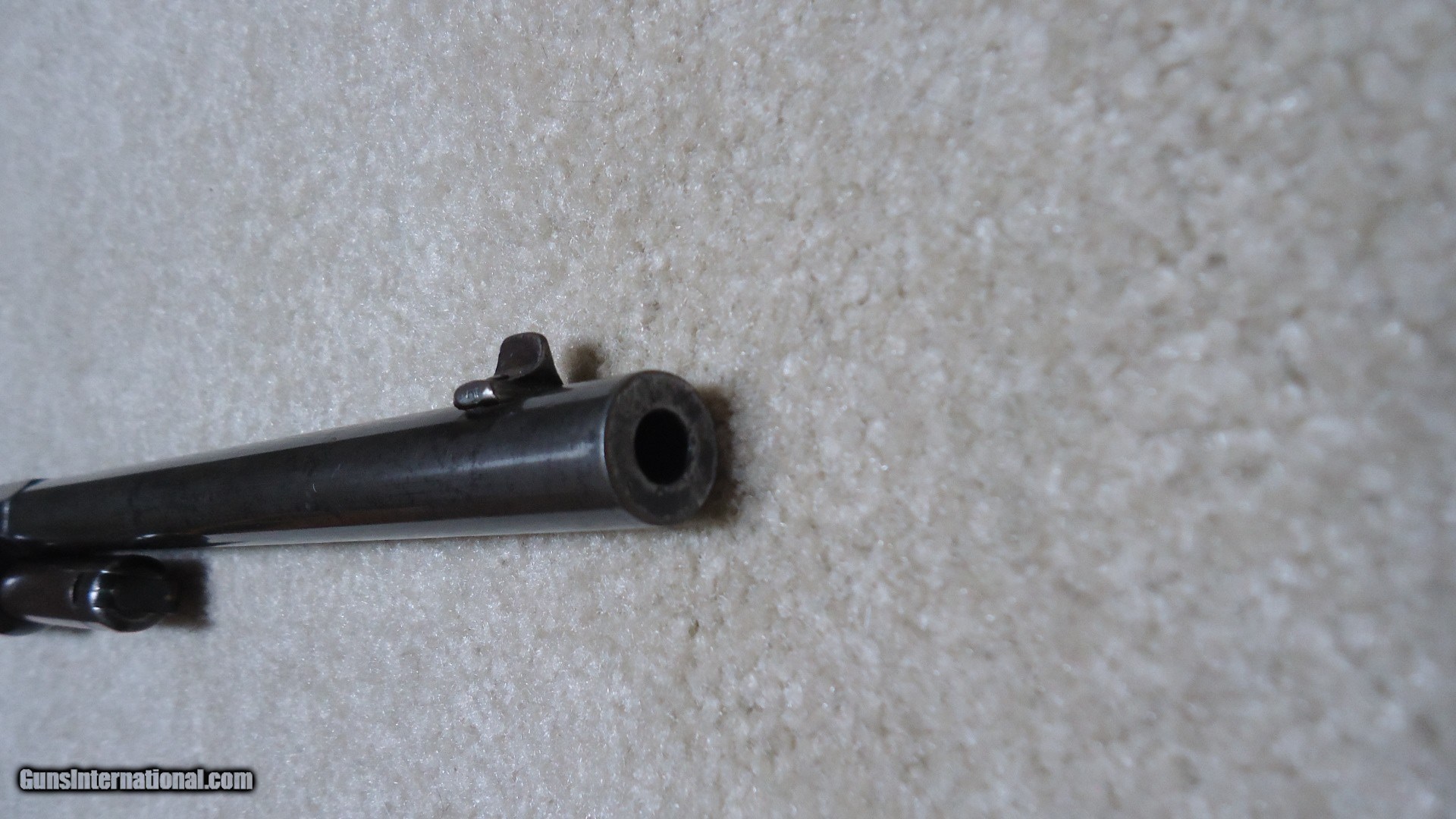 Description: ONE OF THE MOST UNUSUAL AND RARE MODEL 1894s I'VE OFFERED IS THIS SPECIAL ORDER TAKEDOWN SHORT RIFLE WITH 20" HALF OCTAGON BARREL, HALF MAGAZINE, .30 WCF, #161XXX MADE 1902. This rifle comes with two letters from William L. Porter, Research Associate at the Winchester Arms Museum- one dated July 29, 1985 and the other dated November 11, 1985. In both letters he states: "I have personally examined all the model 1894 records from serial number 1 through serial number 161XXX... I could find no other guns with the exact specifications as serial number 161XXX. These specifications were, rifle, .30 caliber, 20 inch 1/2 octagon barrel, plain trigger, takedown, 1/2 magazine." He does not state whether numbers higher than this one might have the same features, but my guess is that none to very few were made like this. Short rifles are not common; takedown short rifles really uncommon; 20" half octagon rifles are seldom seen and 1/2" magazines on 20" rifles are also almost never seen. All put together make this a possibly unique 1894. Obviously, this rifle was special ordered by an individual who needed an easily transportable, lightweight rifle for a lot of hunting, and this rifle shows it has a lot of history in it! The wood is basically sound with a repaired crack in the left side of the forend and one coming forward from the bottom portion of the butt plate for a couple of inches, but is intact. Aside from that the wood shows handling, but no abuse. The barrel and mag tube show aged and thinning blue. The barrel is fitted with a short blade front sight, two leaf express sight mated with a Lyman tang sight. The receiver is gray with some dings and if you look closely, possibly a repair to the upper tang at the hammer junction. Takedown is tight, action is fine and the bore is a bit frosty, but not heavily pitted. Like almost all Trapper Carbines and Rifles, what this rifle lacks in finish, it makes up for in unusual rarity! Still has an attractive and unusual appearance. I don't expect to see another like it. Wonderful documentation! This is one you add to your collection because it is either the first 1894 Winchester produced like this or one of the only ones produced like this! SOLD Curio/Relic: Yes Rifle Caliber: .30-30 Winchester Manufacturer: Winchester Model: 1894 SPECIAL ORDER Serial Number: 161XXX Barrel Length: 20" HALF OCT. Condition: VG |