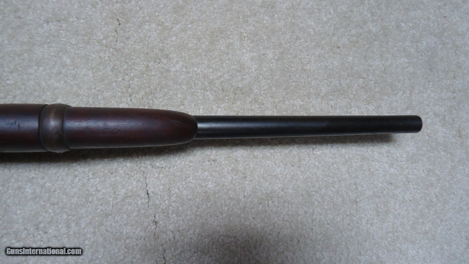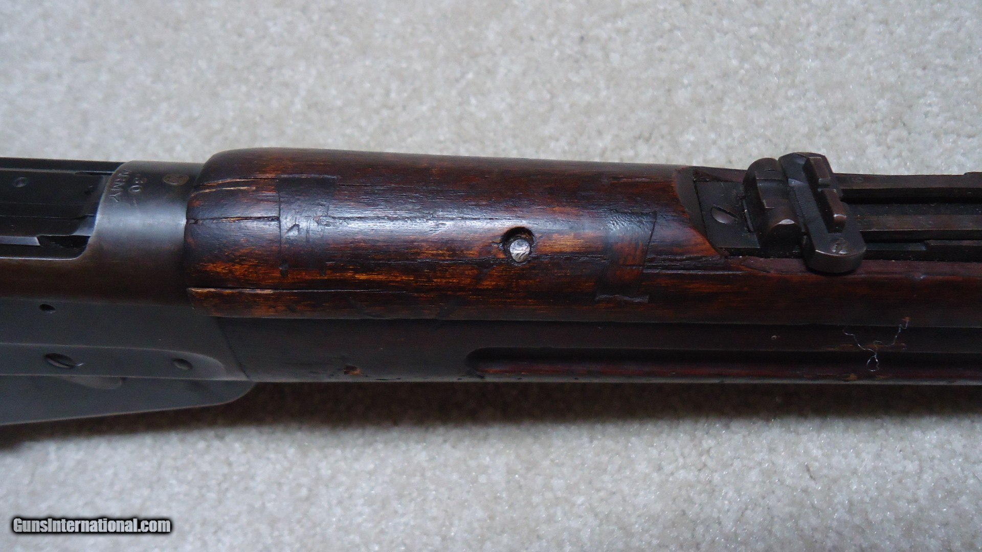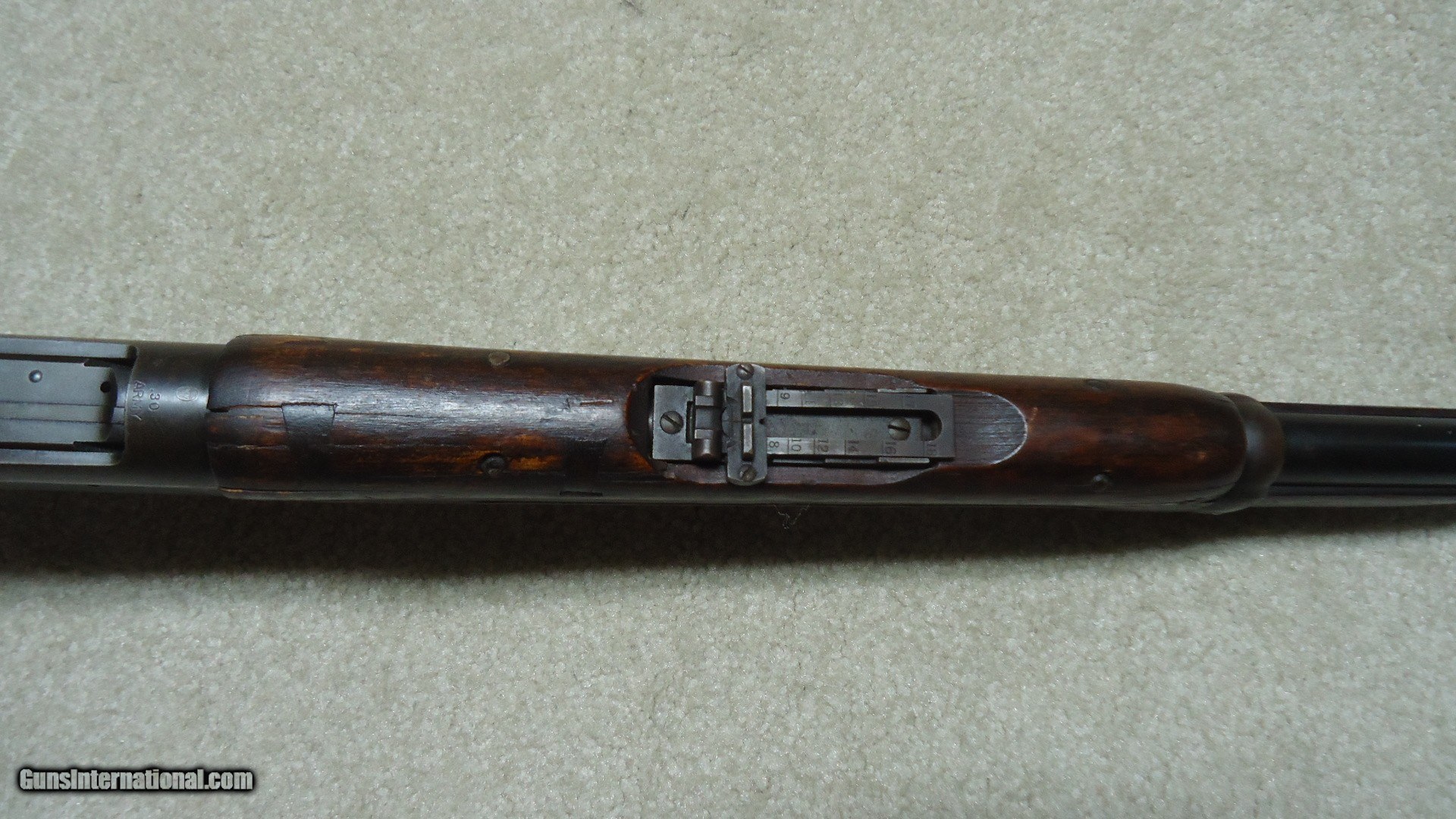 Description: 1895 SADDLE RING CARBINE, .30 ARMY (.30-40 KRAG) CALIBER, #109XXX, MADE 1915. These '95 carbines have become very difficult to find. Favorites with the Texas and Arizona Rangers as well as with cowboys especially in the southwest, most of these carbines that come to light show hard use and frequently are absent the walnut hand guards. This one is is complete. The barrel retains fine slightly aged blue with minor freckling and the receiver retains good somewhat aged blue on the sides, magazine sides and on the bolt. The balance has aged to brown. Fine markings and original rear sight with slide intact mated with correct front sight. The butt plate upper edge portion is pitted over the top, but never cleaned or buffed. The screws are excellent. Butt stock and forearm show light handling with tight wood to metal fit.- looks like the rear bottom of the forend has a "17" or perhaps "LL" scratched in just ahead of the receiver , might also be a brand. The hand guard has the usual crack, but this one was carefully and neatly repaired with walnut "patches" inletted perfectly over the crack and making it quite solid. Bore is sharp and excellent, action is tight. SOLD Curio/Relic: Yes Rifle Caliber: .30-40 Krag Manufacturer: Winchester Model: 1895 Serial Number: 109XXX Barrel Length: 22 Condition: VG+ |