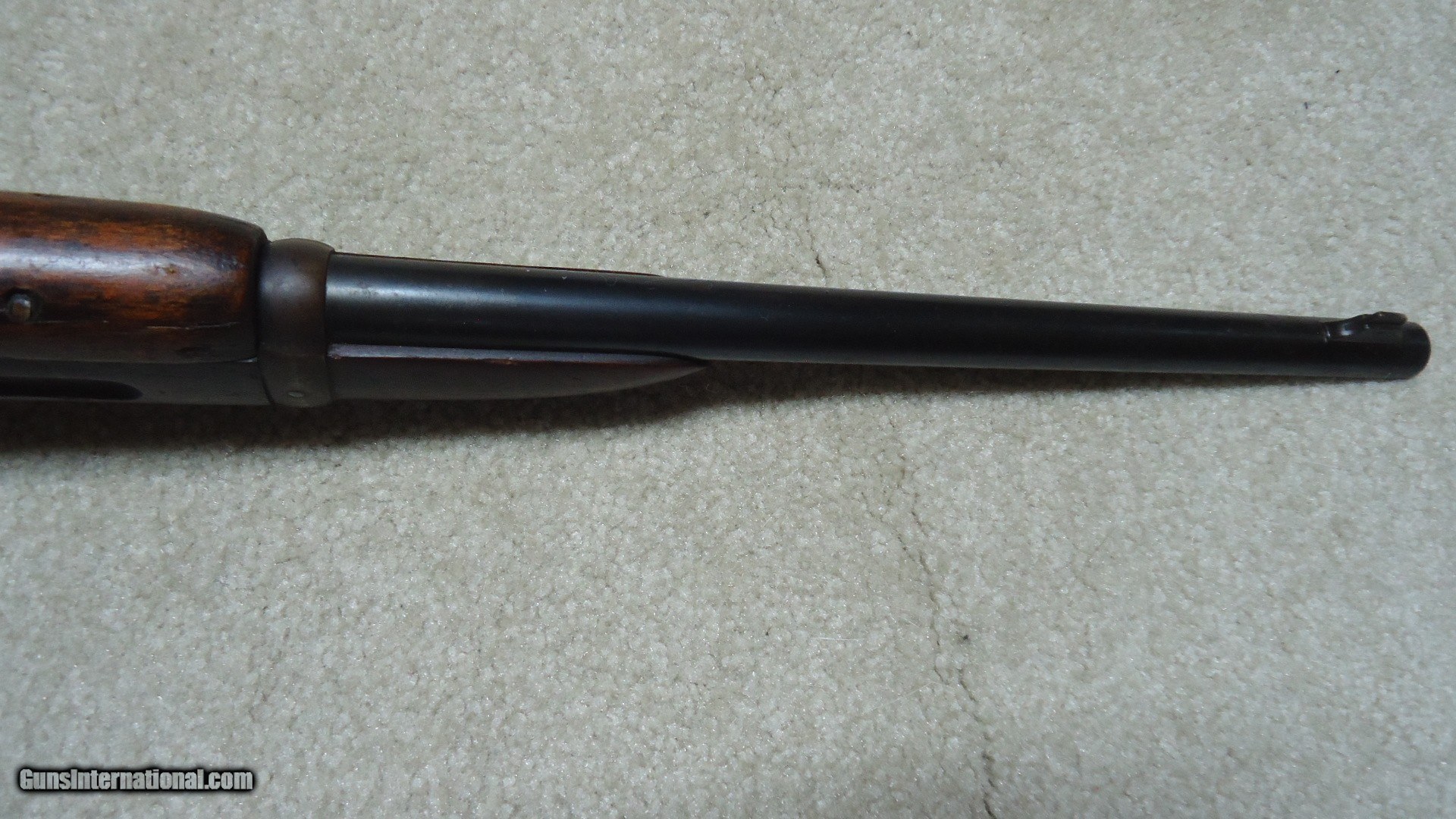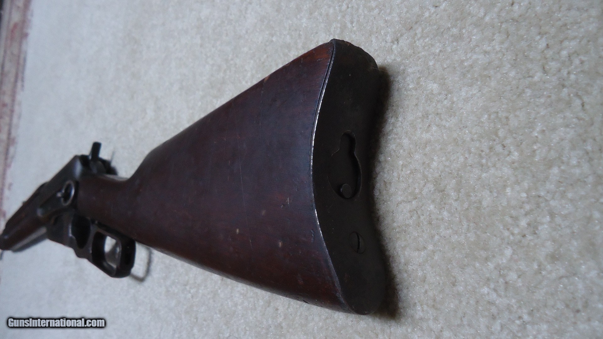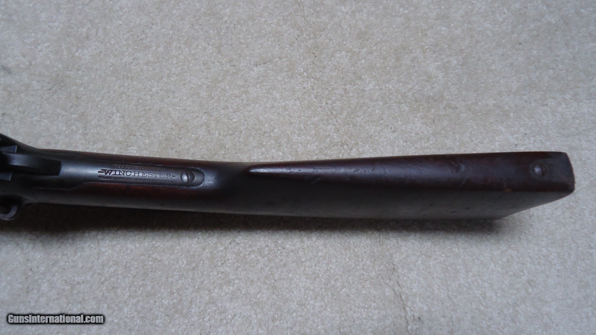 Description: 1895 SADDLE RING CARBINE, .30 ARMY (.30-40 KRAG) CALIBER, #109XXX, MADE 1915. These '95 carbines have become very difficult to find. Favorites with the Texas and Arizona Rangers as well as with cowboys especially in the southwest, most of these carbines that come to light show hard use and frequently are absent the walnut hand guards. This one is is complete. The barrel retains fine slightly aged blue with minor freckling and the receiver retains good somewhat aged blue on the sides, magazine sides and on the bolt. The balance has aged to brown. Fine markings and original rear sight with slide intact mated with correct front sight. The butt plate upper edge portion is pitted over the top, but never cleaned or buffed. The screws are excellent. Butt stock and forearm show light handling with tight wood to metal fit.- looks like the rear bottom of the forend has a "17" or perhaps "LL" scratched in just ahead of the receiver , might also be a brand. The hand guard has the usual crack, but this one was carefully and neatly repaired with walnut "patches" inletted perfectly over the crack and making it quite solid. Bore is sharp and excellent, action is tight. SOLD Curio/Relic: Yes Rifle Caliber: .30-40 Krag Manufacturer: Winchester Model: 1895 Serial Number: 109XXX Barrel Length: 22 Condition: VG+ |