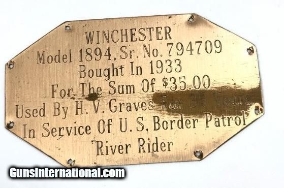 Description: What an awesome old gun! Purchased in 1933 for $35 and used for 35 years in the field by US Border Patrol 'River Rider' Agent H.V. Graves. Comes with the brass/bronze placard. Beautiful old gumwood stock. Has a few old dings and bruises from use. Crack in the forarm on the left side from the tip to the band. Rebarreled sometime in the early to mid 1900's by Alamo Gun Co. Has a Lyman front sight and ladder style carbine rear sight. Barrel bluing is in good condition, with most remaining. Some scattered bluing loss and light scratches. Receiver shows some finish loss at the high edges, with greater than 50% bluing remaining. Saddle ring is in good condition. Bore is in great condition, bright, with good strong rifling. Winchester Model 1894 chambered in .30 W.C.F. (30-30) with a 16" barrel Overall length is approximately 34-1/4 LOP is approximately 12-7/8" THIS GUN IS C&R Eligible. Made between 1916. Will require 03 or 01 FFL for transfer. SHIPPING CHARGES ($30) INCLUDE A TRACKING NUMBER & INSURANCE FOR THE FULL SOLD VALUE ________________________________________________________________________ For payment, I accept Postal Money Orders, and Certified Cashiers Checks Please email FFL / C&R / or Identification to the email address found in "Seller Contact Info"