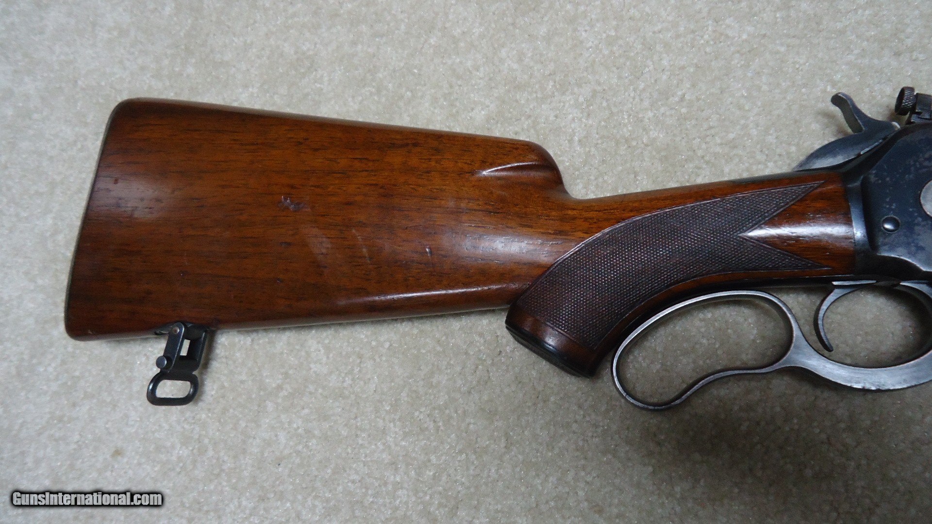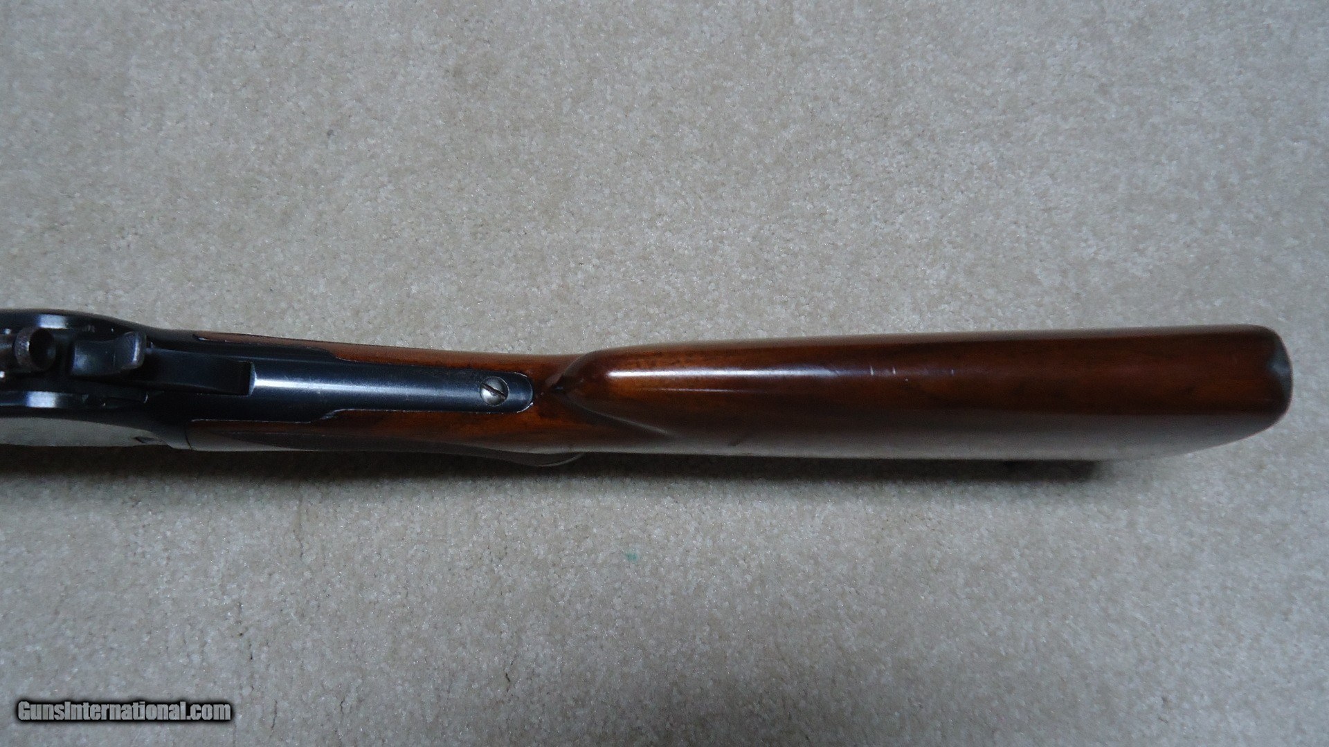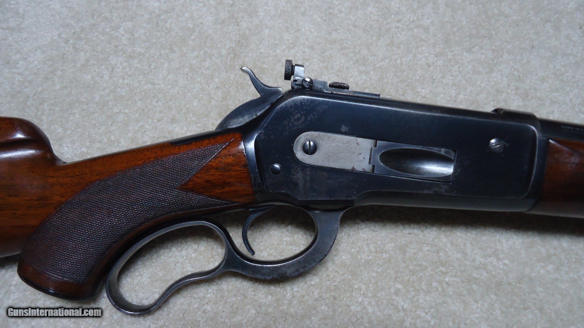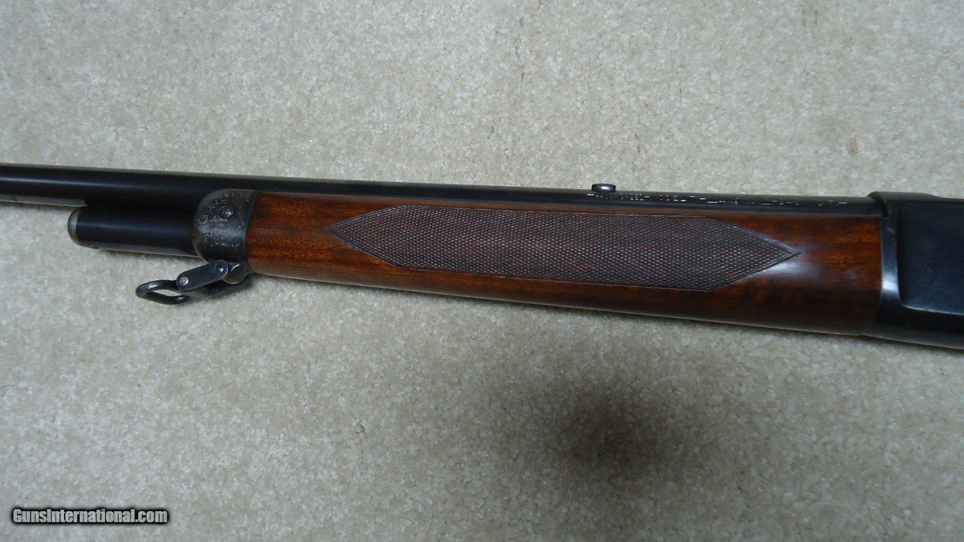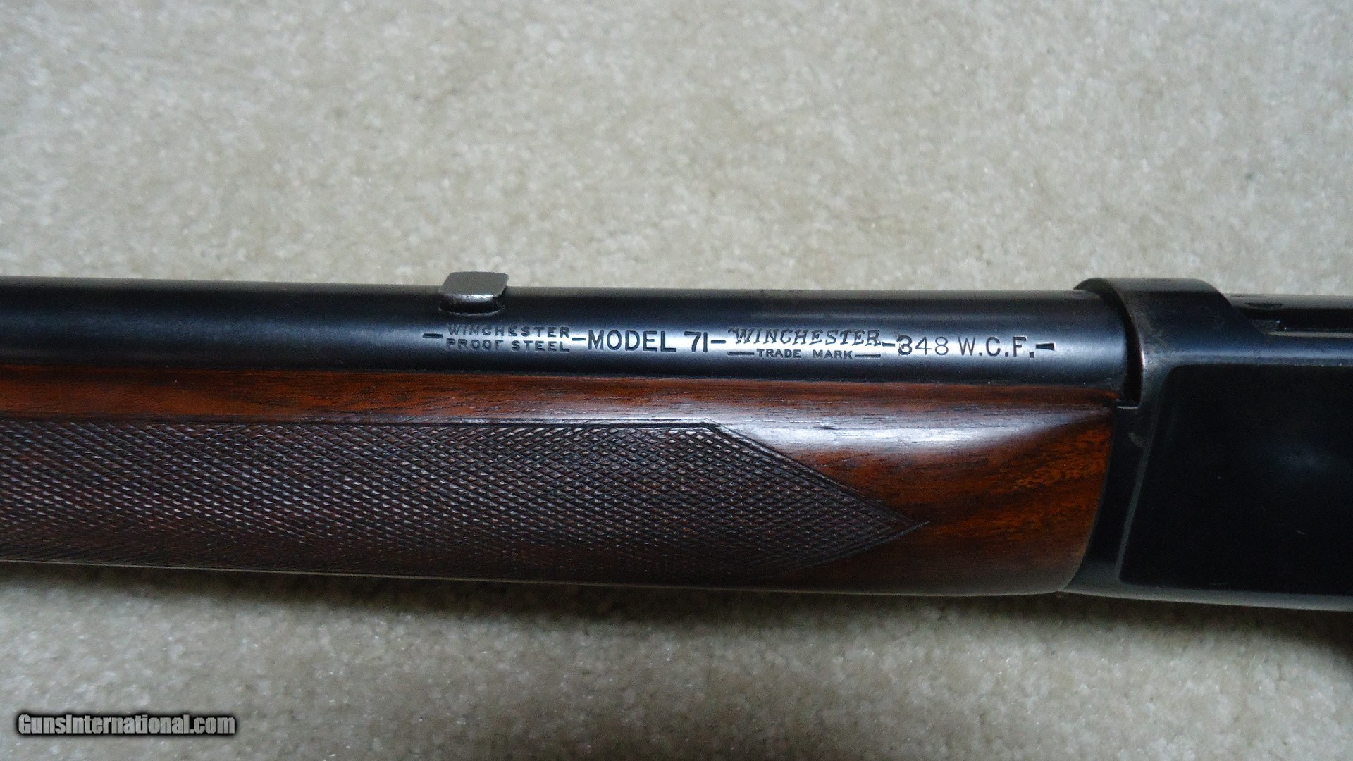 Description: PRE-WAR, GREAT DEPRESSION ERA, 2ND YEAR PRODUCTION MODEL 71 DELUXE .348 WCF WITH LONG TANG AND BOLT PEEP SIGHT, #11XXX, MADE 1937. This is a fine example that has seen some normal handling/hunting use, but no abuse. The barrel retains nearly all the original deep blue as does the magazine. It still retains the front sight hood and has the correct filler blank for the rear sight dovetail. The forend cap shows good flaking blue and the receiver shows some light flaking/wear to the bottom, on the left rear corner of the receiver and on the right side just above the lever/receiver juncture- all light wear mixing a little brown and most of the blue is intact elsewhere. the bolt shows excellent bright blue. The bolt peep sight is intact and even the upper tang retains nearly all the blue. The stock and forend are generally excellent with sharp checkering, tight wood to metal fit, correct Winchester embossed pistol grip cap and checkered steel butt plate. It also is complete with the correct super grade sling swivels. The bore is minty bright and the action is tight. A really early 84 year old deluxe 71 with bolt peep in nice condition. SOLD Curio/Relic: Yes Model: M-71 DELUXE Serial Number: 11XXX Barrel Length: 24 Condition: EXCELLENT Bore Condition: EXCELLENT |