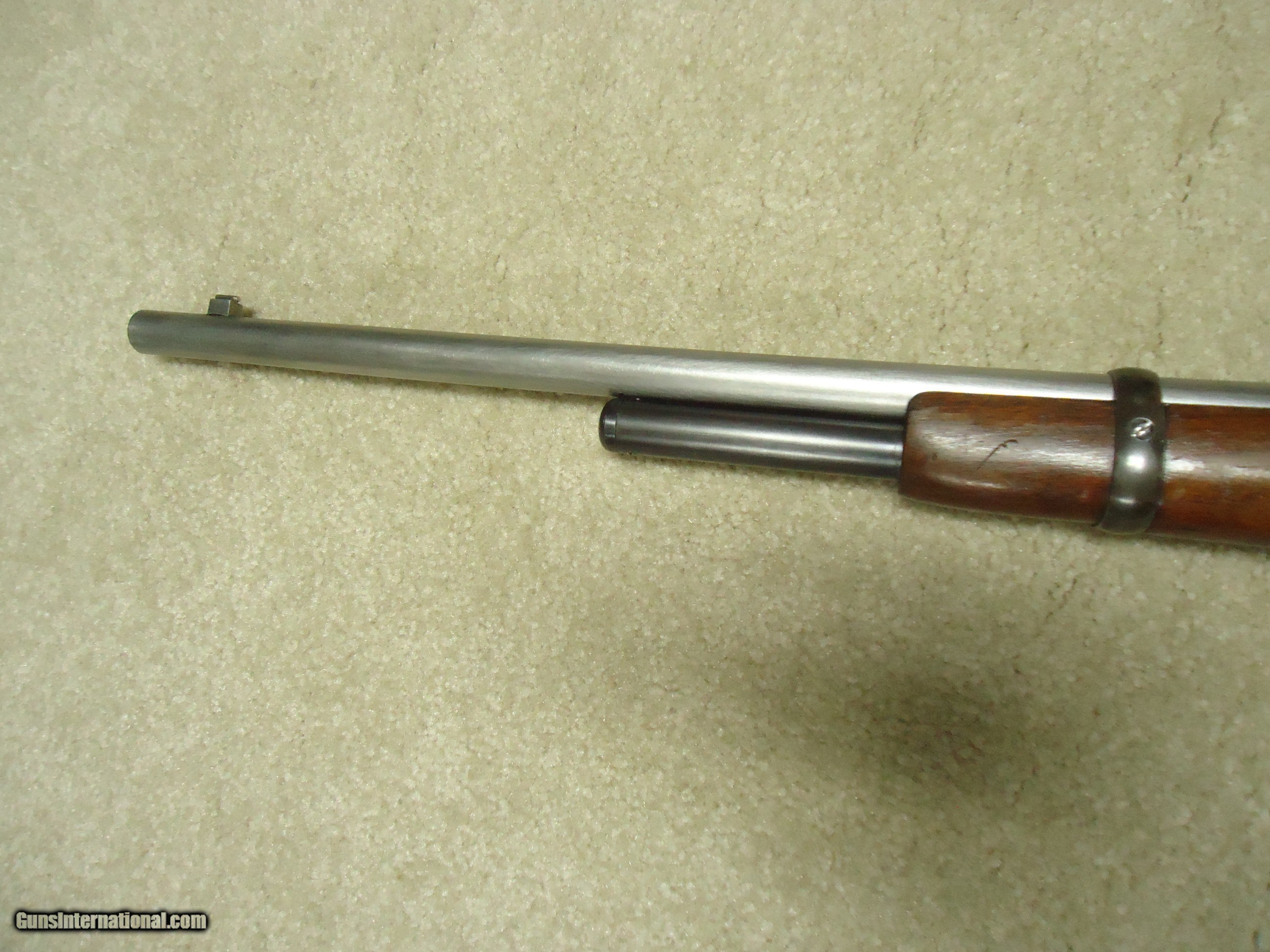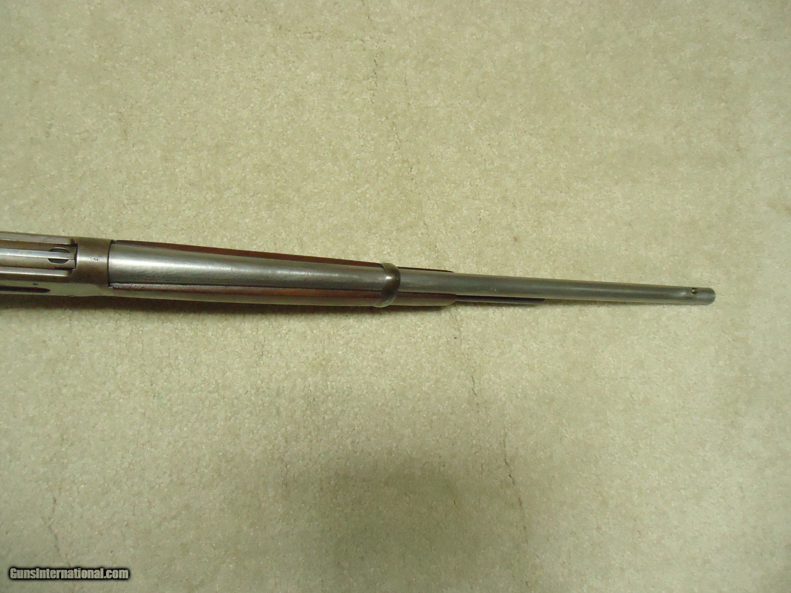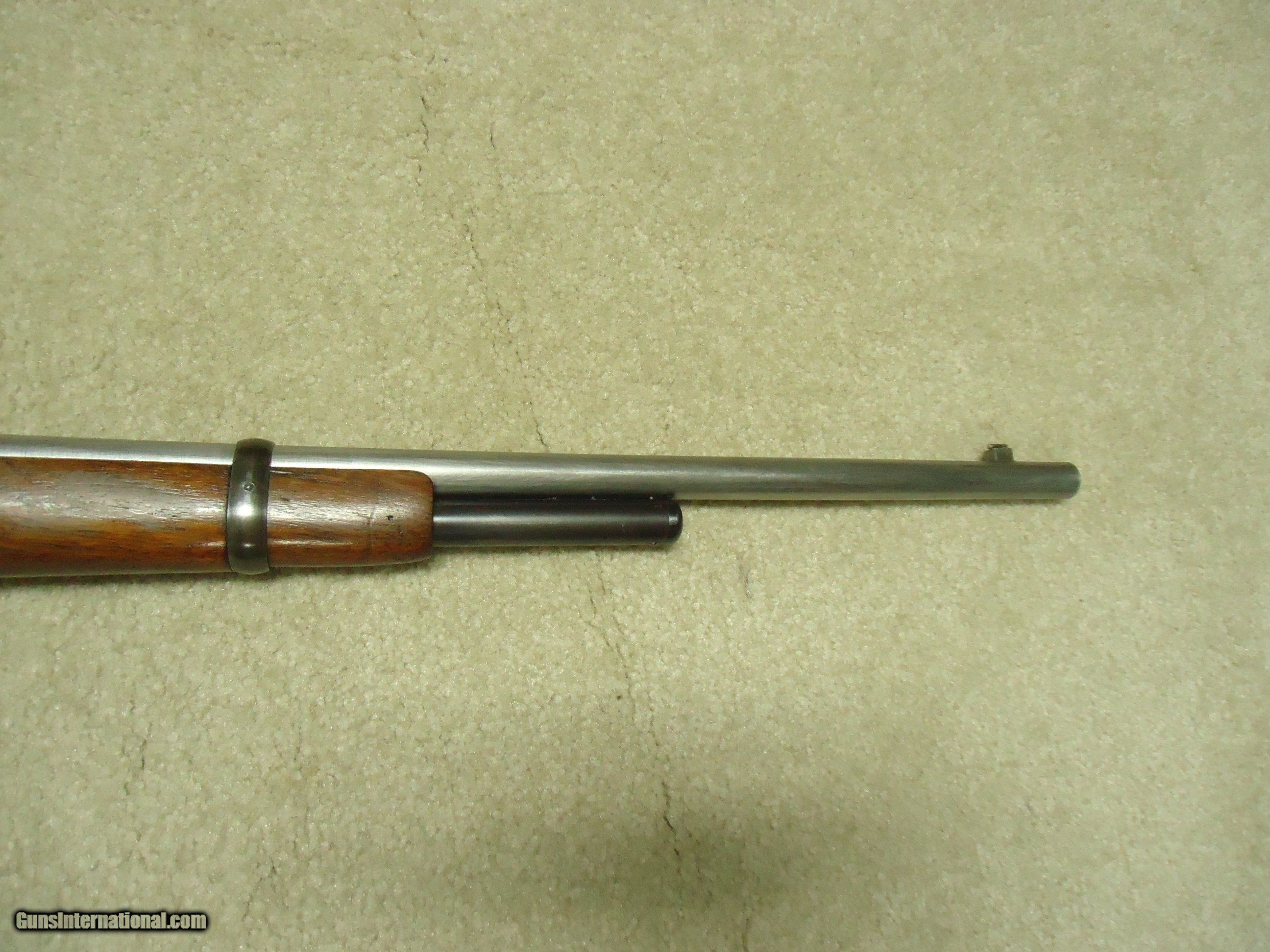 Description: A TRULY ONE-OF-A-KIND MODEL 1894 SADDLE RING CARBINE! I'm not sure I've ever offered, much less seen, a unique 1894 of which there are no others identical; but here it is! This one is is chambered in .38-55 and has a plain pistol grip with late-style serrated steel shotgun butt stock. It also has a 2/3 magazine... now here's the kicker, IT HAS A STAINLESS STEEL BARREL MADE WITHOUT A REAR "SEAT" OR DOVETAIL for a rear sight. The serial number is 1038XXX which places it as manufactured in 1928. This is important as the stainless steel barrel option was only offered from about 1926-1931 and was rarely ordered. Any stainless steel barrel '94 is a rarity, but one made without a rear dovetail and placed on a pistol grip saddle ring carbine is pretty much unheard of. Add to that the .38-55 chambering at such a late date, and I'd think that unless someone ordered two identical carbines like this, it is a one-of-a-kind! This one has the correct factory proof marks on the receiver and barrel. The stainless steel barrels could not be blued, so they were "Japanned" finished (like a black paint). As this tended to scratch and peel off, usually owners of these simply steel-wooled off the remaining black finish. Such is the case with this example. There are faint scratch lines indicating this was done. The barrel has the correct late style "MODEL 94" and "-STAINLESS STEEL-" markings. The 2/3 length magazine tube retains fine blue and there is still some good blue on the barrel band. The receiver blue has mostly dulled and flaked to a brownish-gray with some aged blue more on the left side panel. Fine deep blue on the loading gate and lever . Possibly some cold blue was rubbed on at some point- easy to remove. The saddle ring is intact. Stock has the correct Winchester embossed pistol grip cap and has the “fluted” comb typical of stocks made in the late 1920s. Exc. stock and forend. Wood shows light handling only. The upper tang is fitted with a later unmarked Lyman or Marble tang sight in the factory holes. Appears the rear tang screw too long and is not pulling the lower/upper tangs tight as the upper tang appears raised slightly from the wood. All very minor. Tight action, strong safety half-cock and perfect bore. SOLD Curio/Relic: Yes Rifle Caliber: .38-55 Winchester Manufacturer: WINCHESTER Model: M-94 STAINLESS SRC Serial Number: 1038XXX Barrel Length: 20" STAINLESS ST. Condition: VG Bore Condition: EXCELLENT |