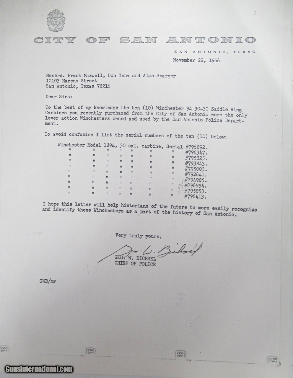 Description: Winchester Model 1894 Saddle Ring Carbine; Serial No. 793843; Made 1916; One of 10 Sold to Donald Yena on November 22, 1966 by City of San Antonio, Texas Police Dept.; 30 W.C.F. Caliber; All Original, 1 of 10 Documented Rifles (Fake ones are out there); Nice Original Condition with Lots of Original Blue and Wood Varnish Present; Perfect Action and Bore; Formerly of the Charles Schreiner Collection; Lots of Documentation Included; Very Rare 106 Year-Old Historic Texas and San Antonio Police Dept. Winchester Rifle; NOTE: SOLD at BURLEY MARCH 1, 2014 for $19,000 + BUYER'S PREMIUM; See All Photos for Condition; No Texts; Call (254)541-5765 or Email Only; PERSONAL PROPERTY of Harold Wieser; NOTICE: We Do Not Do Any Consignments - All Items Listed are Owned by Us - NO SALES to New Jersey or New York City - Antiques Only to Massachusetts and California; Price: $14,975 + $75 S&H Via USPS PRIORITY MAIL; Payment Address: Harold Wieser - 1466 U.S. Hwy 77 - Rosebud, TX 76570; SEND PAYMENTS VIA USPS PRIORITY MAIL; BEWARE of SCAMS!!! – DO NOT SEND MONEY or CORRESPONDENTS ELECTRONICALLY UNLESS YOU HAVE SPOKEN to HAROLD WIESER FIRST! 254-541-5765 SOLD Manufacturer: Winchester Model: 1894 Serial Number: 793843 |