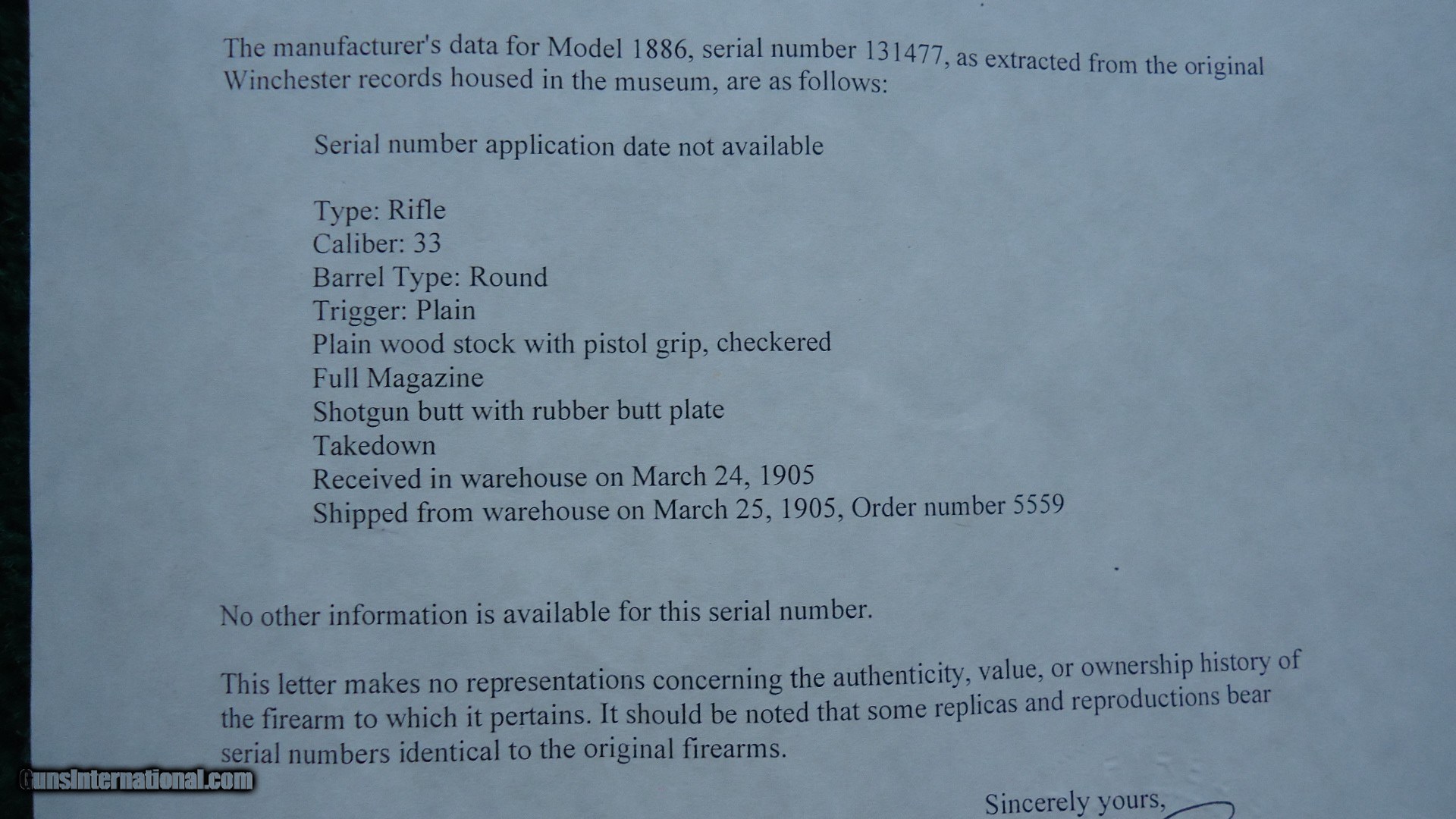 SPECIAL ORDER WINCHESTER MODEL 1886 RIFLE IN CALIBER 33