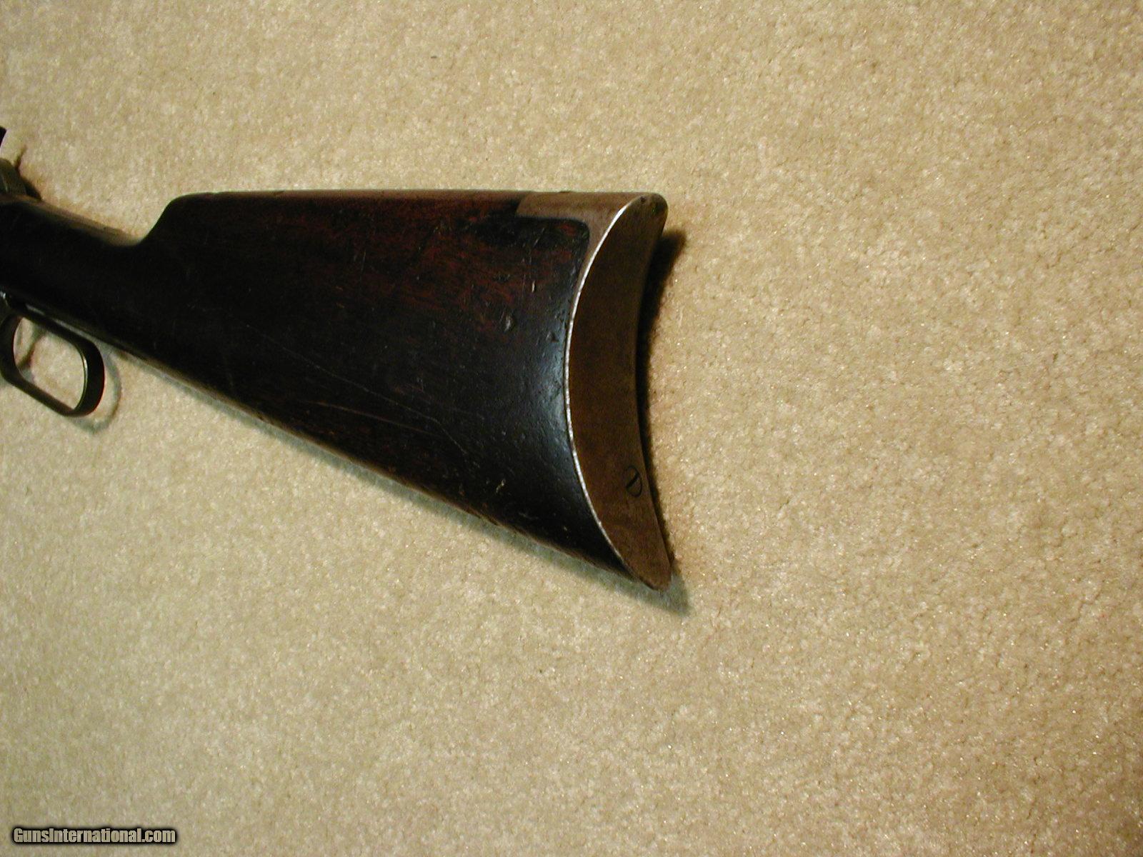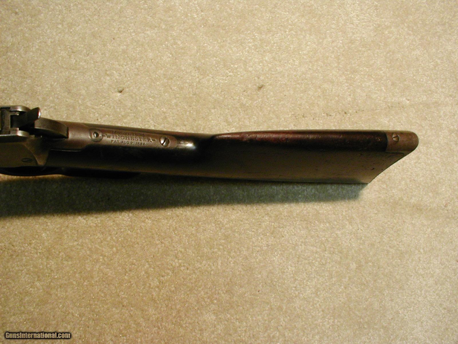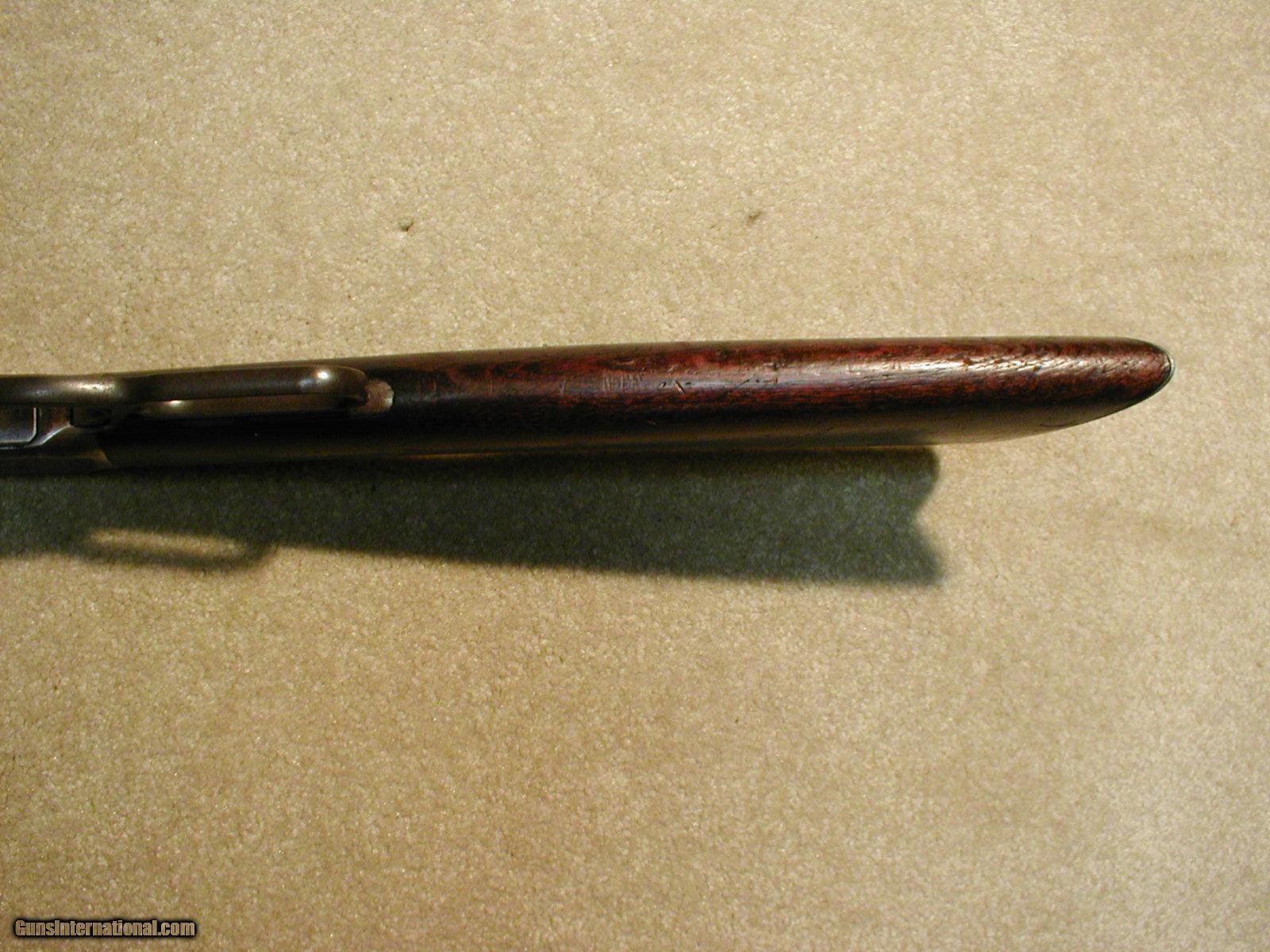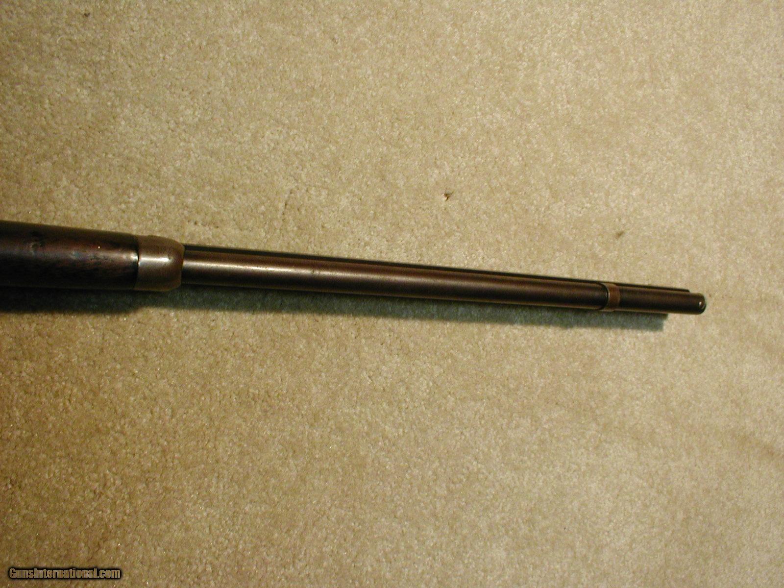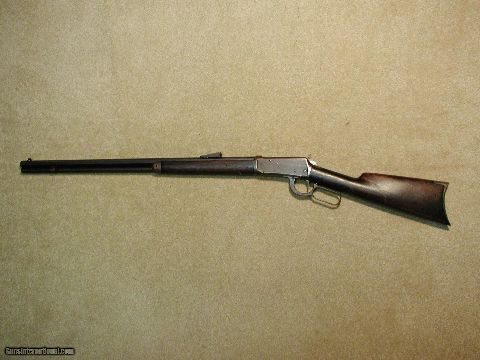 Description: PROBABLY FIRST INTRODUCTORY YEAR MANUFACTURE FOR THE .32WS CARTRIDGE, 1894 OCTAGON RIFLE IN THE 220XXX RANGE, about as early as I've seen for a .32WS chambered 1894 that was introduced in 1902, the serial number on this one would indicate a 1901 manufacture date (no doubt the receiver was in the bin and not used until at least 1902 or later), has the correct "Smokeless Powder" rear sight used only on this model along with a blade/bead front sight, fine aged barrel and mag blue, aged receiver blue mixing heavily plum/brown, exc. screws, fine+ wood with normal light handling marks and tight wood to metal fit, tight action, bore a little dark and frosty, fine appearance and super early without any proof marks as introduced in 1905, attractive uncleaned appearance. SOLD Curio/Relic: Yes Manufacturer: Winchester Model: 1894 OCTAGON RIFLE Serial Number: 220XXX Caliber Info: 32WS Condition: fine Barrels: 26" oct |
