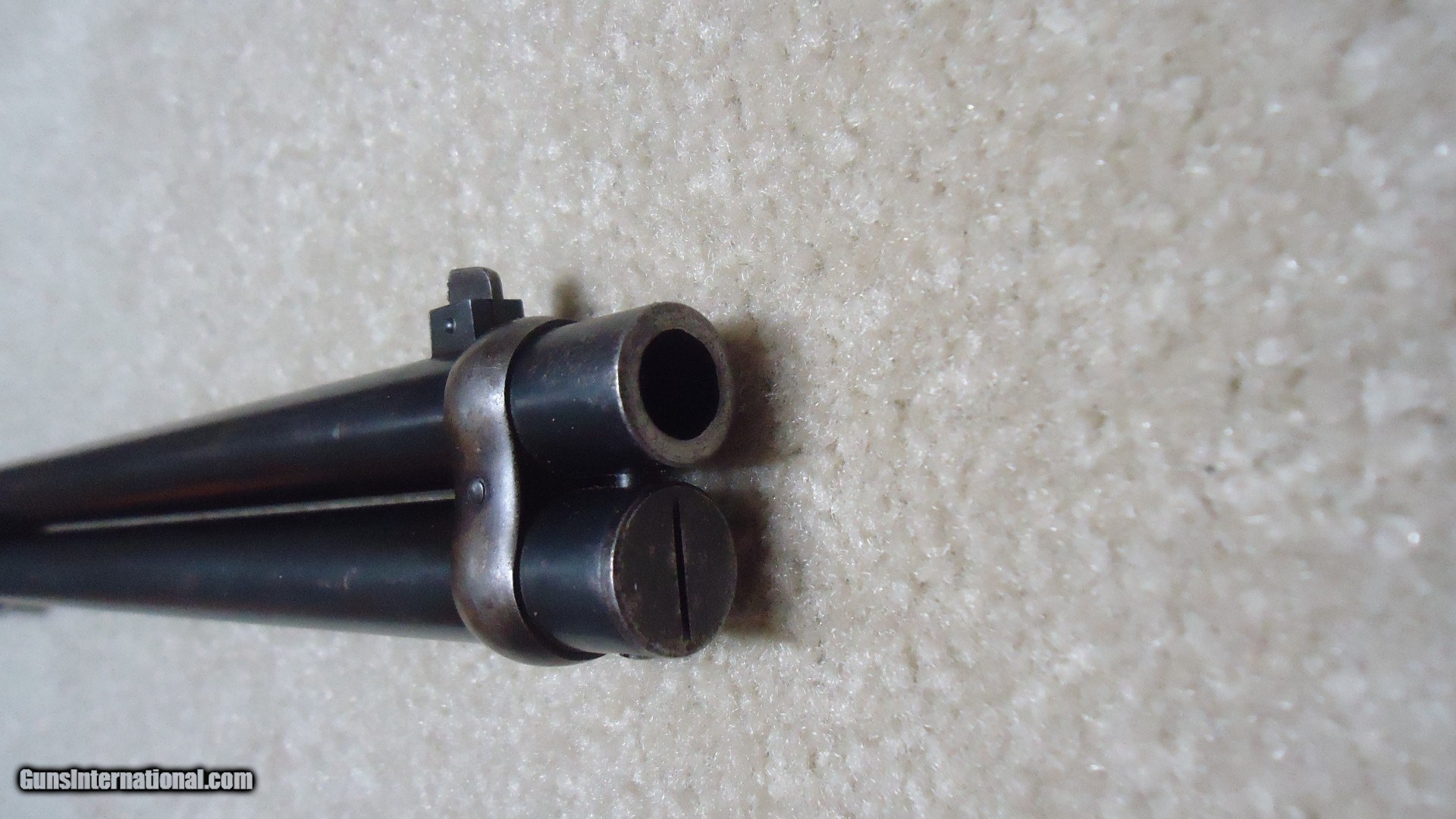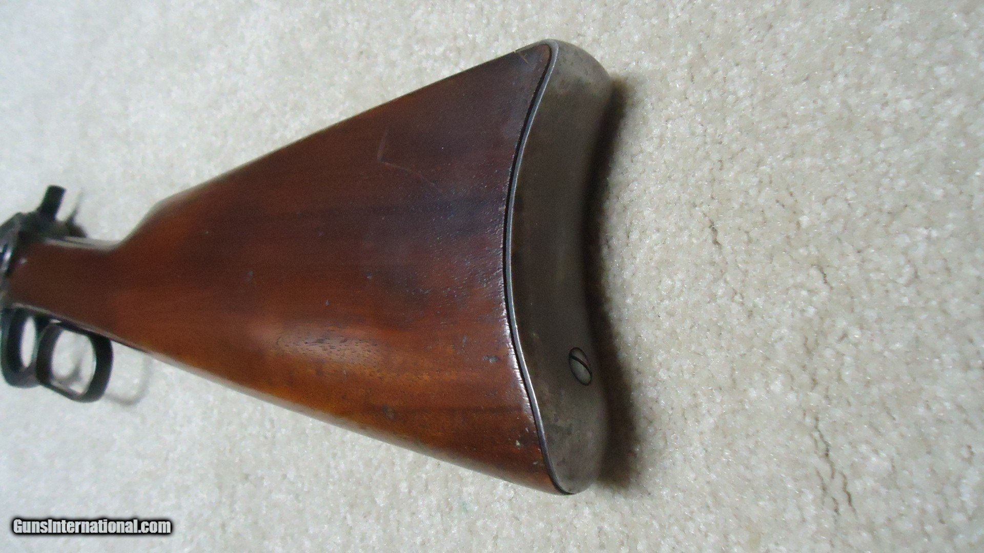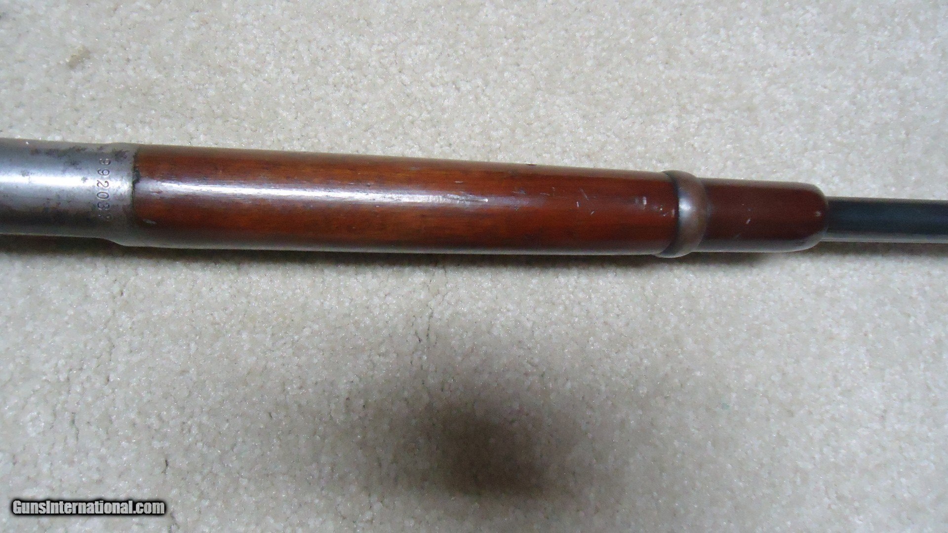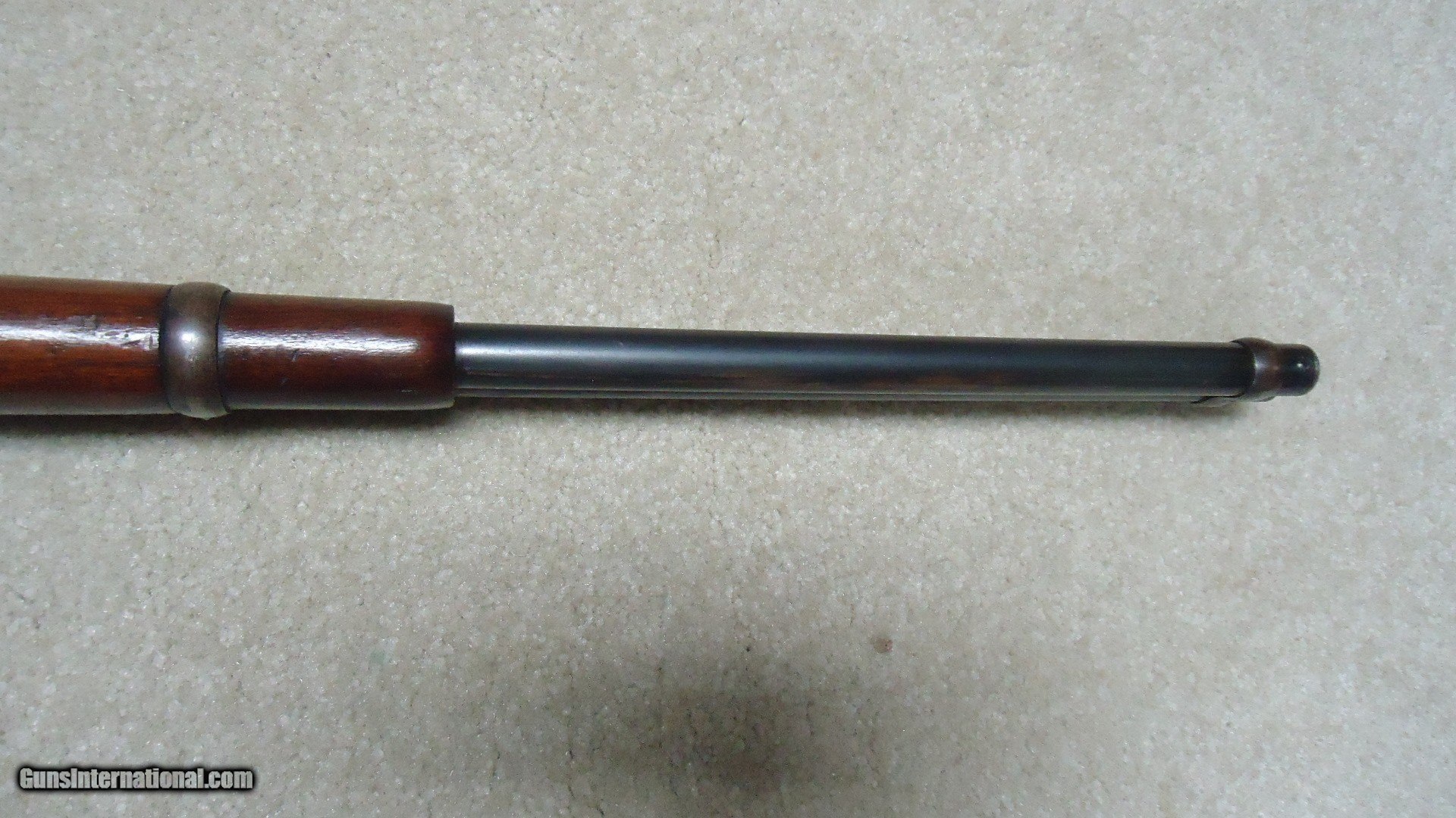 Description: VERY LATE 1892 SADDLE RING CARBINE, .38-40 WITH MINT BORE, #992XXX, MADE 1929. These late production saddle ring carbines are actually quite scarce and this one was made in the year of the Stock Market Crash that started the Great Depression. After this, there were very few 1892s produced. Exc. barrel and mag blue with only one small area of brown on the left bottom side of the magazine. It has the correct carbine ladder sight with slide intact and exc. late "MODEL 92" barrel markings. The receiver shows good blue on the side panels that is mixing with typical 1920s flaky brown- still lots of blue with exc. blue on the bolt and loading gate. Exc. walnut stock and forearm with tight wood to metal fit. Tight action and strong safety half-cock. Best of all is the minty-bright bore. SOLD Curio/Relic: Yes Rifle Caliber: .38-40 Winchester Manufacturer: WINCHESTER Model: MODEL 92 SRC Serial Number: 992XXX Barrel Length: 20 Condition: FINE+ Bore Condition: EXCELLENT |