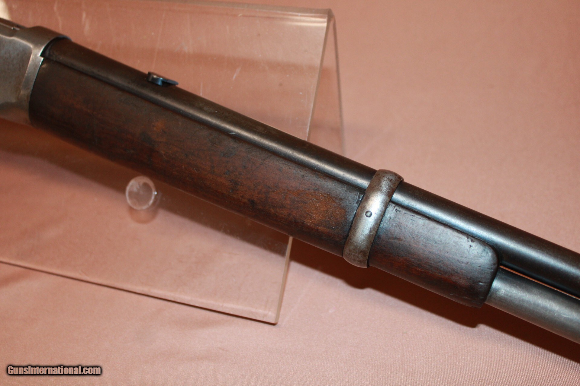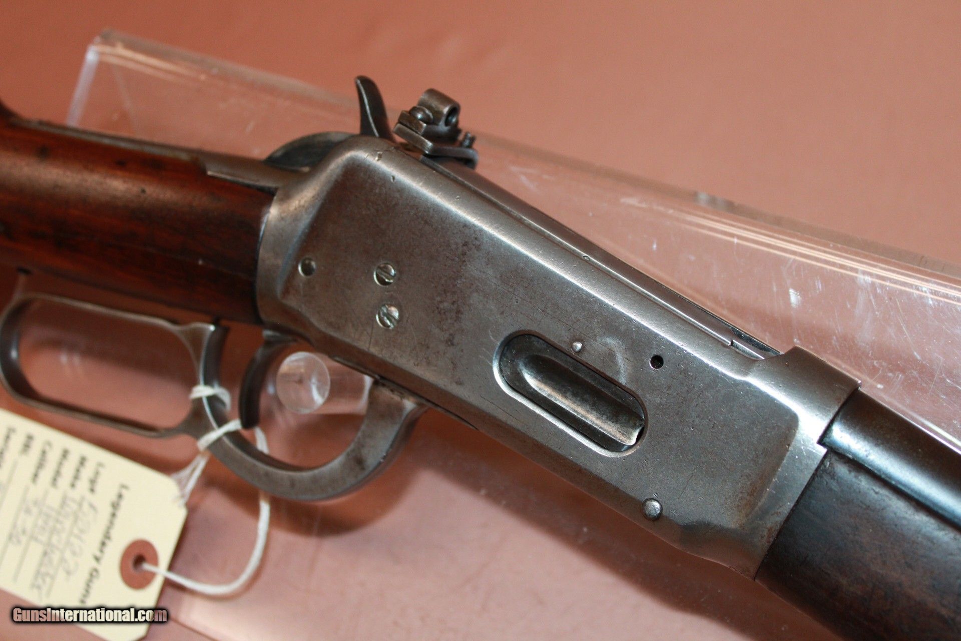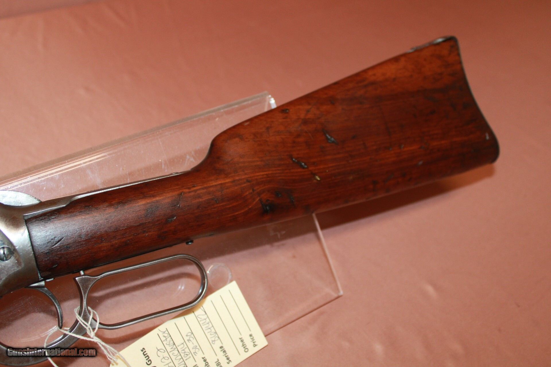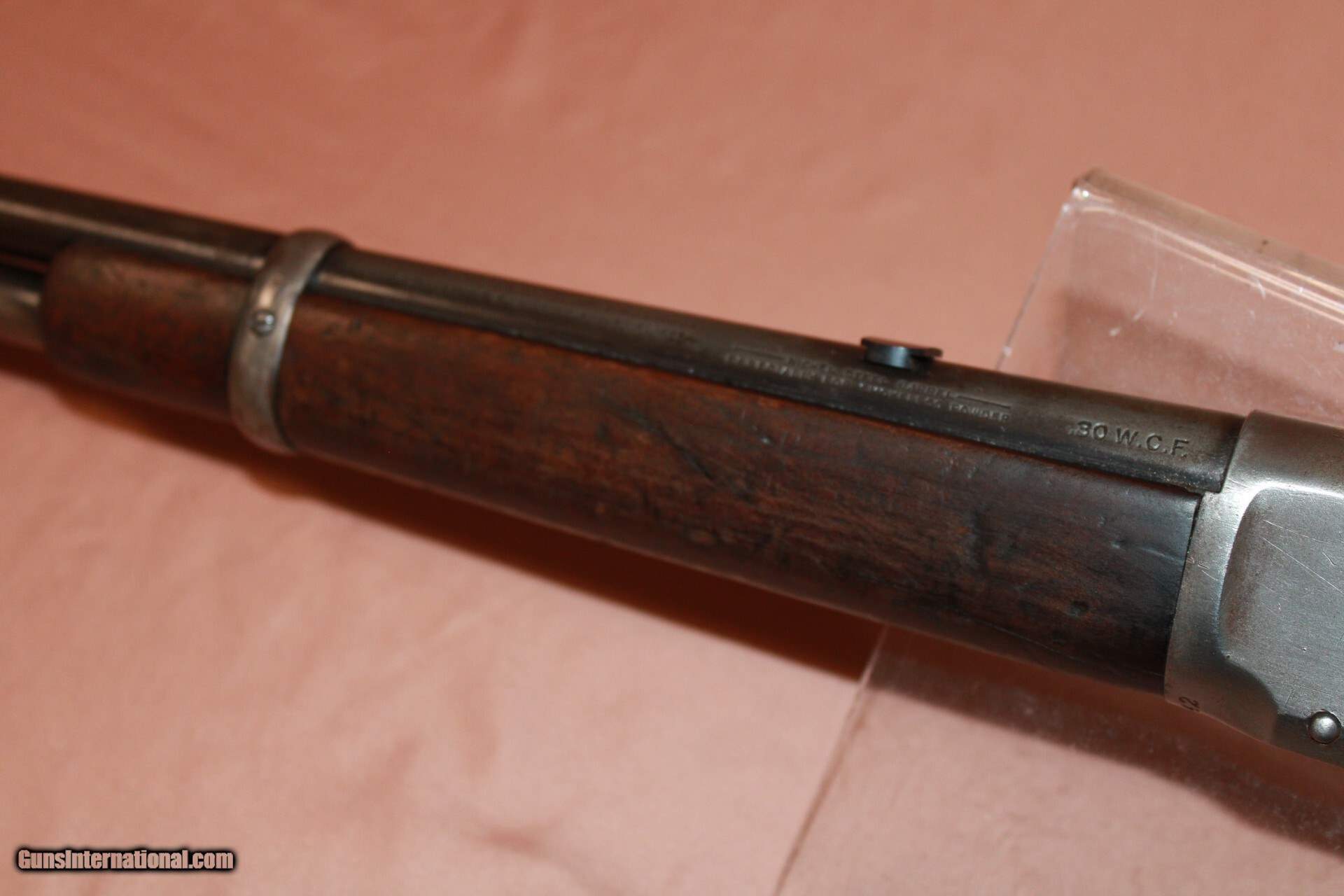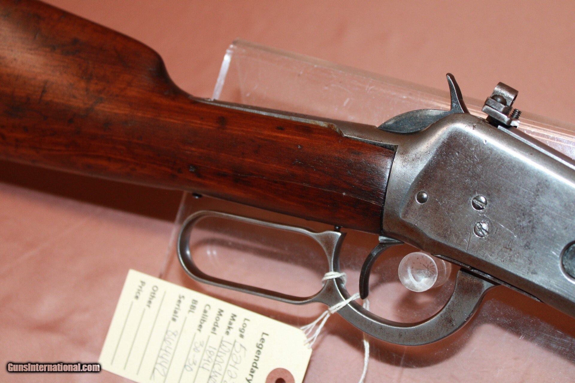 Winchester 1894 in 30-30 with a 20" round barrel, good bore. Rifle has a rear aftermarkert sight, stock is cracked, no rust very nice patina to the metal. Made in 1919