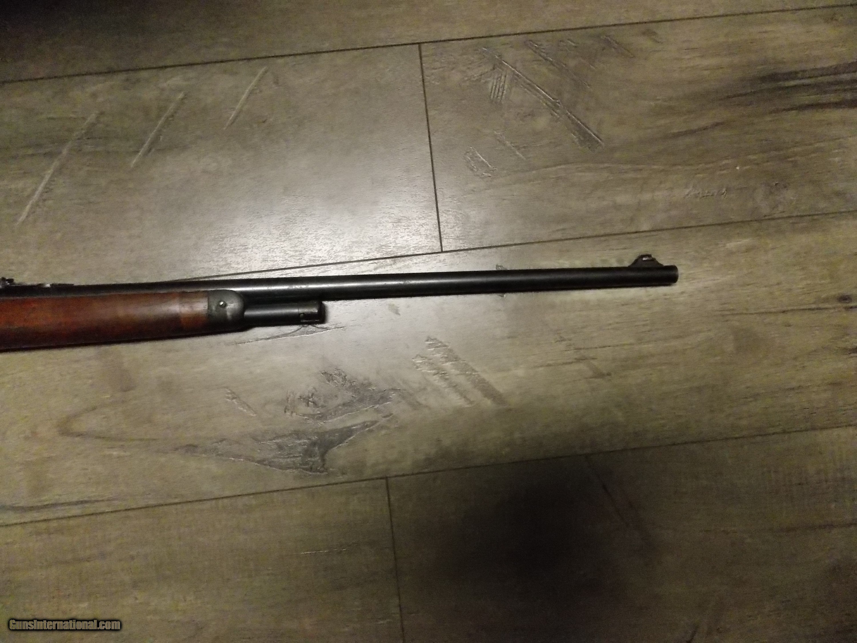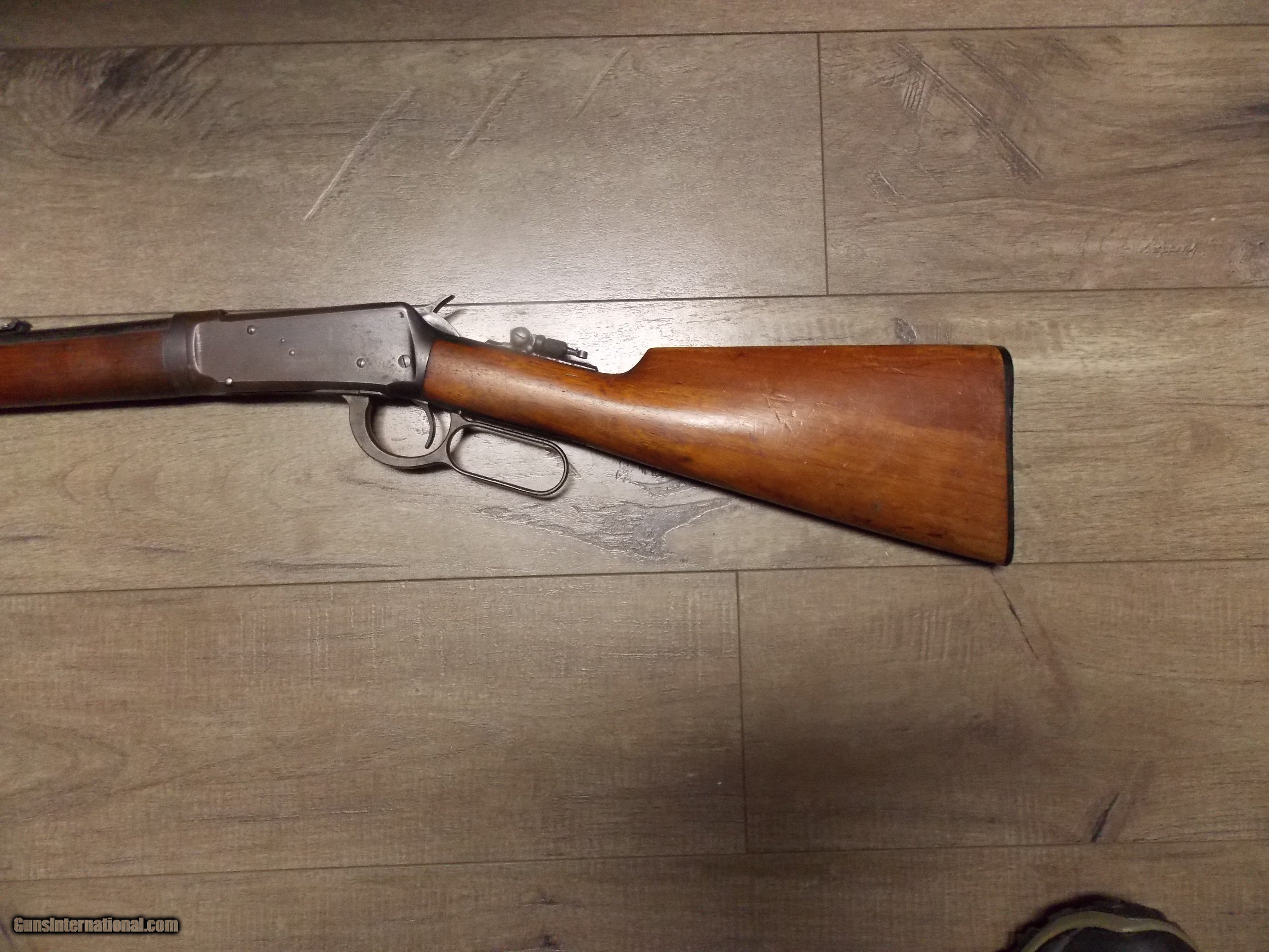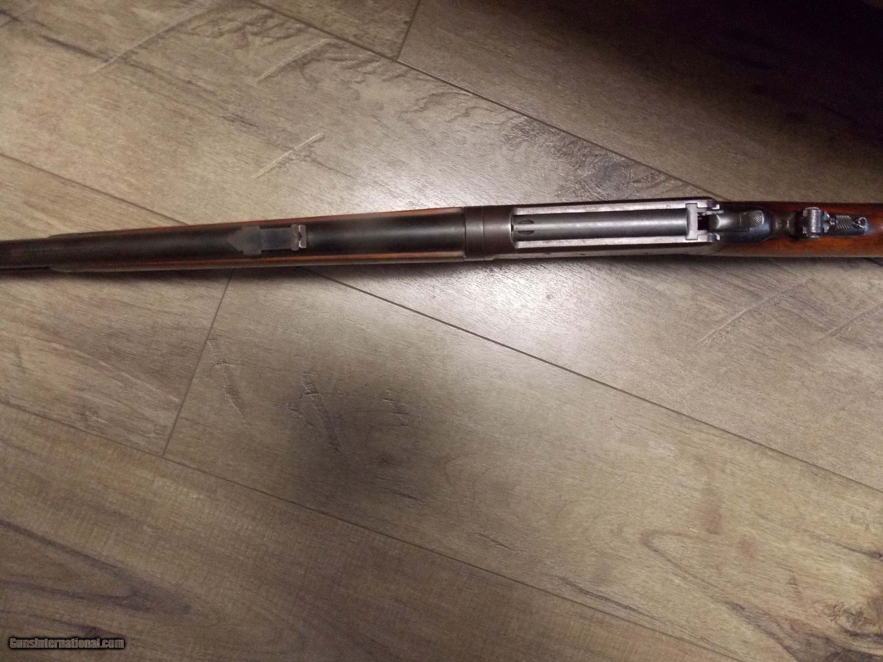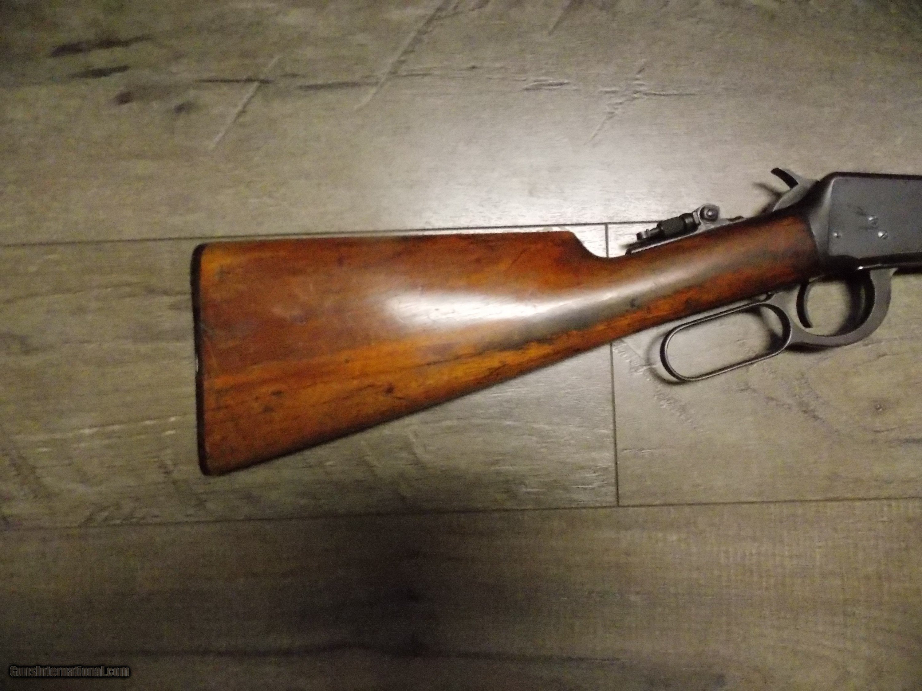Description: Winchester model 1894 rifle. Rare special order takedown model with 24" llight round barrel and shotgun butt. Gun has express rear sight, with marbles tang sight. Stock has shotgun butt with inlayed ebony buttplate. Bore is good, metal shows some light surface rust. Original finish is well worn, with dings and dents from use, no cracks in wood. Takedown is tight. Serial # range dates gun at 1907. SOLD Manufacturer: Winchester Model: 1894 Serial Number: 430xxx Barrel Length: 24 Bore: good Condition: fair Metal Condition: fair Wood Condition: fair Bore Condition: good |
