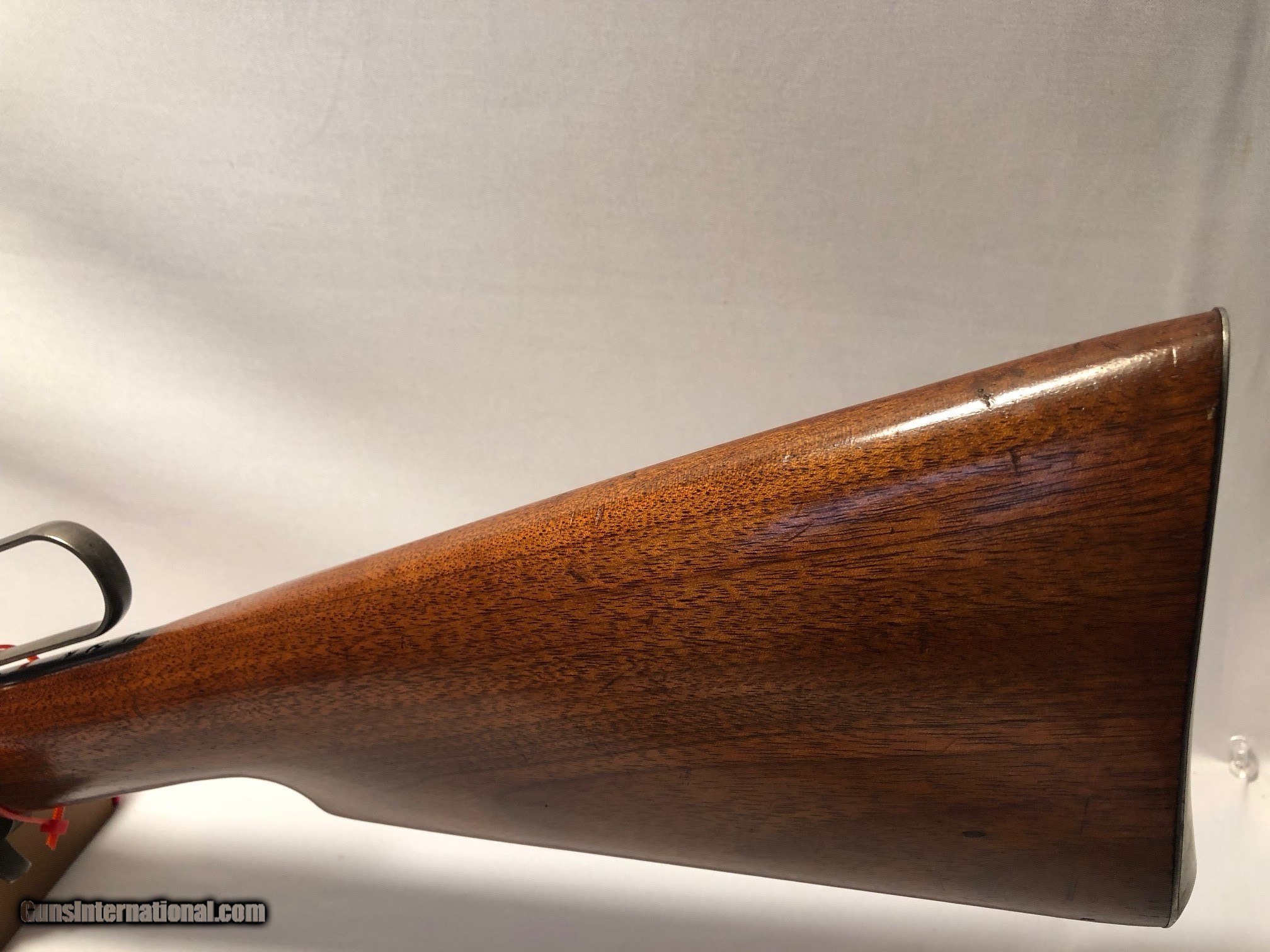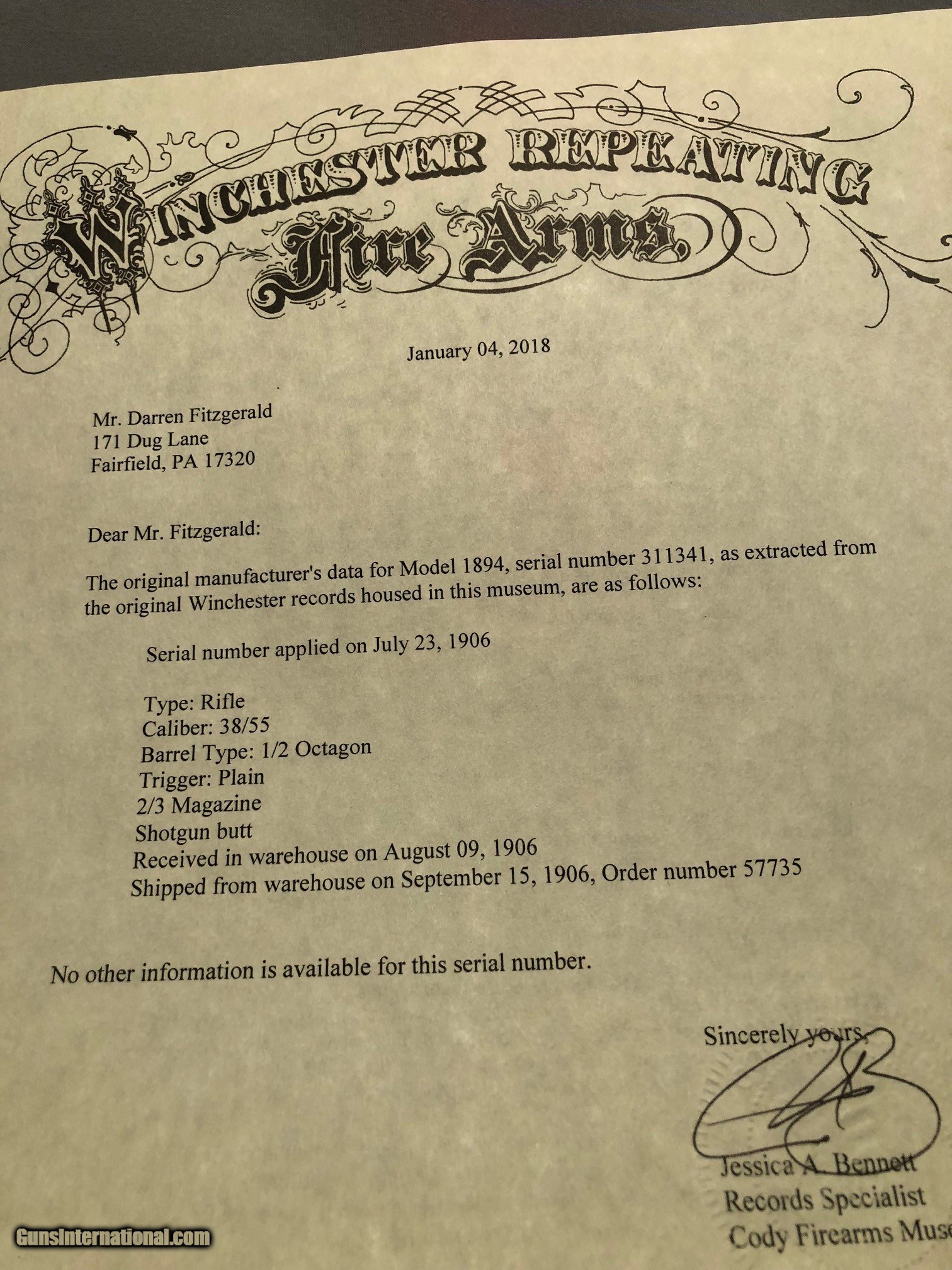 Description: A really fine 1894 38-55 special order rifle- half octagon, 2/3 MAG, steel shotgun butt. All original blue and varnish. Excellent bore and fire blue loading gate in the most desirable of calibers. "Collector Quality" MFG 1906 with Cody Factory Letter. SOLD Curio/Relic: Yes Serial Number: 311341 |