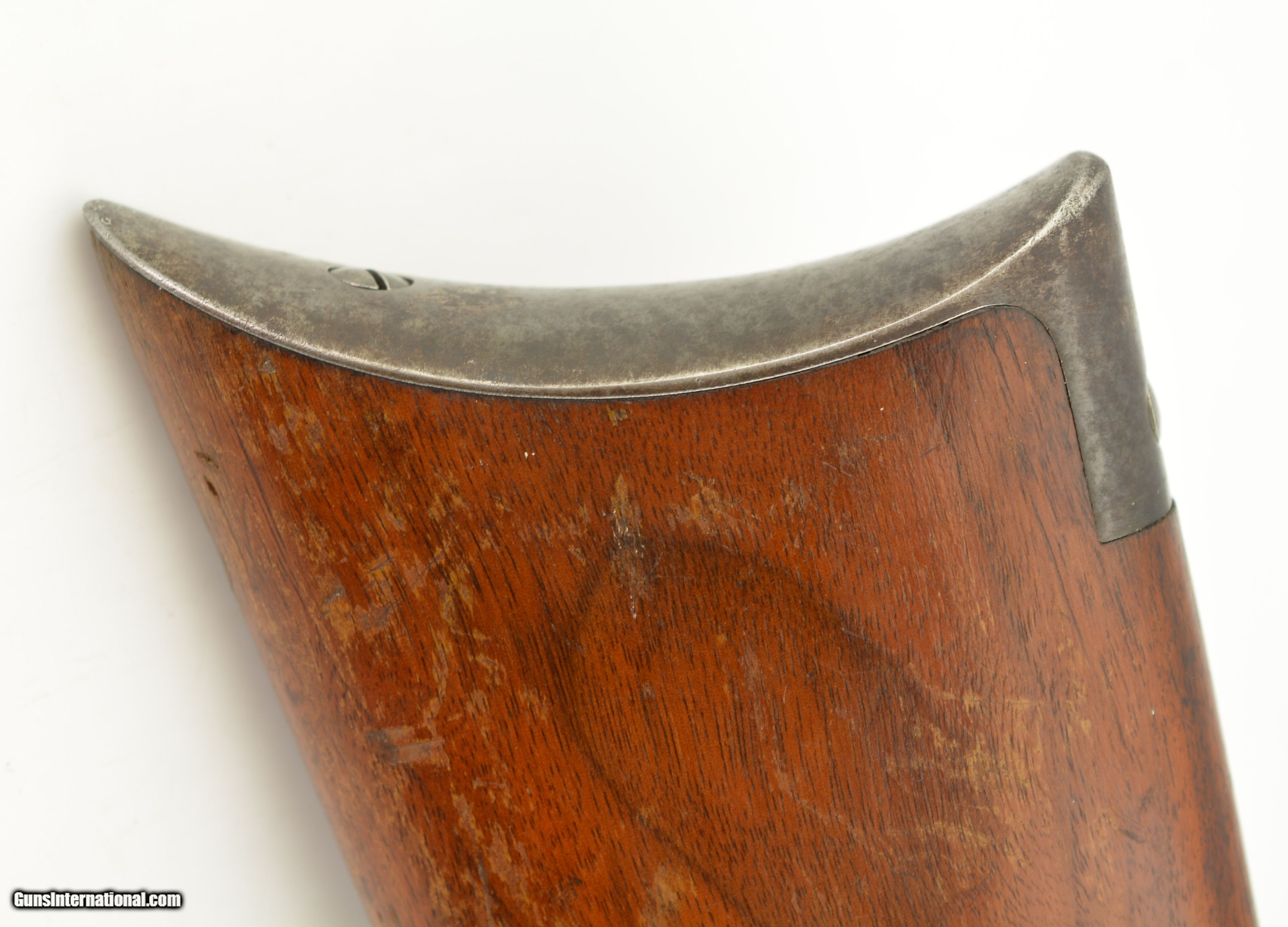 Description: Serial #751192, .32 Win. Spl., 26" octagon barrel with a fine, bright bore that has a small amount of freckling within the grooves about midway down. This is a 1914-made rifle that has retained 90-92% of the original blue finish on the barrel and magazine tube, with silvering at the muzzle, along the edges of the barrel facets, and gray metal on the magazine band. The receiver has a mottled, pewter gray patina with spots of plum-brown freckling throughout, and that carries over onto the barrel bolster. The hammer and lever retain about 70-75% of the original blue with the balance faded to freckled gray. The smooth walnut forend and straight-wrist buttstock have numerous minor handling marks and small blemishes in the slightly worn original oil finish. The crescent steel buttplate has a slightly darker patina than the receiver. This is a very nice T/D Winchester, with some honest wear, but also retaining a great deal of original finish. It would make a great addition to any collection. FFL or C&R SOLD Curio/Relic: Yes Manufacturer: Winchester Model: 1894 Serial Number: 751192 Caliber Info: .32 Win Spl Gauge Info: .32 Win Spl |