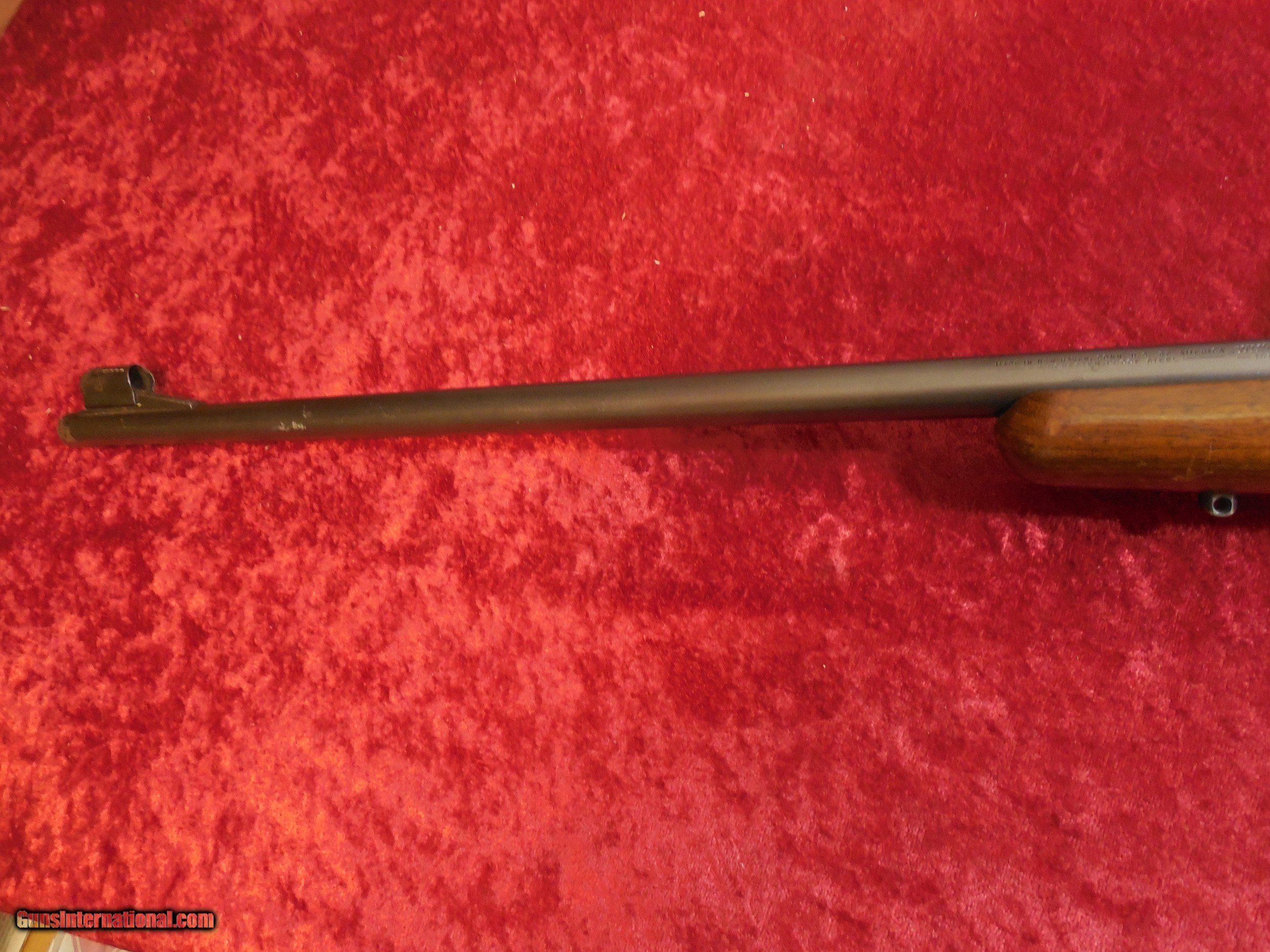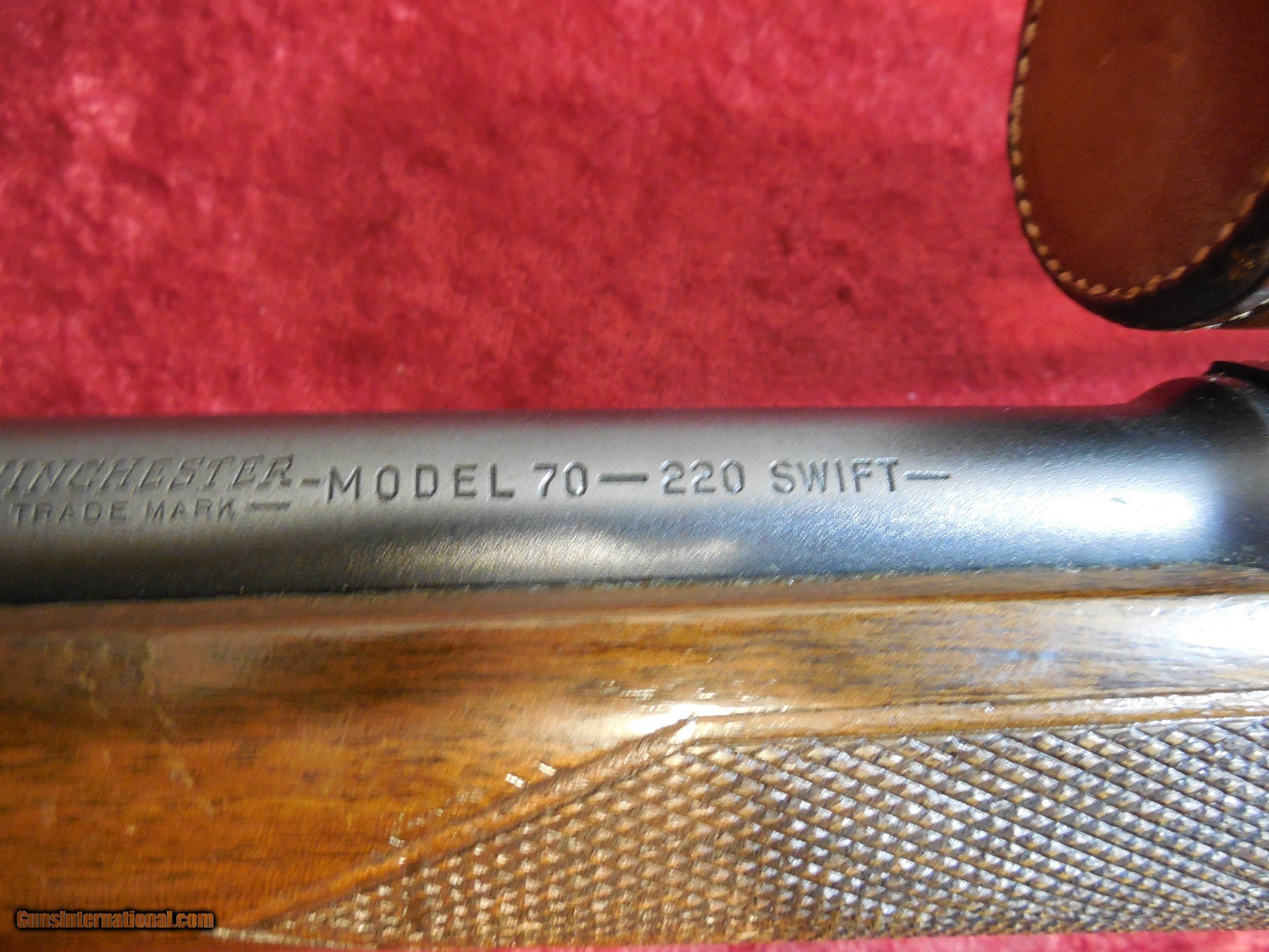 Description: Winchester Model 70 bolt action rifle .220 swift w/Scope Pre '64 American Icon -- Great Ladies Gun This used Winchester Model 70 bolt action rifle in .220 Swift cal has a 26" standard weight barrel which is glass beddd action & recoil lug -- professionally done, Pachmayr white line pad, 4 lb crisp trigger, Lyman Wolverine scope with fine crosshairs (Period scope with leather scope covers). Overall metal condition is 80% with light surface rust on the hood, bluing wear at the tip of the barrel and a couple marks on the left side of the barrel. Bore is 90% with good rifling. Wood is 85% with handling marks and a couple of scratches from normal use. Please see pictures.