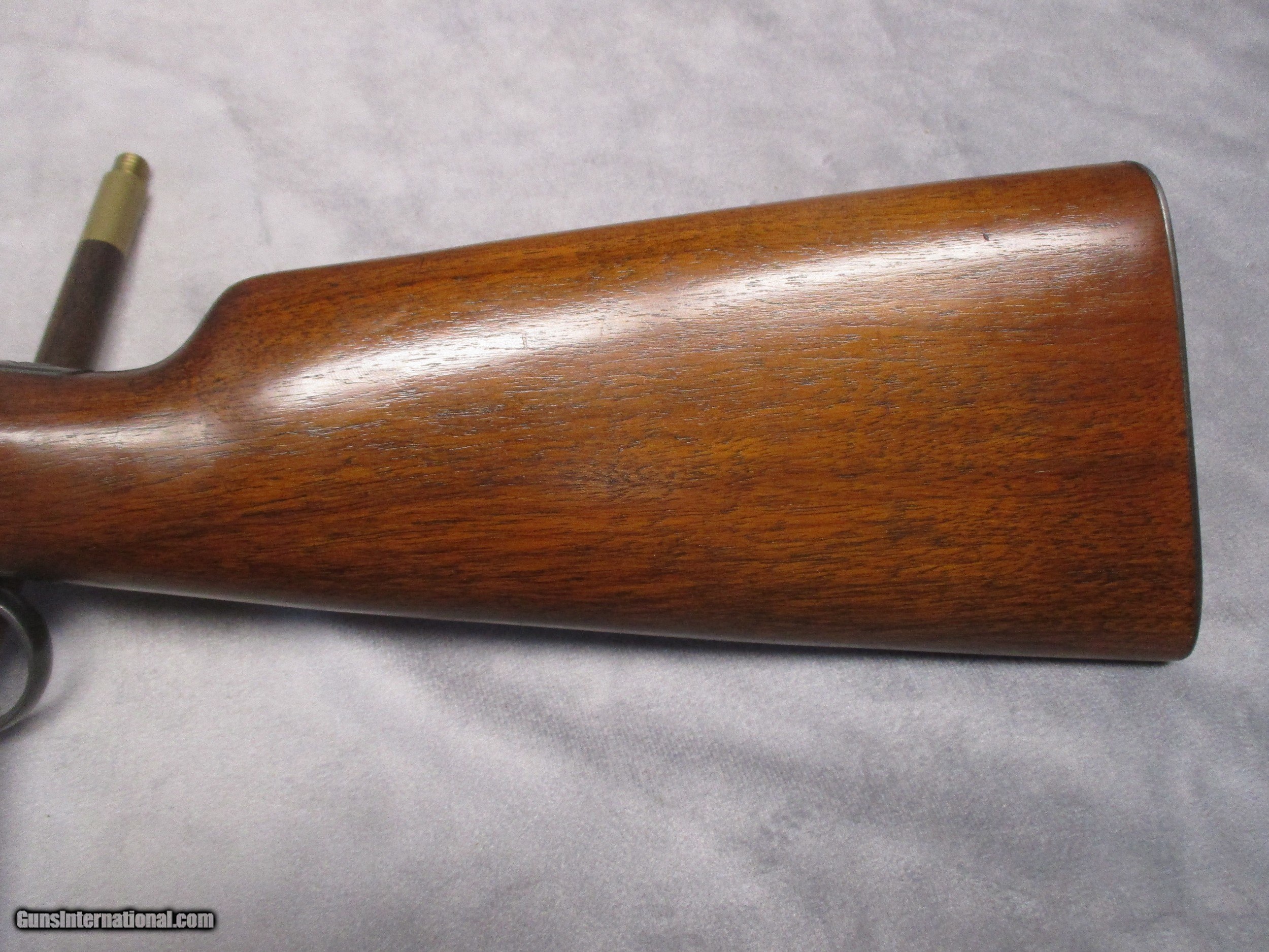Description: The Winchester Model 1894 is one of the most widely used rifles in history. It can be considered “The Deer Hunting rifle”, as it, along with the .30-30 cartridge, has arguably been used to take more deer than any other rifle/cartridge combination in history. Designed by the famous John Browning, the Model 1894 (often shortened to just ’94 or 94) was produced as the first commercial smokeless powder rifle, and in combination with the .30-30 Winchester round (introduced in 1895) set the benchmark for deer hunting rifle and cartridges everywhere. Indeed, the .30-30 Winchester is considered the benchmark round in the category of rifle cartridges suitable for deer hunting. This rifle is a pre-64 and is in excellent condition considering its age (71 years as of 2021). There are a few minor marks on the wood furniture, and few points of bluing loss on the lower tang. However, the overall bluing is in roughly 98 percent condition and the wood finish is perfect. There are some light scratches on the right hand side of the receiver. Some of the screws have been partly worn in the slot but should still work using a proper size flat head screwdriver. The rifle’s bore is in wonderful shape. This rifle would be at home with any Winchester collection. SOLD Rifle Caliber: .30-30 Winchester Manufacturer: Winchester Repeating Arms Co. Model: Model 1894 Pre-64 Serial Number: 1682663 Bore: Rifled Condition: Excellent Barrel Type: Round Action: Lever action Triggers: Single Stock: Walnut, straight grip Fore End: Walnut Butt Pad: Metal plate LOP: 13.0 inches (330mm) Finish: Blued Weight: 7 lbs. Sights: Iron – Buckhorn Elevator rear, Blade Front Sight, Sight Radius 16.75 inches (425.5mm) Manufacture Date: 1950 |