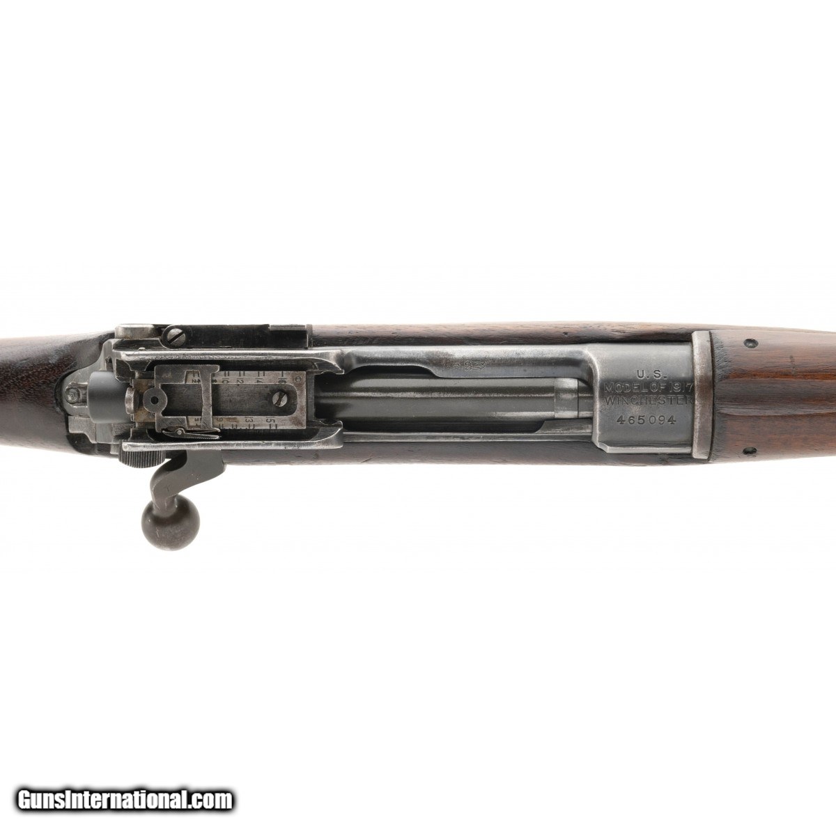SN: 465094. WWI U.S. military rifle made in 1918. The barrels is marked Winchester and dated 1918. The bore is excellent. The lower band and stock are also marked Winchester. There is a bursting bomb on the left of the receiver and the bolt handle. Overall excellent condition.