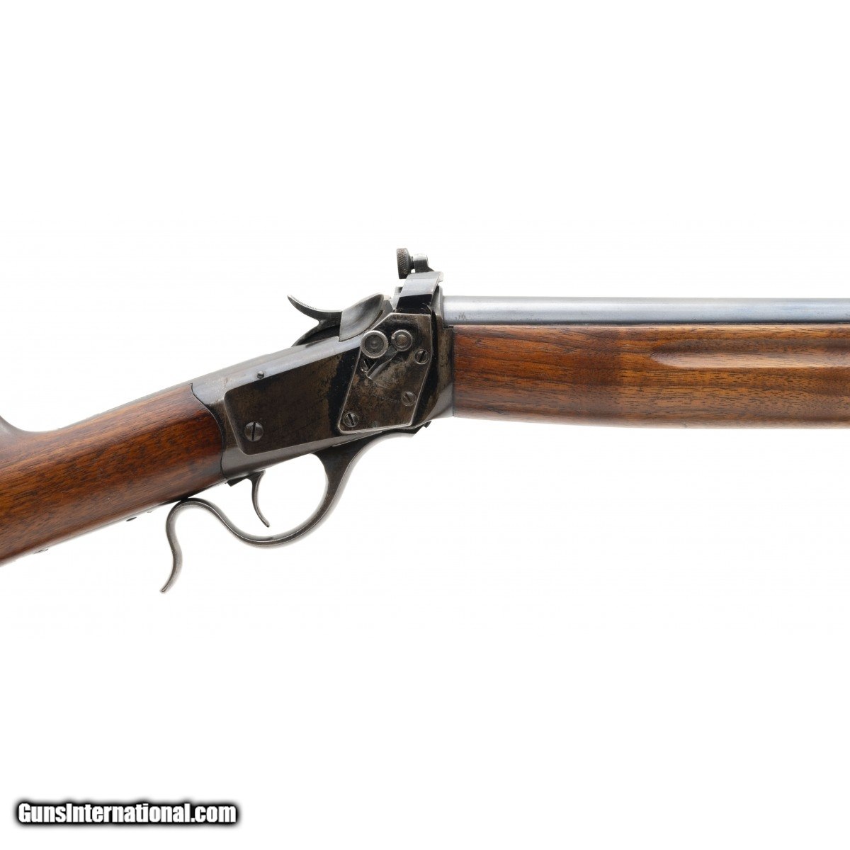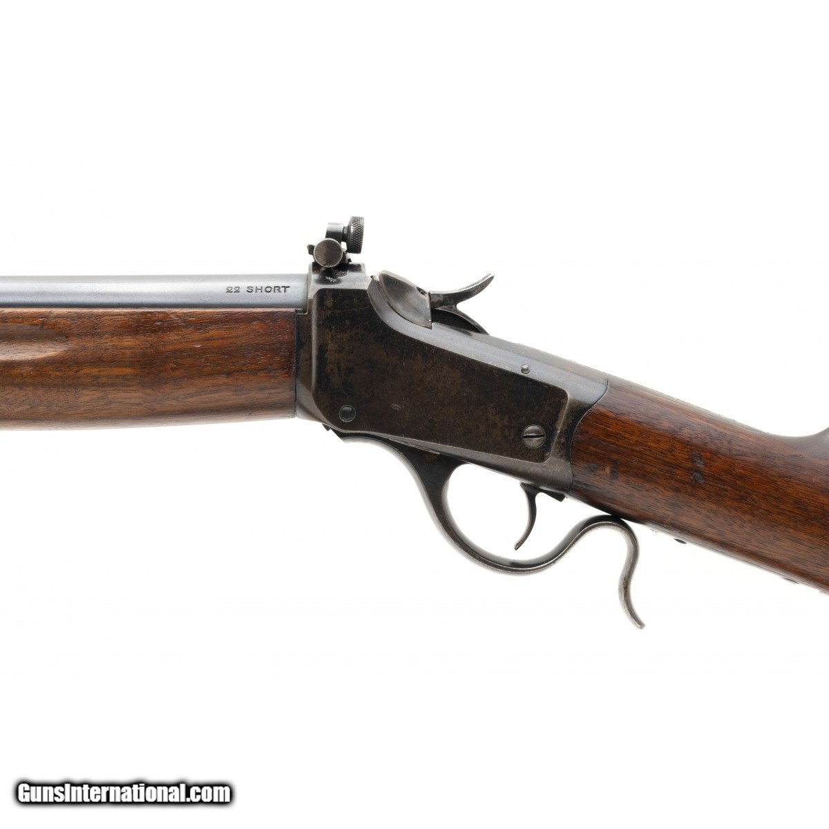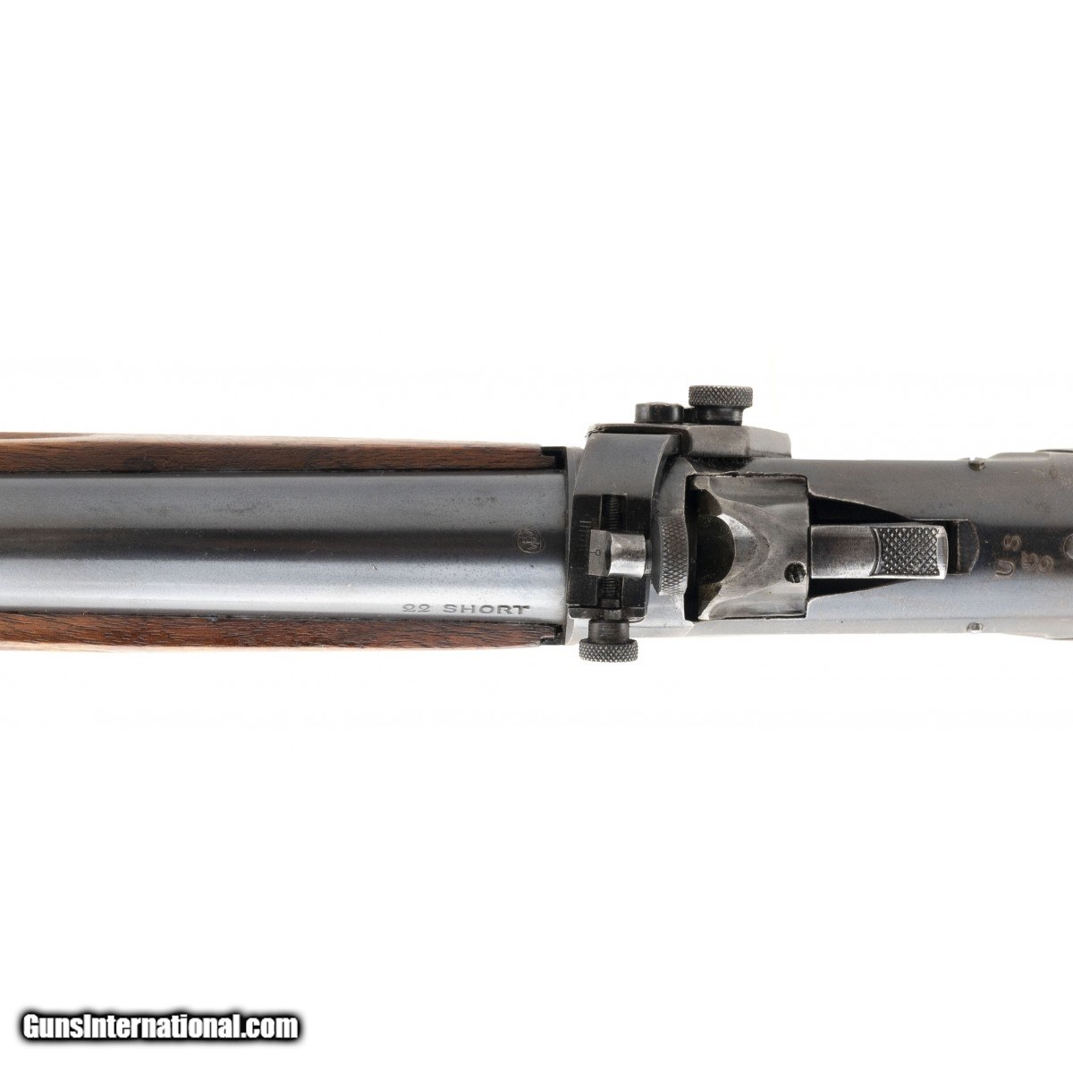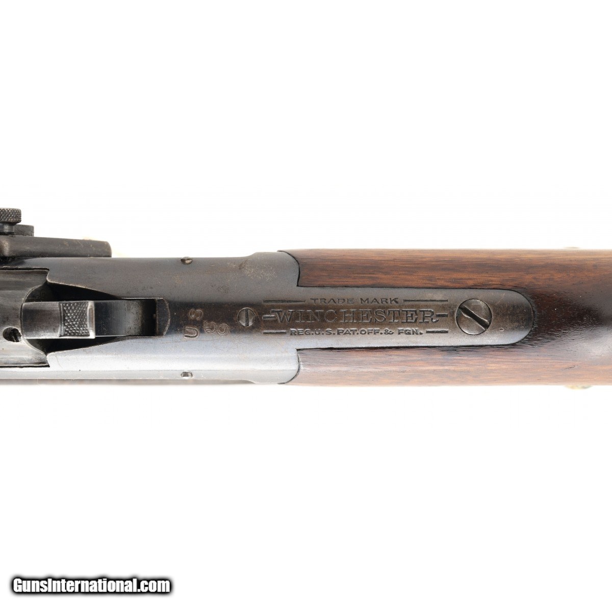 Winchester Winder Musket U.S. and ordnance bomb marked behind the hammer. The U.S. bought these for troop training during WWI. Rifle is in 22 short caliber. The bore is mirror bright with perfect rifling. The barrel has 98% factory blue. The action works perfectly. The buttstock has some light surface scuffs. Forend is perfect . No scuffs. Rifle comes with a vintage U.S. Model 1907 military sling. The frame has original blue that is flaking. No rust No pits no abuse, except for the light scuffs previously mentioned. In our experience this rates as very good plus!