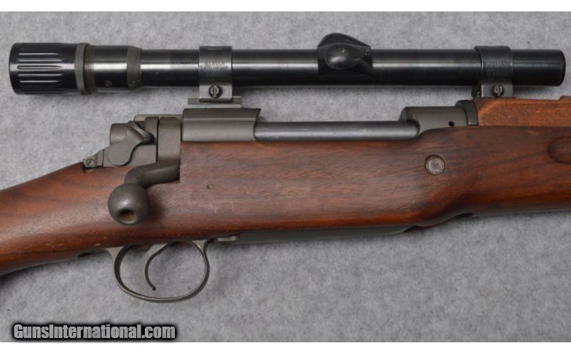 Description: This is a Winchester Model of 1917 “American Enfield” in .30-06 Spg. This rifle features a period correct scope marked Weaver V22. The barrel is marked W with a proof mark and dated 3-18. The barrel and receiver have the majority of the Parkerizing left on the metal. The walnut stock is very good with some minor handing and normal use marks. The bore of this rifle is bright with defined rifling. SOLD Curio/Relic: Yes Caliber Info: .30-06 Spg. Chambers: Bolt action repeater. Metal Condition: Very good. Wood Condition: Very good. Bore Condition: Bright with defined rifling. Barrels: 26" parkerized. Triggers: Serrated parkerized trigger. Stock: Smooth walnut with pistol grip. Stock Dimensions: 13-3/4" length of pull. Fore End: Matching smooth walnut with finger grooves. Butt Pad: Steel butt plate. Weight: 9 lb 9 oz. Sights: Weaver V22 scope. Item Location: West Chester, OH |