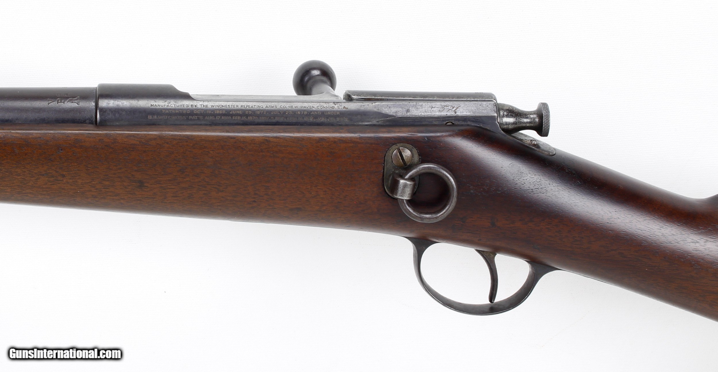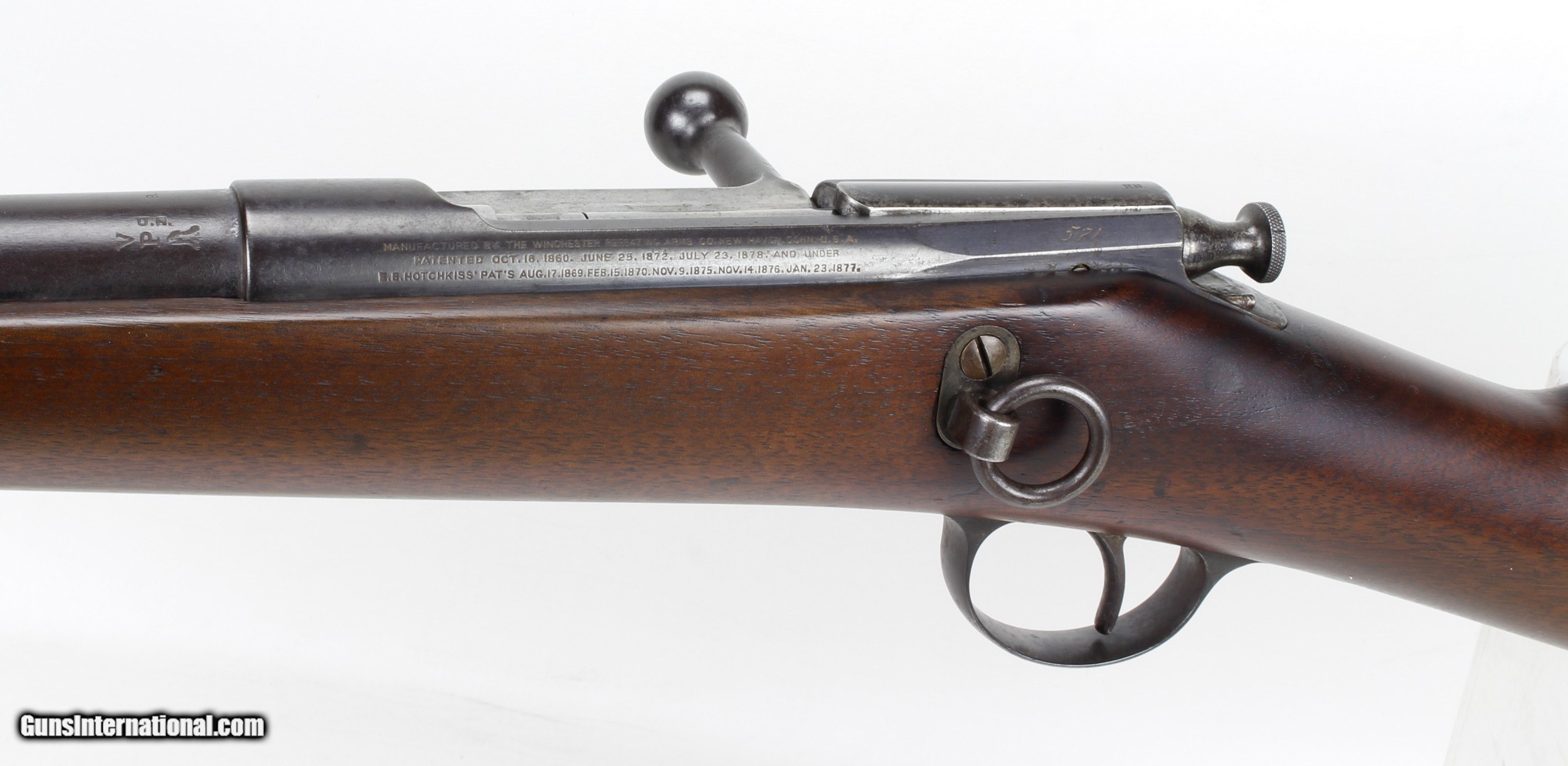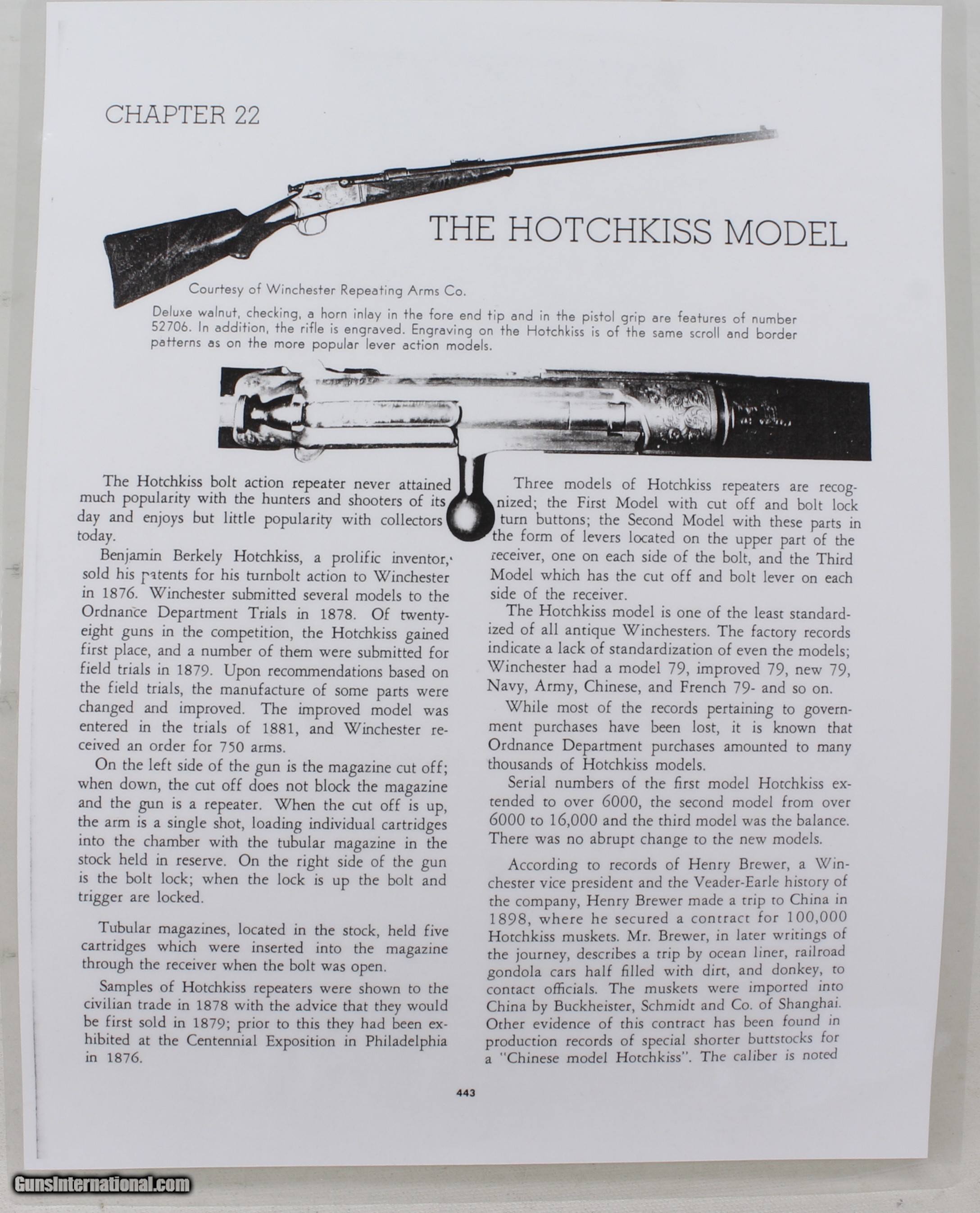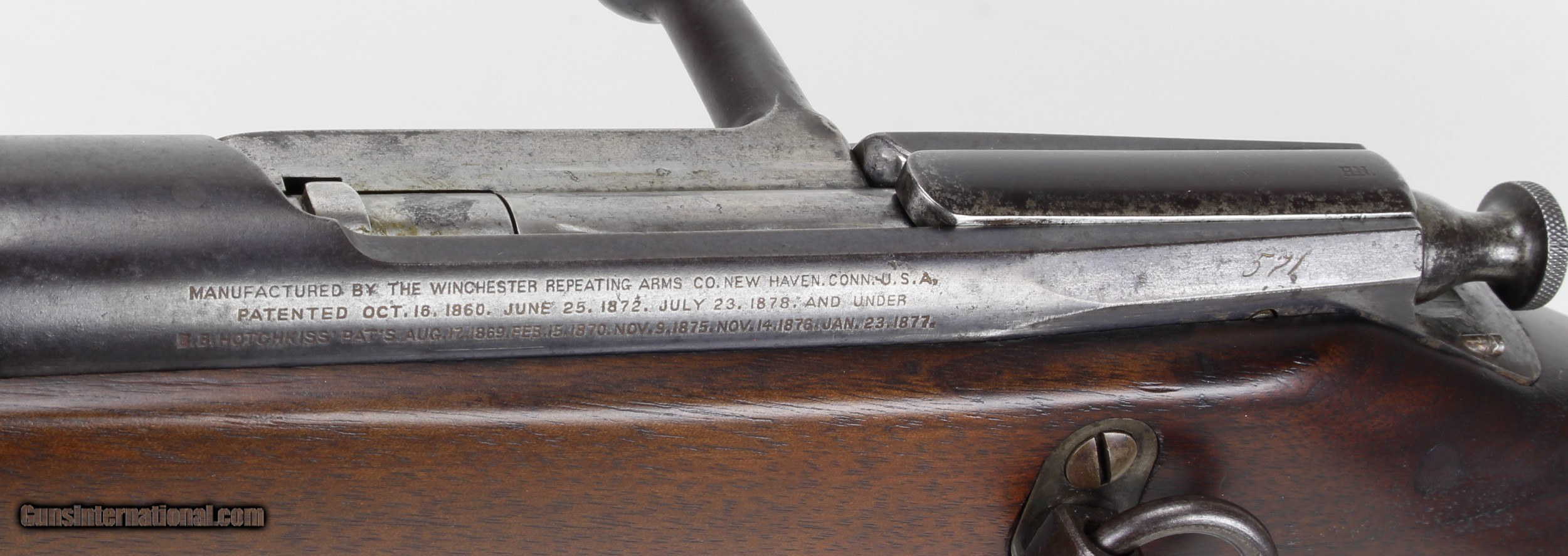 Description: WINCHESTER HOTCHKISS, SPORTING, 45-70, 24 1/4" Barrel, "Often Referred to as the: HOTCHKISS BOLT ACTION REPEATER". SN#1334, MFG: 1880/81, Wincester Letter, States gun was made as Musket, Converted to Sporter at Later Date. Located on Receiver Under the Wood on Left Side. This Gun Appears to have Military Marking on Barrel. The gun has a Nickel Plated Fore-End Cap W/Lever, to allow for storage of Cleaning Rod. The Stock has been Professionally Repaired, 2 1/2" Crack Left Side of Pistol Grip at Tang. Fine Mechanically, Fine Bore, Bright with Strong Rifling. Ships to Lower 48, w/Insurance: $60.00 More Pictures Available for Download. SOLD Antique: Yes Rifle Caliber: .45-70 Government |