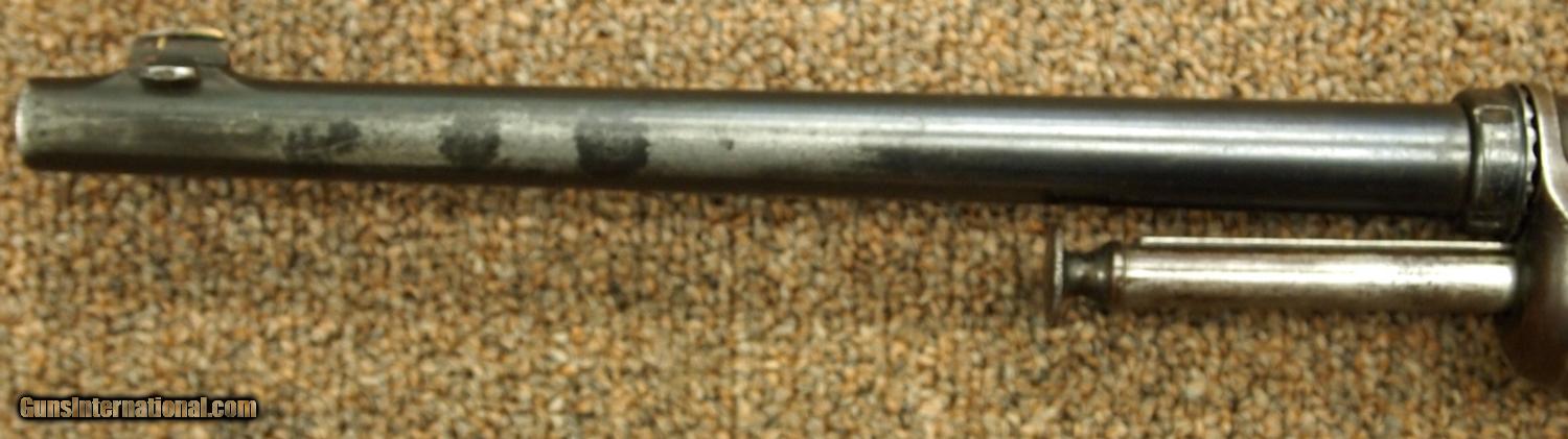 Description: Winchester M1907 (Mfg. 1909) .351 WIN., 20" barrel, clean shiny bore, stock is good with some handling marks, forearm shows lengthwise crack on right and left side (see pics), barrel shows some discoloration (see pics). with tooled scabbard. The Winchester Model 1907 is a blowback-operated, semi-automatic rifle produced by the Winchester Repeating Arms Company beginning in 1906 with production ending in 1958. It was fed from a 5 or 10-round capacity, detachable box magazine located immediately forward of the trigger guard. The only cartridge offered by Winchester as a factory chambering in the Model 1907 was the .351SL centerfire. The energy of this cartridge approximates the modern .357 Magnum when fired from a rifle. S&H $25.00 Add 3% for credit cards SOLD |
