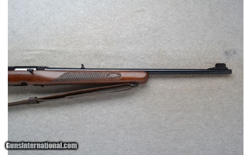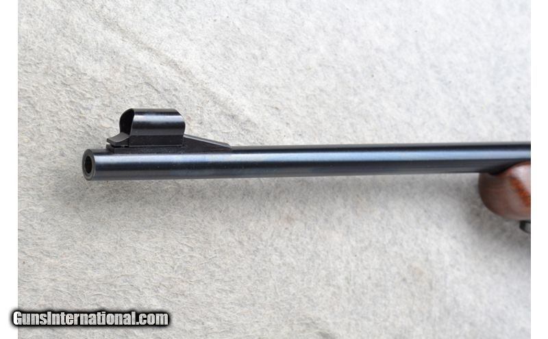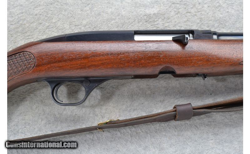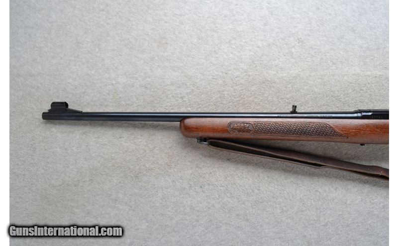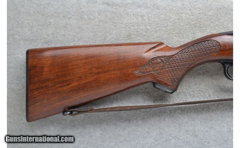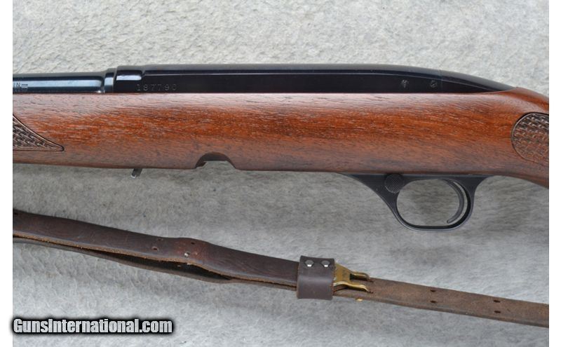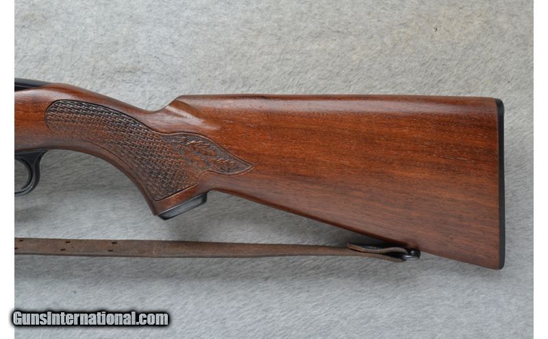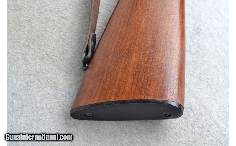 Description: This Winchester Model 100 is a right hand semi-auto rifle in .308 Win. Cal. It has a 22 inch barrel. A hooded front blade sight and a folding adjustable notch middle sight. It is drilled and tapped for a scope mount. The butt stock is a basket weave and oak leaf grip walnut pistol grip with a Winchester cap. The forearm is a basket weave and oak leaf grip walnut. It has a grooved trigger and comes with a leather sling. .308 Winchester SOLD Chambers: Semi-Auto 4 round detachable magazine. Metal Condition: Very good. A few minor marks on the barrel. Wood Condition: Very good. A little light wear. Bore Condition: Excellent. Barrels: 22 inch. Triggers: Grooved. Stock Dimensions: LOP 13 3/4 inches. Fore End: Basket weave and oak leaf checkered walnut. Butt Pad: Checkered black plate. Weight: 7 lb. 4 oz. Sights: Hooded front blade. Folding adjustable notch middle. Drilled and tapped. Item Location: Richfield, WI |