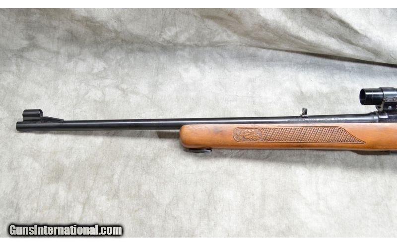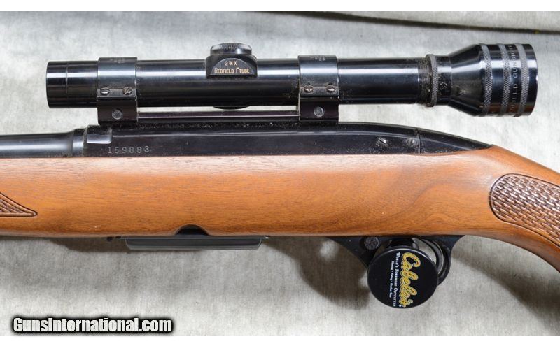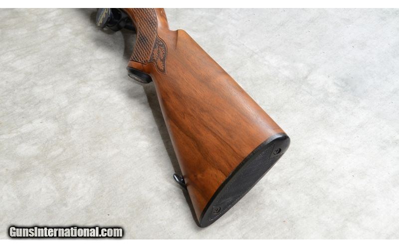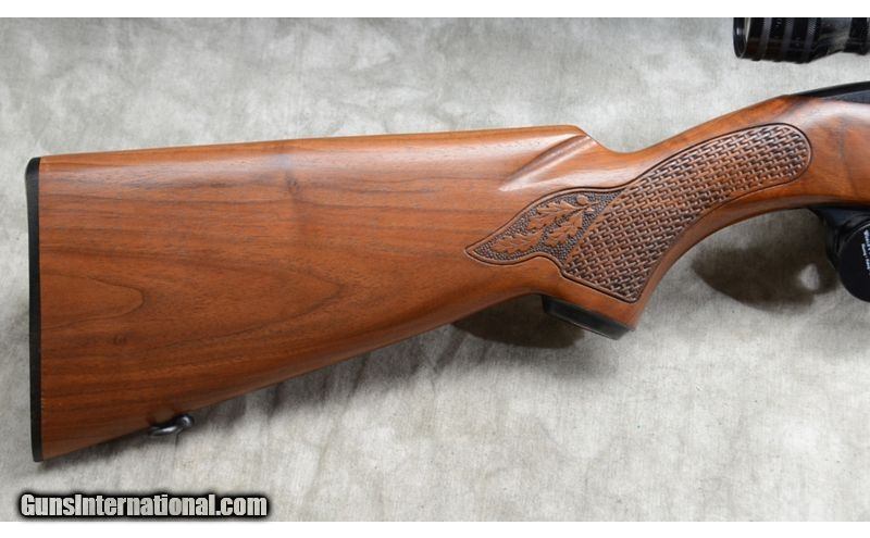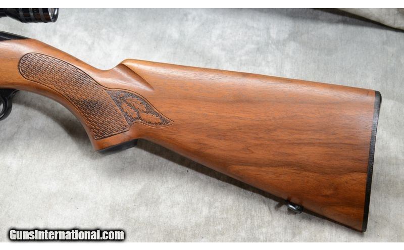 Description: This 1967 Winchester Model 100 features basket weave and oak leaf checkering on the nearly unblemished walnut stock. The hood on the front sight is intact and it is topped off with a Redfield fixed power scope. .308 Winchester SOLD Chambers: 4-round detachable magazine. Metal Condition: Excellent. Wood Condition: Excellent. Bore Condition: Bright and shiny. Barrels: 22 inch Triggers: Factory trigger. Stock Dimensions: 13-3/4 inch LOP. Butt Pad: Black plate. Weight: 8 lb - 2 oz Sights: Hooded bead and folding leaf open sights. Outfitted with Redfield fixed 2-3/4 X scope. Item Location: Rogers |