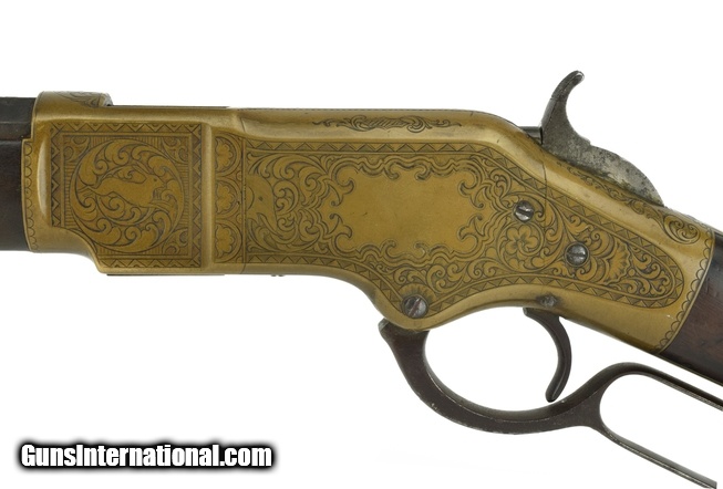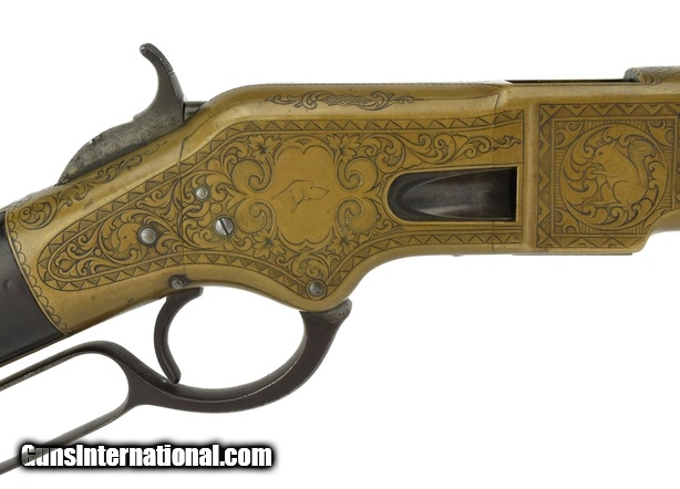 Factory Engraved Winchester 1866 Rifle. Made in 1870. .44 Rimfire. This is an untouched factory engraved 1866 done by one of the Ulrich family members, who were factory engravers for Winchester. This gun has classic scroll work with geometric patterns. There are several animal heads in the engraving. The wood is a grade fancier than you typically see. The barrel has nice even brown patina. The rear sight was remounted through the barrel address. Very fine factory engraved gun!