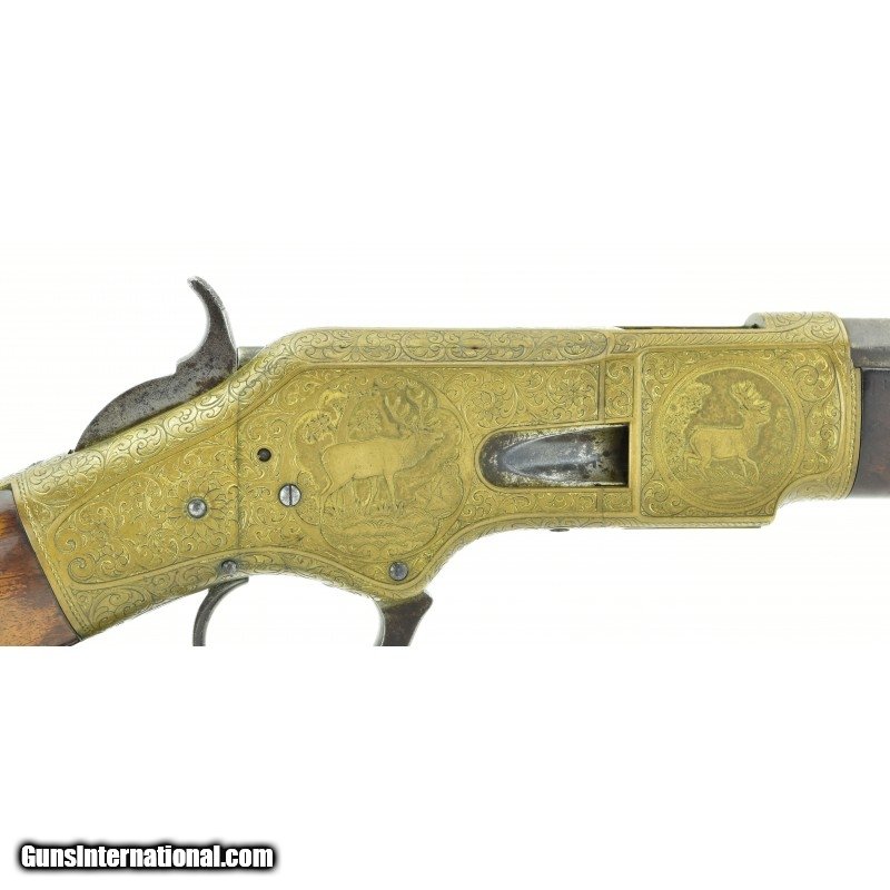 Beautiful factory engraved High Relief Winchester 1866 Ulrich signed. Made in 1872. Absolutely beautiful Winchester high relief 1866. Barrel is 24" long, and has a brown patina with light pitting. Frame is elaborately engraved in high relief with tight deluxe scrolls. Left-hand side has two panels with two deer and right-hand side has two panels with an elk and deer. Wood is good. Forearm is original to gun. Butt stock is well made period replacement. This is not uncommon, fifteen out of twenty known high relief guns in existence have replacement butt stocks. This is due to Winchester using the finest wood which broke easily. Gun is signed by John Ulrich (one of Winchester best engravers and would only sign his finest work). These high relief guns regularly trade in the six figures. Recently one sold in 2018 at an for over $500,000. This gun is lacking in condition compared to some, but is certainly worth the money and will not cost you an arm and a leg. Beautiful factory engraved high relief Winchester 1866.