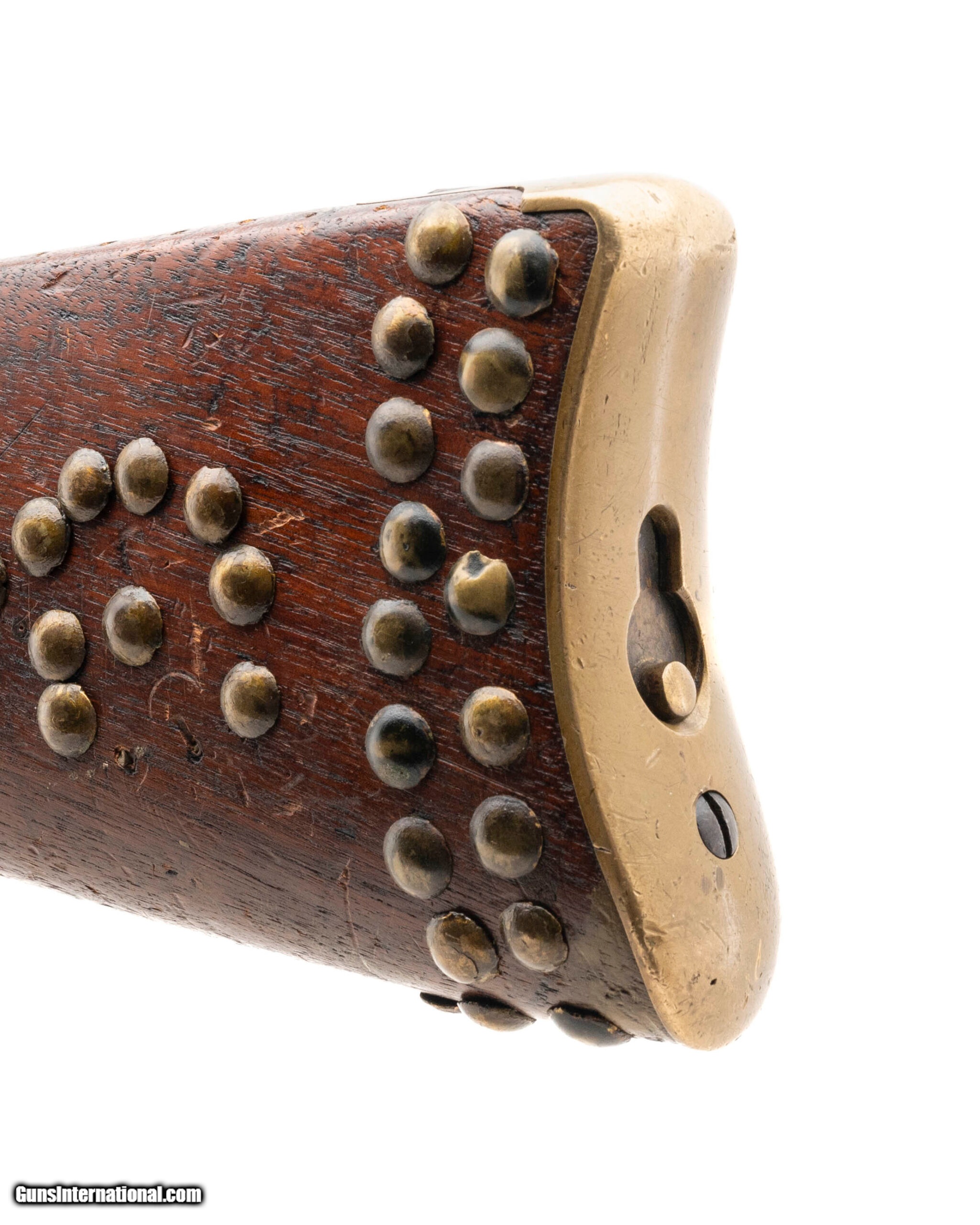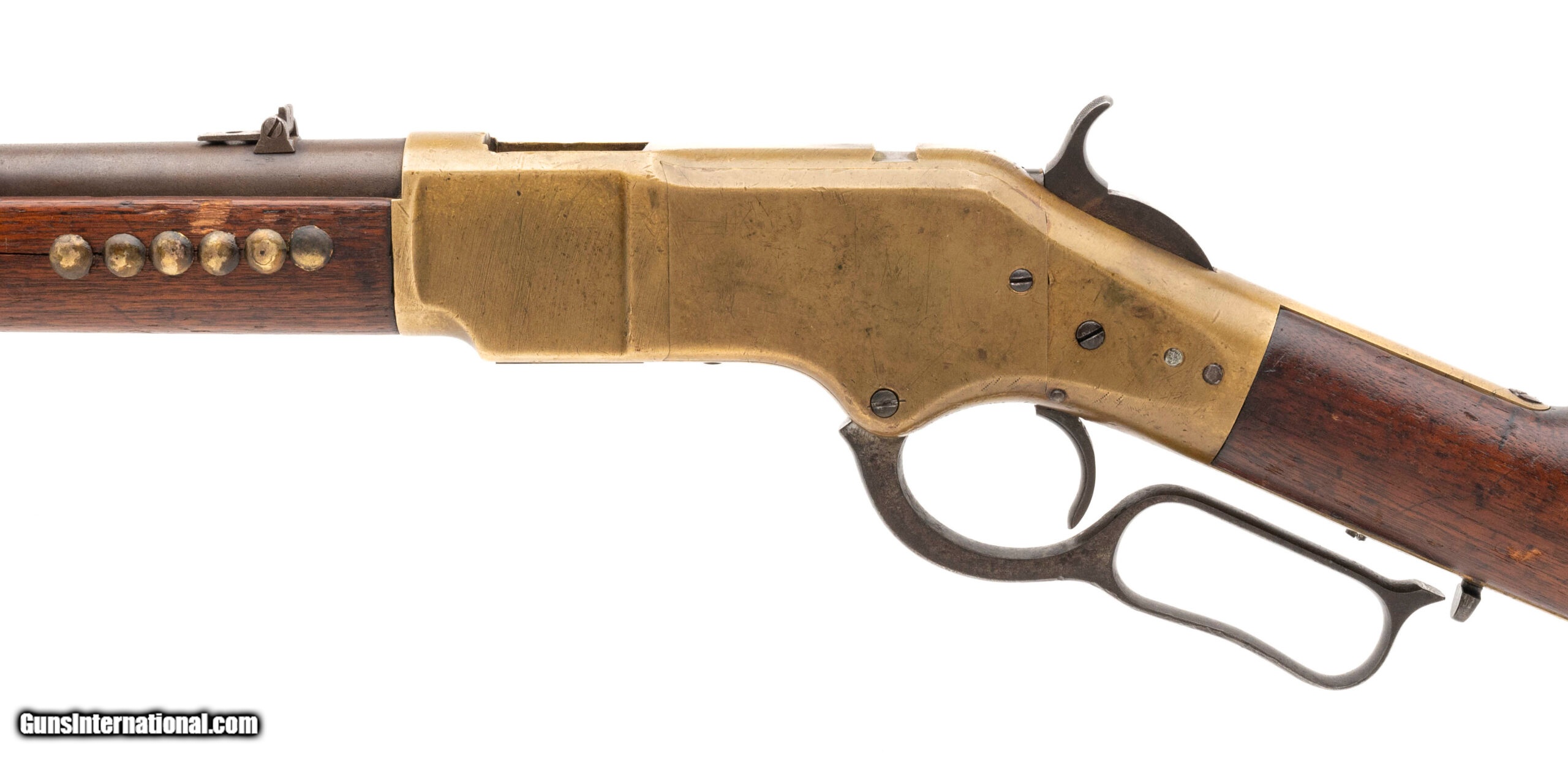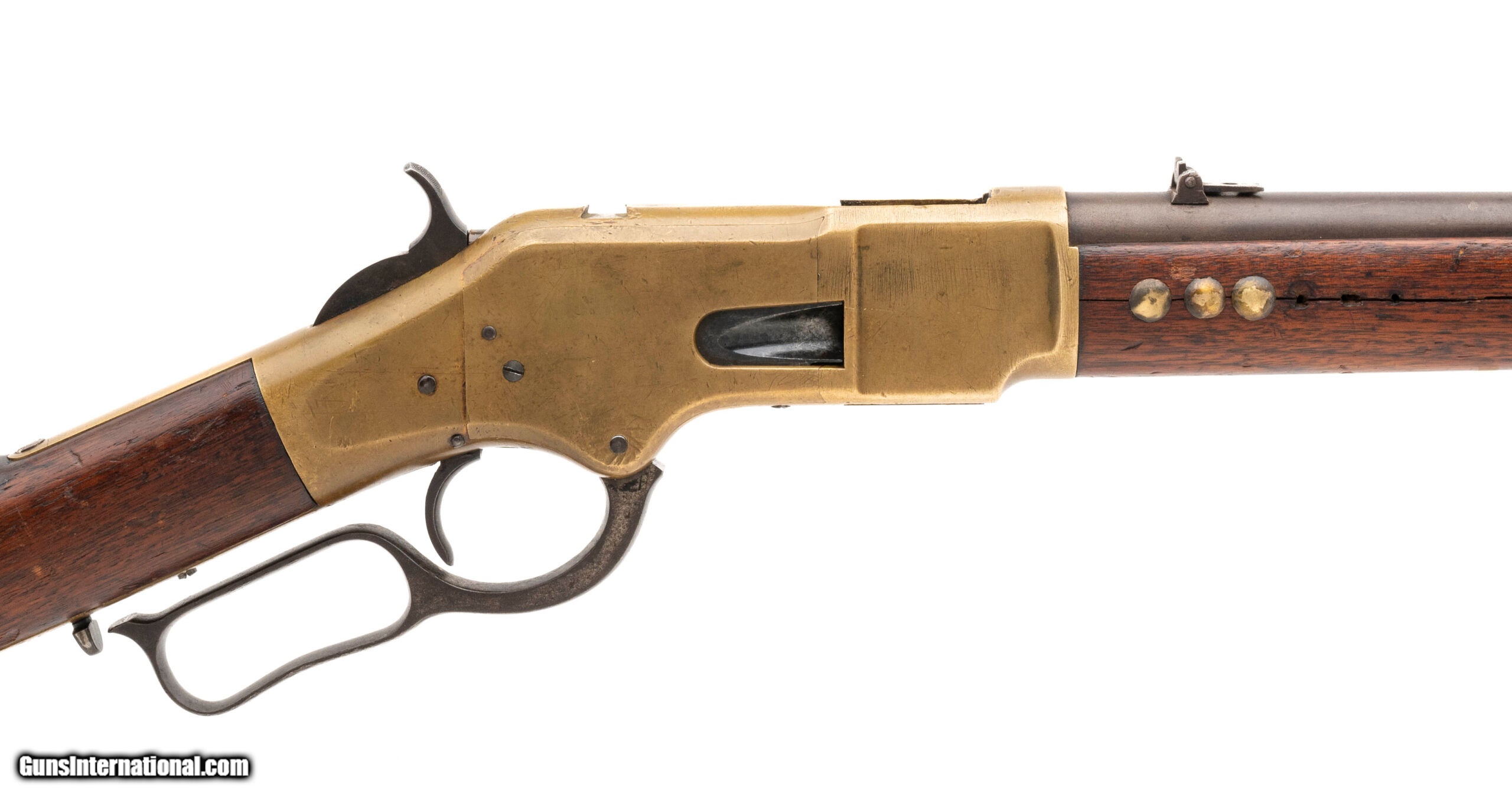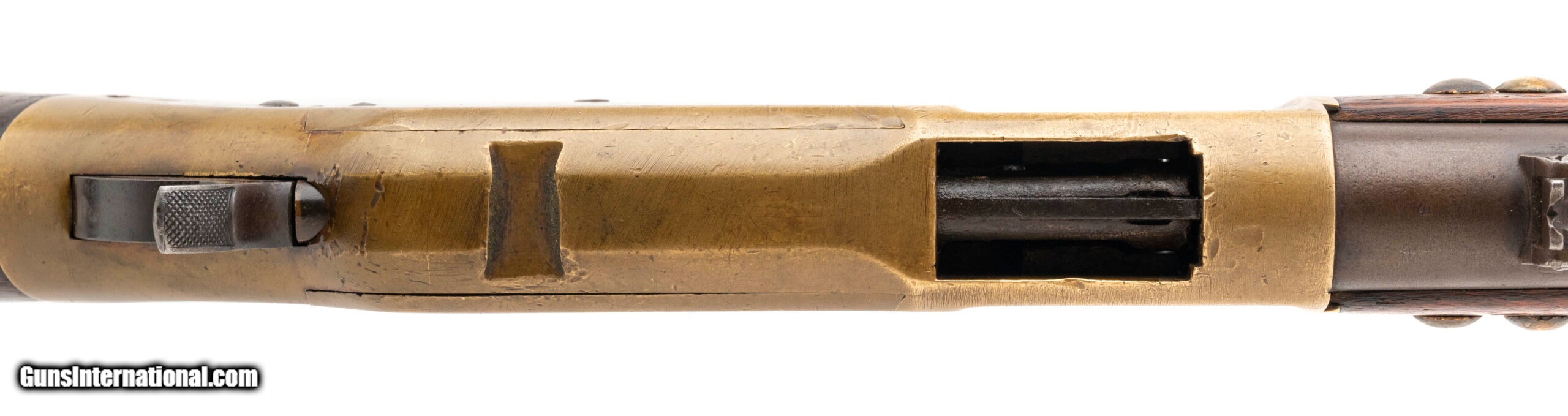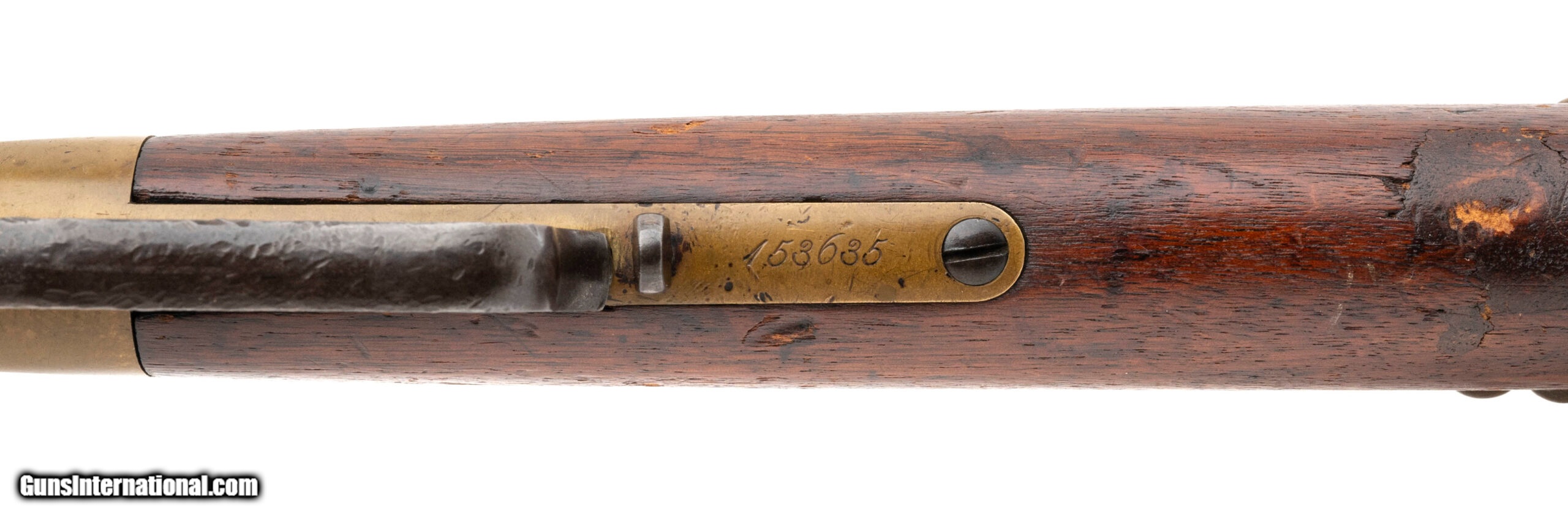 Description: "Serial number 153635. Made in 1880. 44 RF caliber with a 20" barrel. Nice sharp gun with period tacks. The barrel has a brownish gray patina. The frame has a sight notch added. SOLD Antique: Yes |