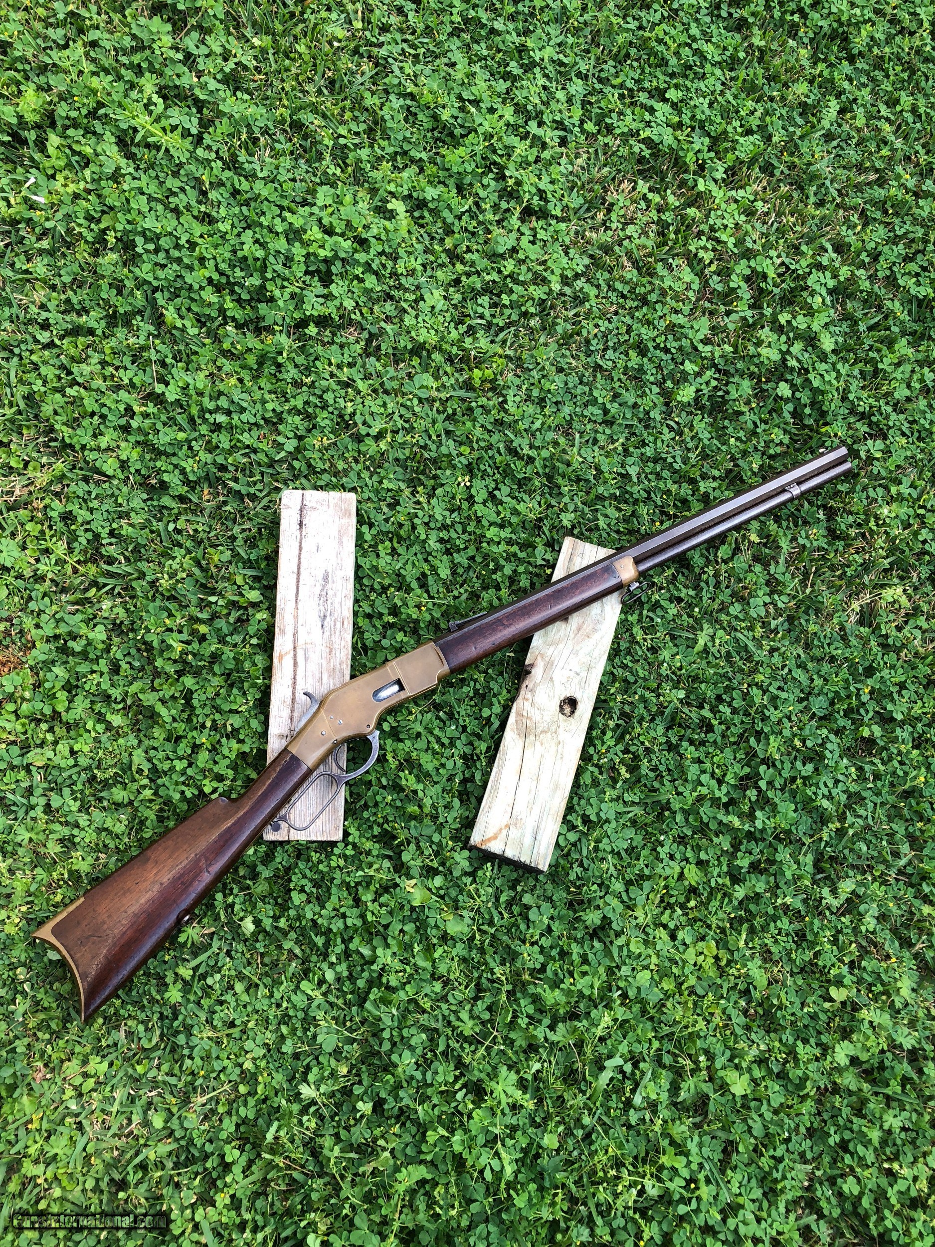 Description: A nice uncleaned rifle serial #12x,xxx. with minor dents in stock and frame. Smooth brown patina and a slot cut in rear of frame for a sight. Don't know if Winchester or a professional gunsmith did this. A very good and nice Winchester rifle. The screw in the bottom of side plate won't stay in place as front sideplate most likely stripped. Action is excellent.The caliber is 44-40 with a good bore and 24" barrel. Side plates are tight. SOLD Antique: Yes |