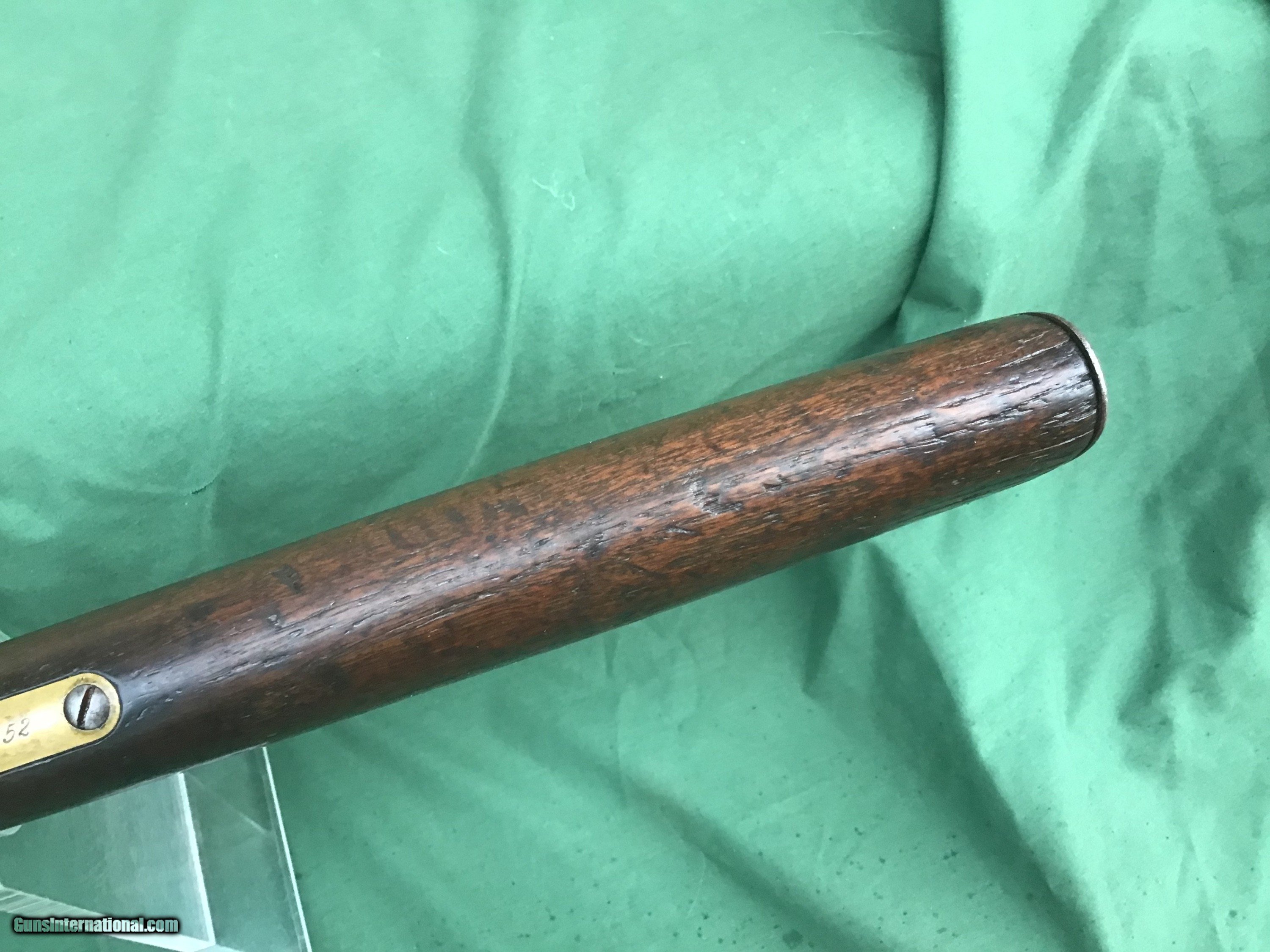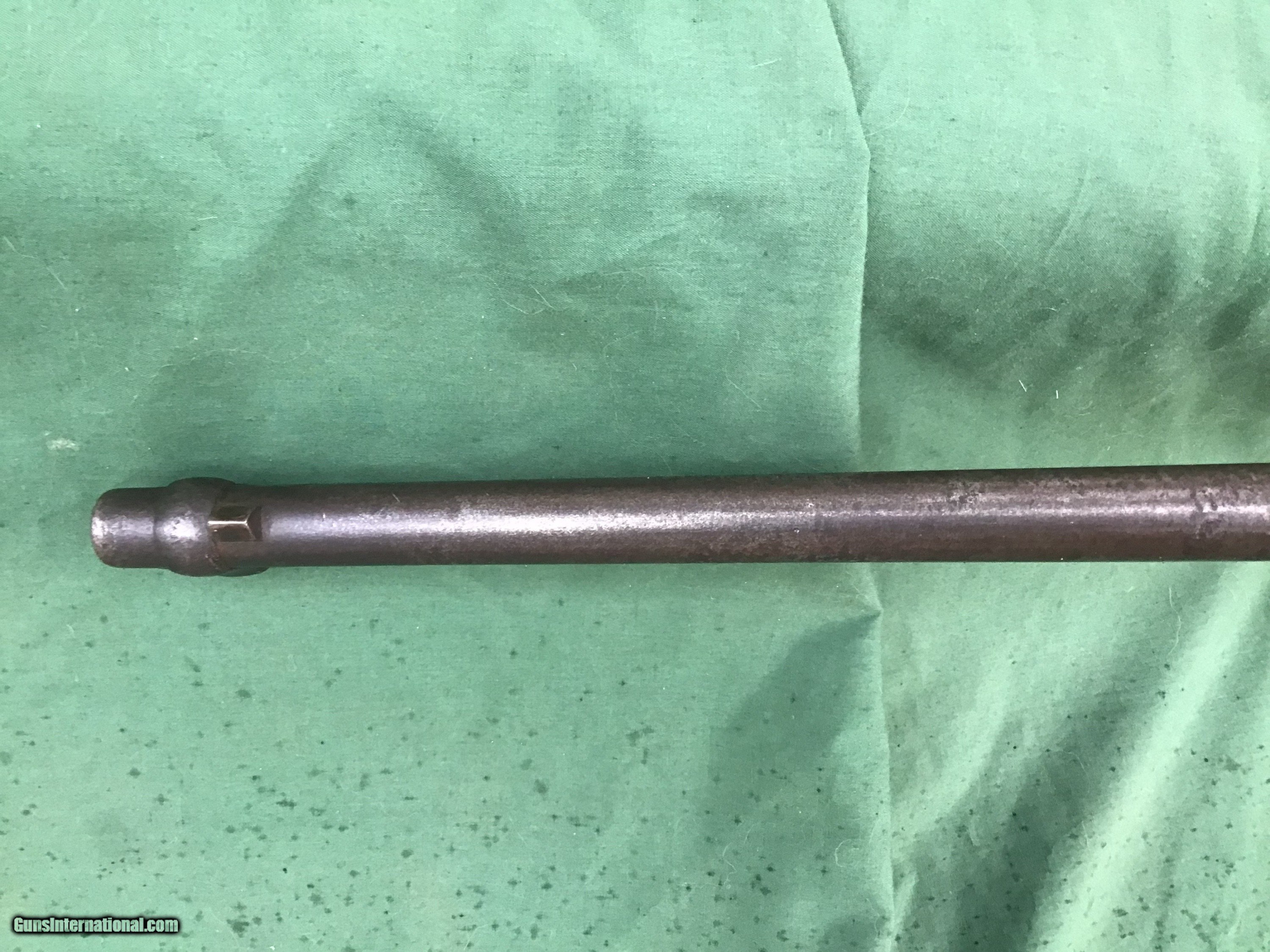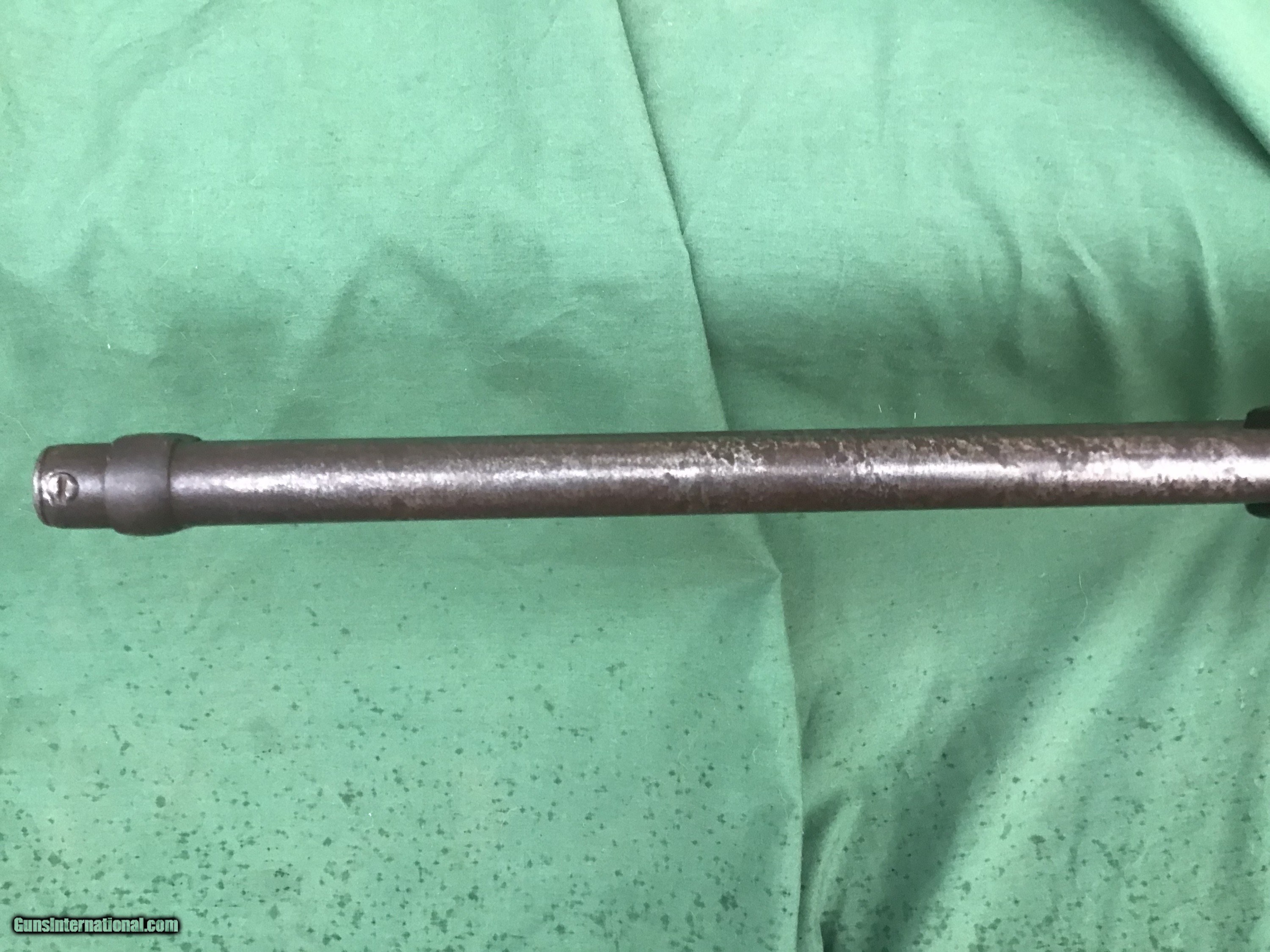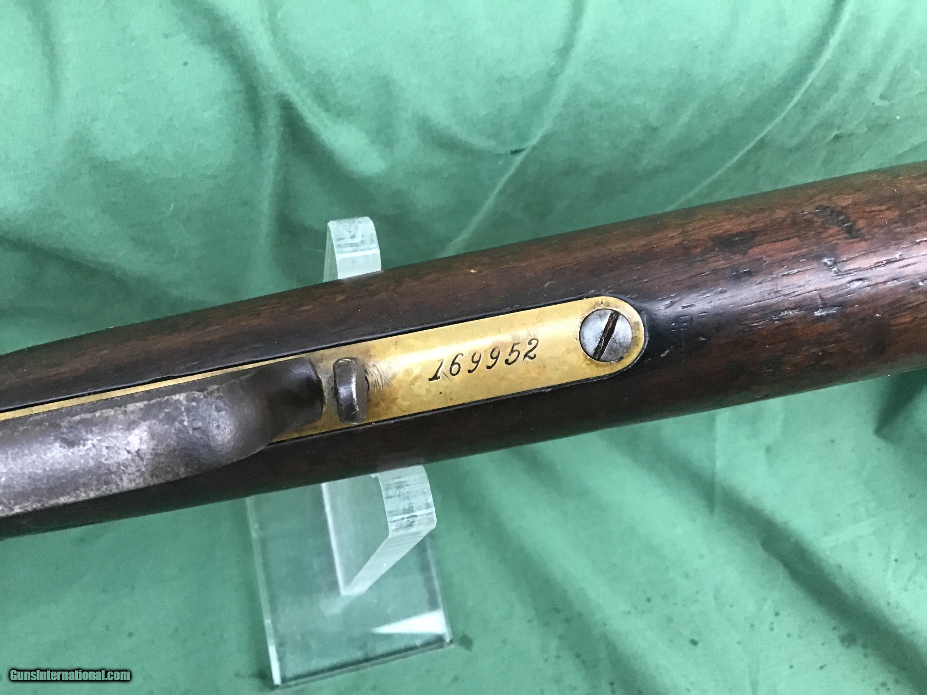 Description: Very late 1866 Winchester Saddle Ring Carbine manufactured in 1891. This carbine left the factory as a Centerfire in 44-40. 20" barrel and full magazine tube retain no original blue just a gray / brown patina and areas of pitting. I will rate the bore a 5 on a scale from 1 to 10. Barrel address is still very legible. Nice earlier rear carbine sight. Brass receiver shows it's age with a nice patina. Action functions nicely. Both forend and buttstock are in good condition showing the normal handling marks that you would expect to see from a firearm of this age. Assembly numbers match tang and buttstock. All in all a good used late Centerfire 1866 Winchester SRC. It's getting harder and harder to find 66 Rifles or Carbines so don't miss out on this one. Please feel free to ask questions. SOLD Antique: Yes |