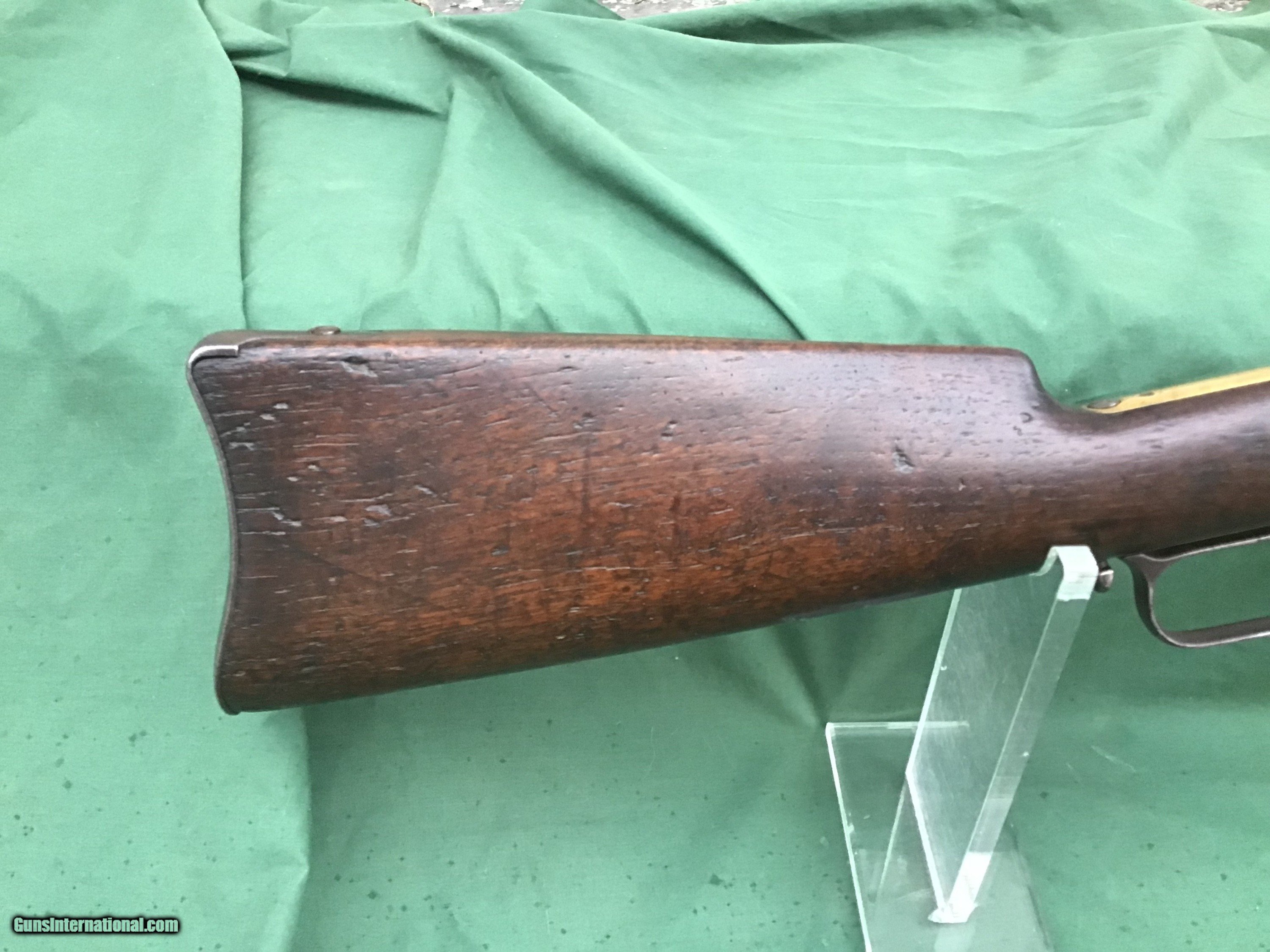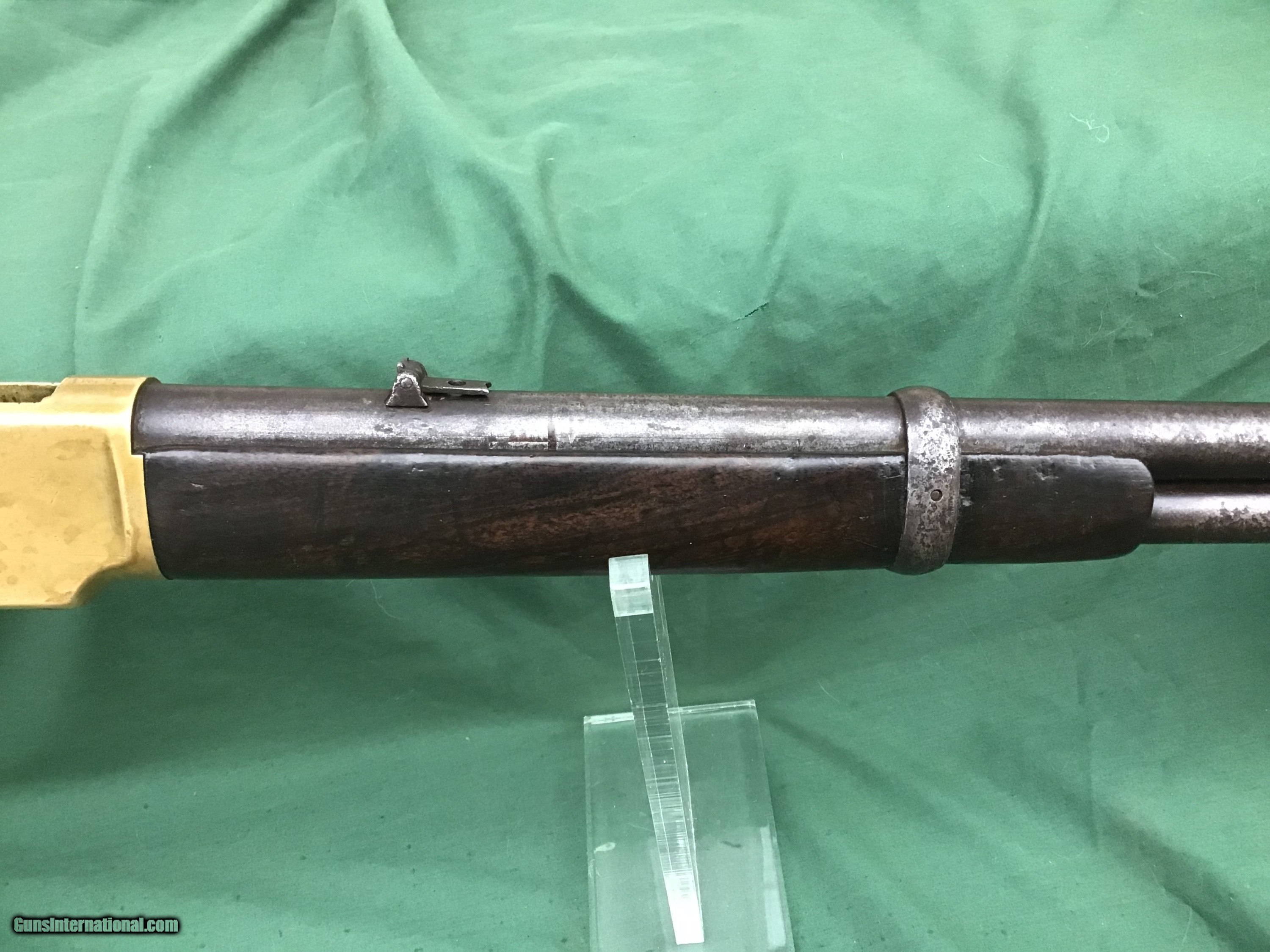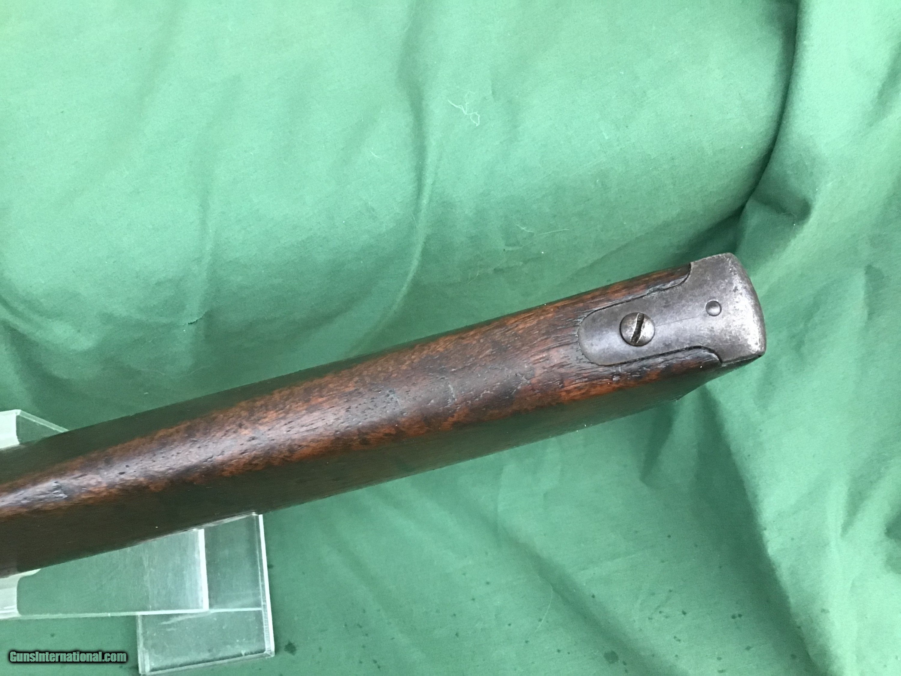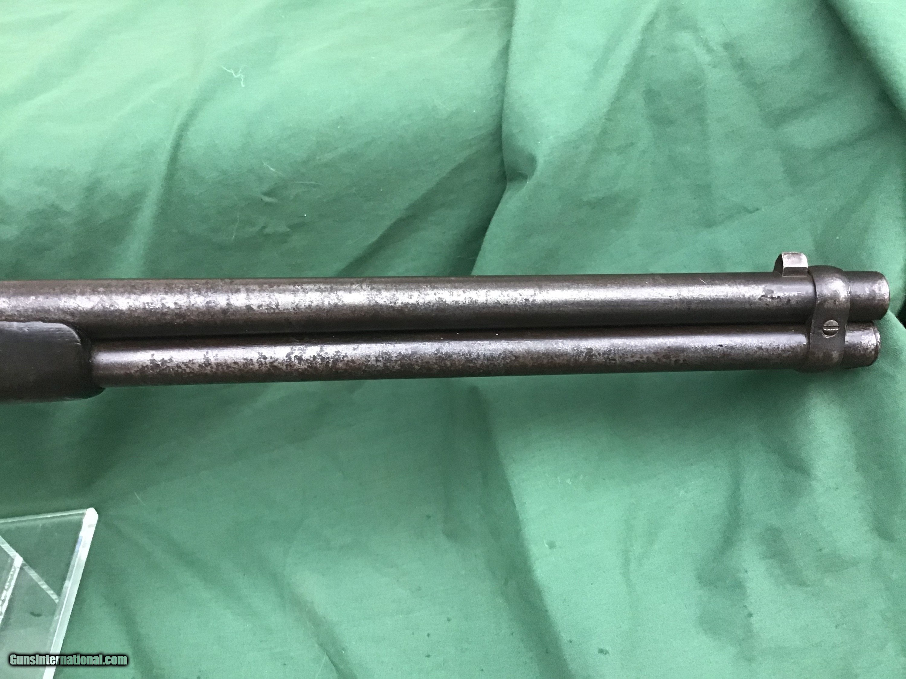 Description: Very late 1866 Winchester Saddle Ring Carbine manufactured in 1891. This carbine left the factory as a Centerfire in 44-40. 20" barrel and full magazine tube retain no original blue just a gray / brown patina and areas of pitting. I will rate the bore a 5 on a scale from 1 to 10. Barrel address is still very legible. Nice earlier rear carbine sight. Brass receiver shows it's age with a nice patina. Action functions nicely. Both forend and buttstock are in good condition showing the normal handling marks that you would expect to see from a firearm of this age. Assembly numbers match tang and buttstock. All in all a good used late Centerfire 1866 Winchester SRC. It's getting harder and harder to find 66 Rifles or Carbines so don't miss out on this one. Please feel free to ask questions. SOLD Antique: Yes |